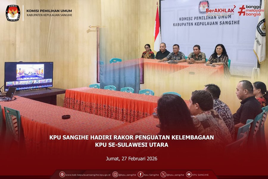 Tahuna, kab-kepulauansangihe.kpu.go.id — Komisi Pemilihan Umum (KPU) Kabupaten Kepulauan Sangihe menghadiri Rapat Koordinasi Penguatan Kelembagaan KPU Kabupaten/Kota se-Sulawesi Utara yang diselenggarakan oleh KPU Provinsi Sulawesi Utara secara daring pada Jumat (27/2/2026). Kegiatan ini diikuti oleh Sekretaris dan Kepala Sub Bagian KPU Kabupaten/Kota se-Sulawesi Utara. Dari KPU Sangihe, rapat diikuti secara daring dari ruang rapat KPU Sangihe oleh Sekretaris bersama para Kepala Sub Bagian. Rapat koordinasi ini menjadi momentum penting dalam memperkuat koordinasi dan konsolidasi antar satuan kerja, khususnya dalam mendukung pelaksanaan tugas dan fungsi kelembagaan KPU secara efektif, efisien, dan akuntabel. Penguatan kelembagaan dipandang sebagai fondasi utama dalam menjaga kualitas layanan administrasi, tata kelola organisasi, serta dukungan teknis terhadap tahapan kepemiluan. Dalam rapat tersebut dibahas sejumlah hal strategis, di antaranya pentingnya efisiensi dengan memaksimalkan penggunaan anggaran secara tepat sasaran dan sesuai ketentuan. Setiap satuan kerja didorong untuk merencanakan dan merealisasikan anggaran secara cermat, transparan, serta berorientasi pada kinerja. Selain itu, penguatan sistem arsip digital turut menjadi perhatian utama. Pengelolaan arsip berbasis digital dinilai sangat penting guna memastikan ketersediaan informasi yang tertata, mudah diakses, serta mendukung prinsip keterbukaan informasi publik. Hal ini juga berkaitan dengan optimalisasi peran Pejabat Pengelola Informasi dan Dokumentasi (PPID) di setiap satuan kerja, dengan memastikan seluruh permohonan informasi terdokumentasi dan terdigitalisasi secara baik. Rapat juga menekankan pentingnya soliditas dan sinergi antara Sekretaris dan para Kepala Sub Bagian sebagai unsur pimpinan sekretariat. Pembagian tugas yang jelas, penguatan tanggung jawab masing-masing pegawai, serta pengelolaan sumber daya manusia yang profesional dan berintegritas menjadi kunci dalam membangun organisasi yang kuat dan responsif. Melalui kegiatan ini, KPU Sangihe berkomitmen untuk terus meningkatkan kualitas tata kelola kelembagaan, memperkuat koordinasi internal, serta menghadirkan pelayanan yang transparan dan akuntabel dalam mendukung penyelenggaraan Pemilu dan Pemilihan yang demokratis di Kabupaten Kepulauan Sangihe. ....