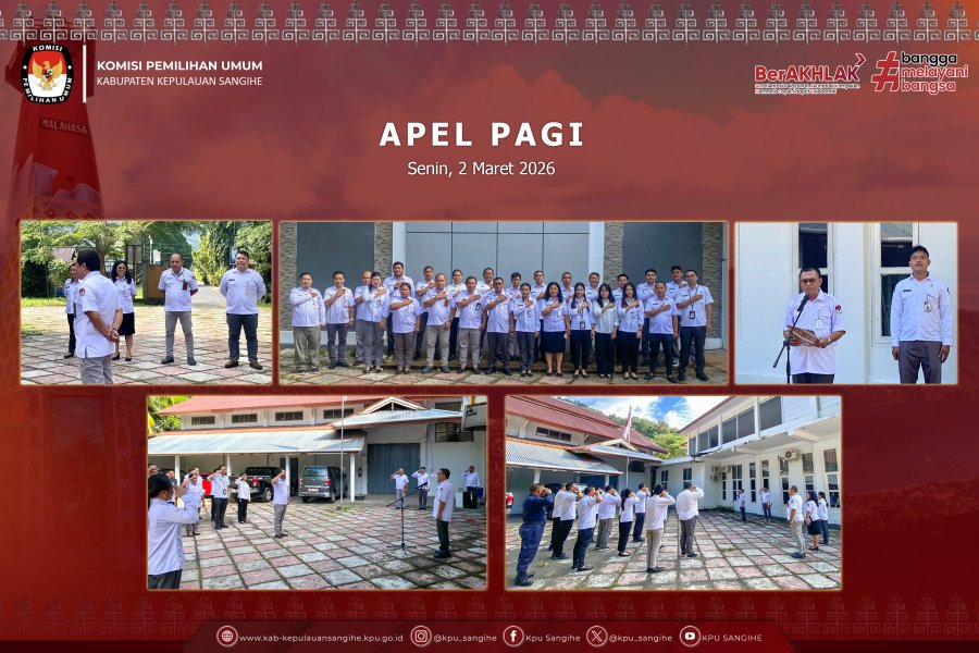 Tahuna, kab-kepulauansangihe.kpu.go.id – Komisi Pemilihan Umum (KPU) Kabupaten Kepulauan Sangihe melaksanakan apel pagi rutin setiap hari Senin yang bertempat di halaman kantor KPU Sangihe, Senin (2/3/2026). Kegiatan ini menjadi bagian dari upaya penguatan kedisiplinan serta peningkatan kinerja jajaran sekretariat dalam mendukung pelaksanaan tugas dan fungsi kelembagaan. Apel pagi dipimpin oleh Kepala Sub Bagian Keuangan, Umum dan Logistik, Bapak Aden Ladi, dengan pembina apel Sekretaris KPU Sangihe, Bapak Fikri Tjikoa. Kegiatan diikuti oleh seluruh jajaran sekretariat KPU Sangihe. Dalam amanatnya, Sekretaris KPU Sangihe menekankan pentingnya peningkatan disiplin, profesionalitas, dan loyalitas dalam pelaksanaan tugas sehari-hari. Ia mengingatkan bahwa sebagai bagian dari lembaga penyelenggara pemilu, jajaran sekretariat memiliki peran strategis dalam memberikan dukungan administratif dan teknis terhadap pelaksanaan program dan kegiatan KPU. Lebih lanjut, Fikri menyampaikan agar kerja sama dan kolaborasi antar sub bagian dapat terus terjalin dengan baik, sehingga setiap program kerja dapat dilaksanakan secara efektif dan tepat waktu. Ia juga menegaskan pentingnya koordinasi berjenjang antara staf dengan pimpinan langsung, khususnya Kepala Sub Bagian, dalam mendukung serta melaksanakan setiap program kerja pimpinan. Selain itu, seluruh jajaran diharapkan responsif dan proaktif dalam menindaklanjuti setiap permintaan dan arahan, baik dari Komisi Pemilihan Umum Republik Indonesia maupun Komisi Pemilihan Umum Provinsi Sulawesi Utara, dengan tetap memperhatikan mekanisme dan tata kelola administrasi secara berjenjang. Pelaksanaan apel pagi rutin ini merupakan wujud komitmen KPU Sangihe dalam membangun budaya kerja yang tertib, akuntabel, dan berintegritas. Melalui kegiatan ini, diharapkan seluruh jajaran sekretariat semakin solid dalam mendukung tugas-tugas kelembagaan serta menjaga kepercayaan publik terhadap penyelenggaraan pemilu yang profesional dan berintegritas. ....