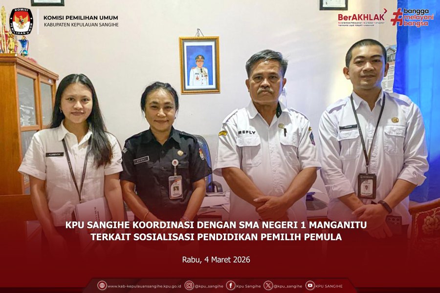 Manganitu, kab.kepulauansangihe.kpu.go.id — Komisi Pemilihan Umum (KPU) Kabupaten Kepulauan Sangihe melakukan koordinasi dengan SMA Negeri 1 Manganitu dalam rangka persiapan pelaksanaan kegiatan Sosialisasi Pendidikan Pemilih Pemula, pada Rabu (4/3/2026). Koordinasi tersebut dipimpin oleh Kepala Sub Bagian Partisipasi Hubungan Masyarakat dan Sumber Daya Manusia (Parhumas dan SDM) KPU Sangihe, Ibu Merry Malendes, yang didampingi oleh dua orang Staf Sub Bagian Parhumas dan SDM. Rombongan KPU Sangihe diterima langsung oleh Kepala Sekolah SMA Negeri 1 Manganitu, Bapak Refly Badoa, S.Pd. Pertemuan berlangsung dalam suasana yang baik dan penuh semangat kolaborasi. Beberapa hal yang dibahas antara lain kesiapan pihak sekolah dalam mendukung pelaksanaan kegiatan, termasuk penentuan waktu pelaksanaan Sosialisasi Pendidikan Pemilih Pemula. Dalam pertemuan tersebut, telah diperoleh konfirmasi bahwa kegiatan akan dilaksanakan pada Kamis, 12 Maret 2026. Pihak sekolah menyambut baik rencana pelaksanaan kegiatan ini, mengingat pentingnya pendidikan pemilih bagi para siswa sebagai pemilih pemula. Sosialisasi ini diharapkan dapat menambah wawasan dan pemahaman siswa mengenai demokrasi serta membentuk karakter yang bertanggung jawab sebagai pelaku demokrasi di masa mendatang. Pihak sekolah juga menyampaikan komitmennya untuk mengoordinasikan lebih lanjut teknis pelaksanaan serta pemberitahuan resmi terkait waktu kegiatan kepada KPU Sangihe. Sebagai bentuk kebersamaan dan sinergi antara KPU Sangihe dan pihak sekolah, kegiatan koordinasi ditutup dengan sesi foto bersama. Melalui kegiatan ini, KPU Sangihe terus berupaya memperkuat pendidikan demokrasi sejak dini guna mewujudkan pemilih yang cerdas, kritis, dan berintegritas. ....