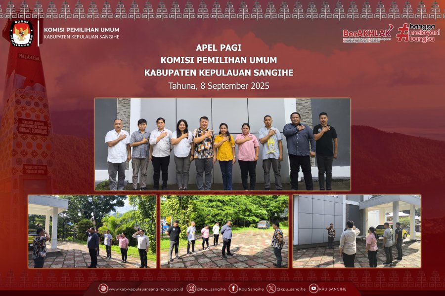 Tahuna, kab-kepulauansangihe.kpu.go.id — Komisi Pemilihan Umum (KPU) Kabupaten Kepulauan Sangihe melaksanakan Apel Pagi pada Senin, 8 September 2025 yang digelar di Halaman Kantor KPU Sangihe. Kegiatan rutin yang dilaksanakan setiap hari Senin.