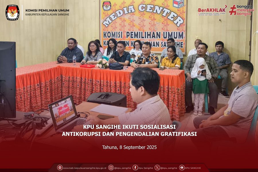 Tahuna, kab-kepulauansangihe.kpu.go.id - KPU Sangihe mengikuti Sosialisasi Antikorupsi dan pengendalian Gratifikasi yang diselenggarakan secara daring oleh Komisi Pemilihan Umum (KPU ) yang diikuti oleh seluruh satuan kerja KPU, KPU Provinsi/KIP Aceh dan KPU/KIP Kabupaten/Kota, Senin (8/9/2025).