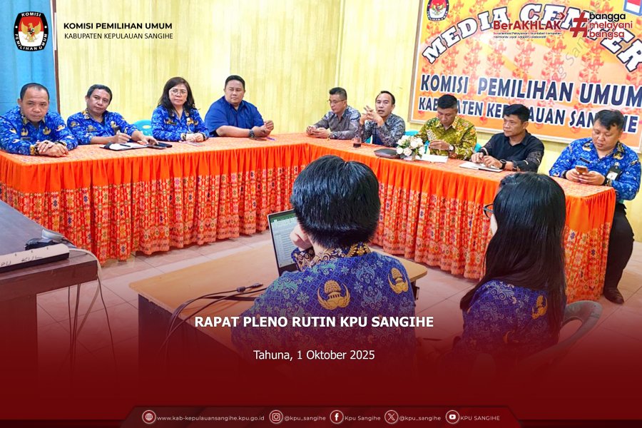 Tahuna, kab-kepulauansangihe.kpu.go.id – Komisi Pemilihan Umum (KPU) Kabupaten Kepulauan Sangihe melaksanakan Rapat Pleno Rutin pada Rabu, 1 Oktober 2025. Rapat berlangsung di Ruang Rapat KPU Sangihe dan dipimpin langsung oleh Ketua KPU Sangihe serta dihadiri oleh Anggota KPU, Plt. Sekretaris, Para Kepala Sub Bagian, dan Pejabat Fungsional.