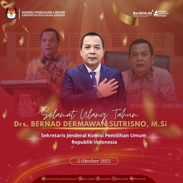 Tahuna, kab-kepulauansangihe.kpu.go.id - Segenap jajaran KPU Sangihe mengucapkan Selamat Ulang Tahun kepada Sekretaris Jenderal KPU RI, Bapak Drs. Bernad Dermawan Sutrisno, M.Si. ✨️