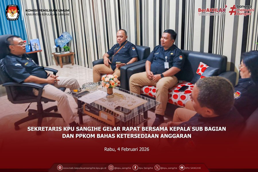 Tahuna, kab-kepulauansangihe.kpu.go.id – Sekretaris KPU Kabupaten Kepulauan Sangihe menggelar rapat bersama para Kepala Sub Bagian dan Pejabat Pengelola Keuangan Organisasi dan Manajemen (PPKOM), dalam rangka membahas ketersediaan serta pengelolaan anggaran pada masing-masing sub bagian. Kegiatan tersebut dilaksanakan di lingkungan Sekretariat KPU Kabupaten Kepulauan Sangihe. Rabu (4/2/2026).