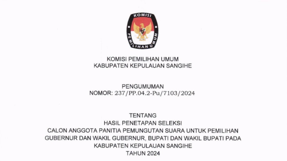 Tahuna, kab-kepulauansangihe.kpu.go.id - Berikut ini Pengumuman KPU Kabupaten Kepulauan Sangihe Nomor : 237/PP.04.2-Pu/7103/2024 tentang Hasil Penetapan Seleksi Calon Anggota Panitia Pemungutan Suara untuk Pemilihan Gubernur dan Wakil Gubernur, Bupati dan Wakil Bupati, dan Wali Kota dan Wakil Wali Kota pada Kabupaten Kepulauan Sangihe Tahun 2024.
