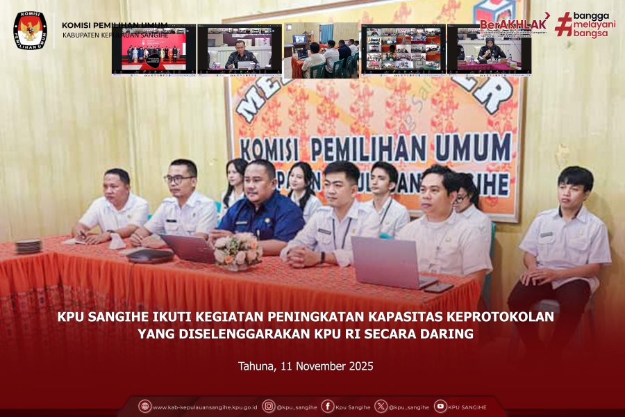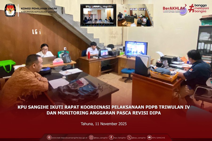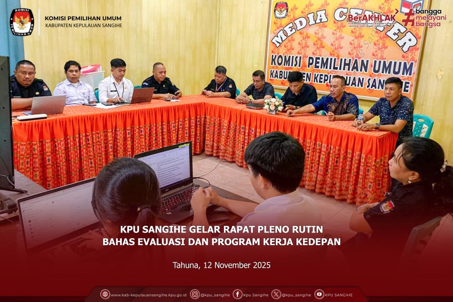 Tahuna, kab-kepulauansangihe.kpu.go.id – Komisi Pemilihan Umum (KPU) Kabupaten Kepulauan Sangihe melaksanakan Rapat Pleno Rutin pada Rabu, 12 November 2025, bertempat di Ruang Rapat KPU Sangihe. Rapat dipimpin langsung oleh Ketua KPU Sangihe, Bapak Absan R. Tahendung, serta dihadiri oleh para Anggota KPU Sangihe, Plt. Sekretaris, para Kepala Sub Bagian, dan Pejabat Fungsional Sekretariat KPU Sangihe. Kegiatan diawali dengan doa pembuka, dilanjutkan dengan sambutan dan arahan oleh Ketua KPU Sangihe. Dalam arahannya, Ketua KPU menekankan pentingnya soliditas dan koordinasi antar-divisi dalam memastikan seluruh kegiatan dan program kerja berjalan dengan baik serta sesuai dengan jadwal yang telah ditetapkan. Selanjutnya, rapat dilanjutkan dengan penyampaian arahan secara berurutan dari masing-masing Ketua Divisi, yang kemudian diteruskan dengan evaluasi terhadap kegiatan yang telah dilaksanakan oleh setiap divisi. Melalui evaluasi ini, KPU Sangihe berupaya memastikan bahwa setiap kegiatan dapat berjalan efektif, efisien, dan sesuai dengan ketentuan yang berlaku. Selain itu, rapat juga membahas terkait Pengisian Daftar Inventarisasi Masalah (DIM) Implementasi Peraturan Tahapan Pemilu yang akan dibawah pada saat Rapat Koordinasi yang akan dilaksanakan KPU Provinsi Sulawesi Utara nanti. Rapat pleno rutin ini diakhiri dengan penutupan secara resmi oleh Ketua KPU Sangihe, yang sekaligus mengajak seluruh jajaran untuk terus menjaga komitmen dan semangat kerja dalam menjalankan tugas-tugas kelembagaan.