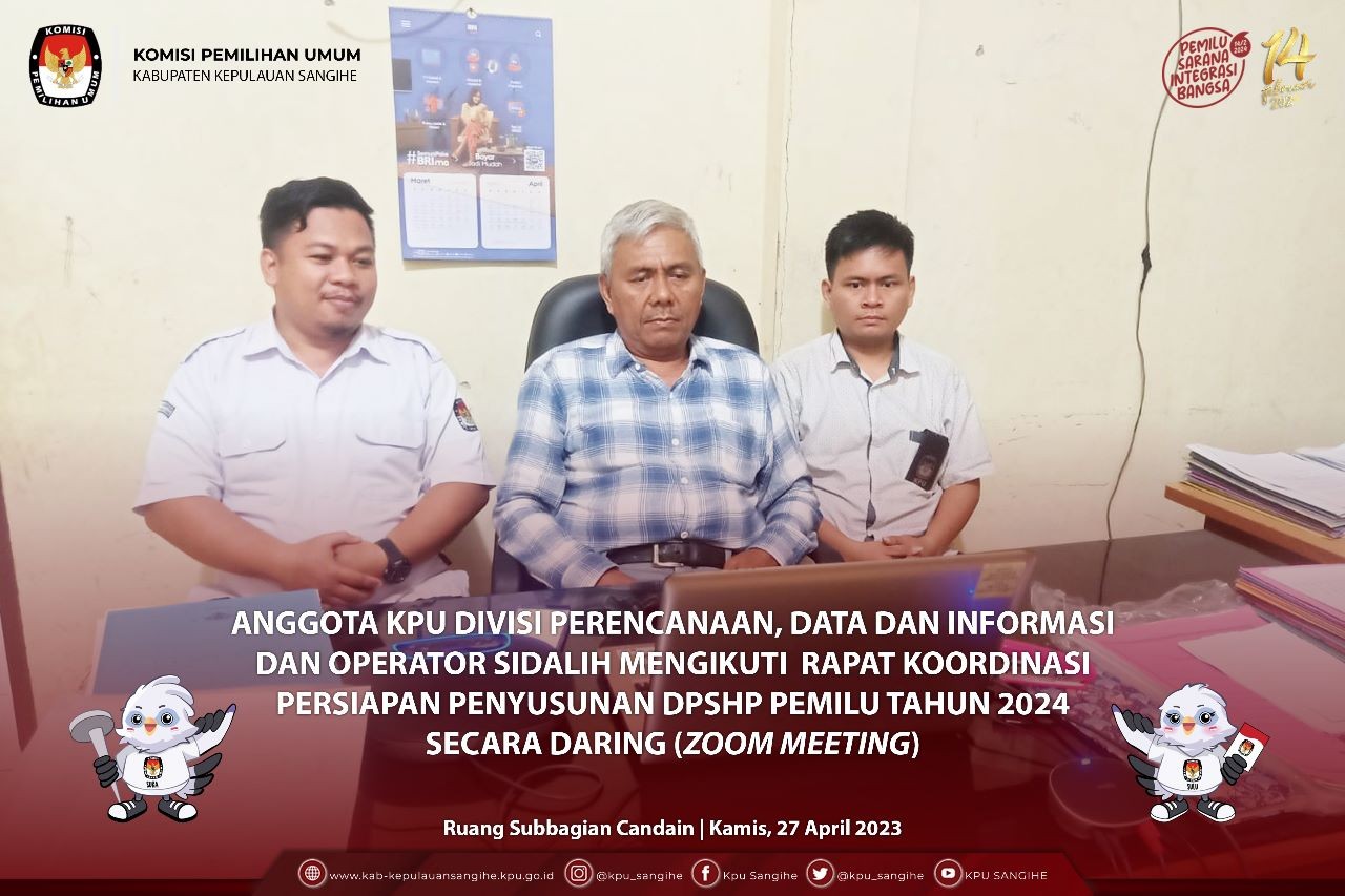 #TemanPemilih, Anggota KPU Sangihe Divisi Perencanaan, Data dan Informasi Tomy Mamuaya dan Operator Sidalih Rahmat H. Muhadjir serta Jonathan Mamuaya mengikuti Rapat Koordinasi Persiapan Penyusunan Daftar Pemilih Sementara Hasil Perbaikan (DPSHP) Pemilu Tahun 2024 yang diselenggarakan KPU RI secara daring (ZOOM Meeting). Kamis (27/4/2023).