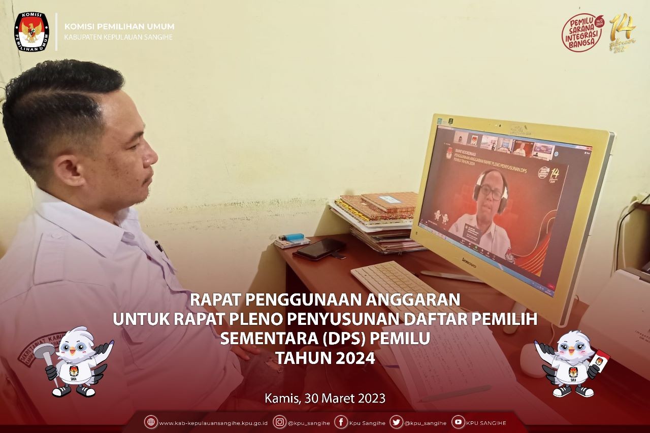 #TemanPemilih, Kepala Sub Bagian Perencanaan, Program dan Data Aden Ladi mengikuti Rapat dengan KPU RI via Daring (Zoom Meeeting) dengan Topik : "Rapat Penggunaan Anggaran untuk Rapat Pleno Penyusunan Daftar Pemilih Sementara (DPS) Pemilu Tahun 2024" di Ruang Sub Bagian Hukum dan SDM. Kamis (30/3/2023).
