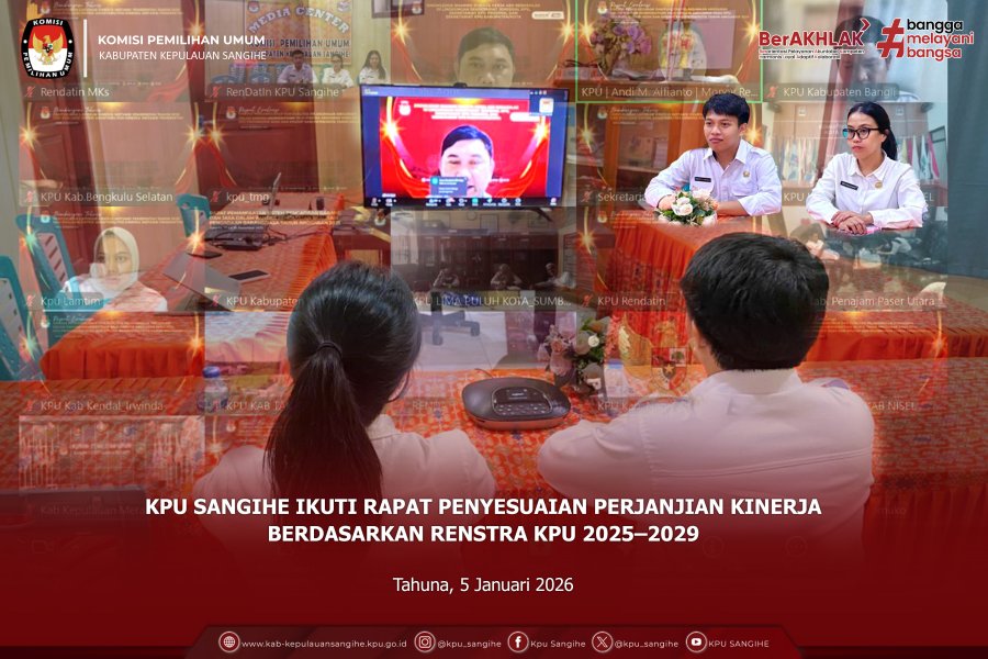Tahuna, kab-kepulauansangihe.kpu.go.id — Komisi Pemilihan Umum (KPU) Kabupaten Kepulauan Sangihe mengikuti Rapat Kerja KPU Provinsi Sulawesi Utara bersama KPU Kabupaten/Kota se-Sulawesi Utara yang diselenggarakan secara daring pada Senin (5/1/2025). Kegiatan ini diikuti oleh KPU Sangihe secara daring dari Ruang Rapat KPU Sangihe dengan dihadiri oleh Plt. Sekretaris KPU Sangihe, para Kepala Sub Bagian, serta staf sekretariat. Rapat kerja tersebut membahas sejumlah agenda penting terkait penguatan tata kelola kinerja dan administrasi, di antaranya Pembaruan Informasi Penilaian Kinerja (PIPK), penyusunan Sasaran Kinerja Pegawai (SKP) Triwulan IV Tahun 2024, serta penyusunan SKP Tahunan sebagai bagian dari upaya peningkatan akuntabilitas dan kinerja aparatur KPU di semua tingkatan. Selain itu, dalam rapat ini KPU Provinsi Sulawesi Utara juga melakukan inspeksi mendadak (sidak) secara daring terhadap pimpinan KPU Kabupaten/Kota terkait kehadiran dan aktivitas pimpinan di kantor masing-masing. Hal ini dilakukan sebagai bentuk pengawasan dan penegasan komitmen kedisiplinan serta tanggung jawab pimpinan dalam menjalankan tugas kelembagaan di awal tahun kerja. Melalui keikutsertaan dalam rapat kerja ini, KPU Sangihe menegaskan komitmennya untuk terus meningkatkan kualitas kinerja, disiplin aparatur, serta sinergi kelembagaan dengan KPU Provinsi dan KPU Kabupaten/Kota lainnya demi mendukung penyelenggaraan pemilu yang profesional, transparan, dan akuntabel.