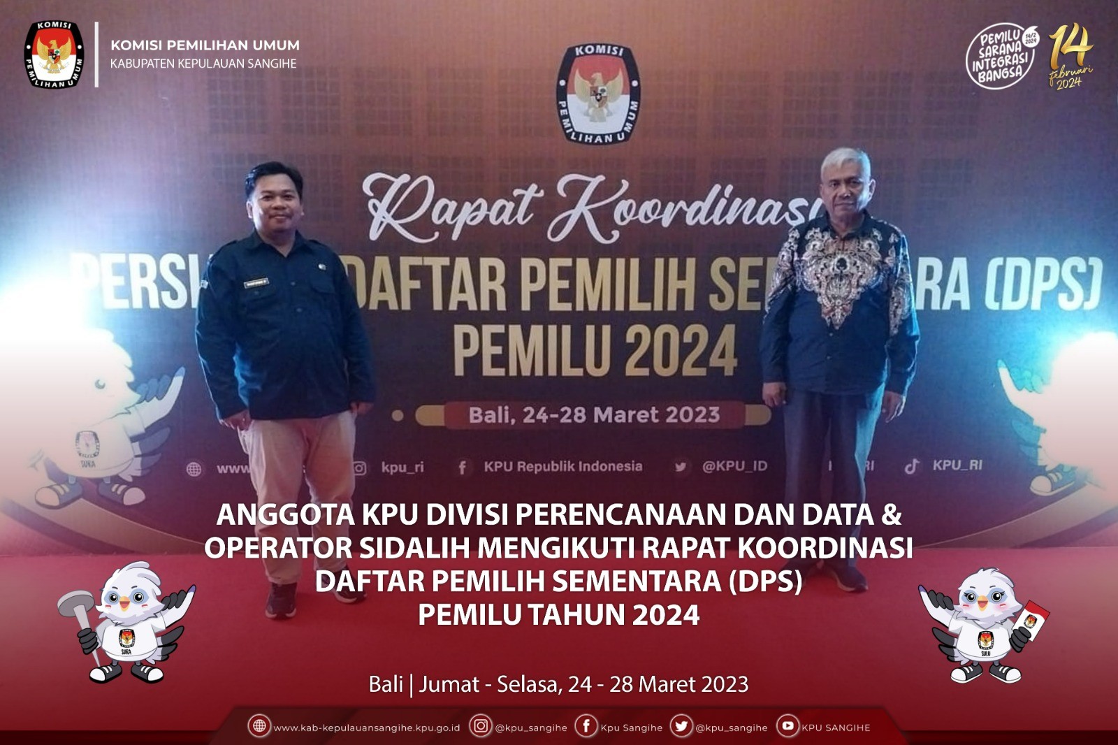 #TemanPemilih, Anggota KPU Sangihe Divisi Perencanaan & Data Tomy Mamuaya & Operator Sidalih Rahmat H. Muhadjir mengikuti Rapat Koordinasi Persiapan Daftar Pemilih Sementara (DPS) Pemilu Tahun 2024 di Bali. Jumat-Selasa (24-28/3/2023).