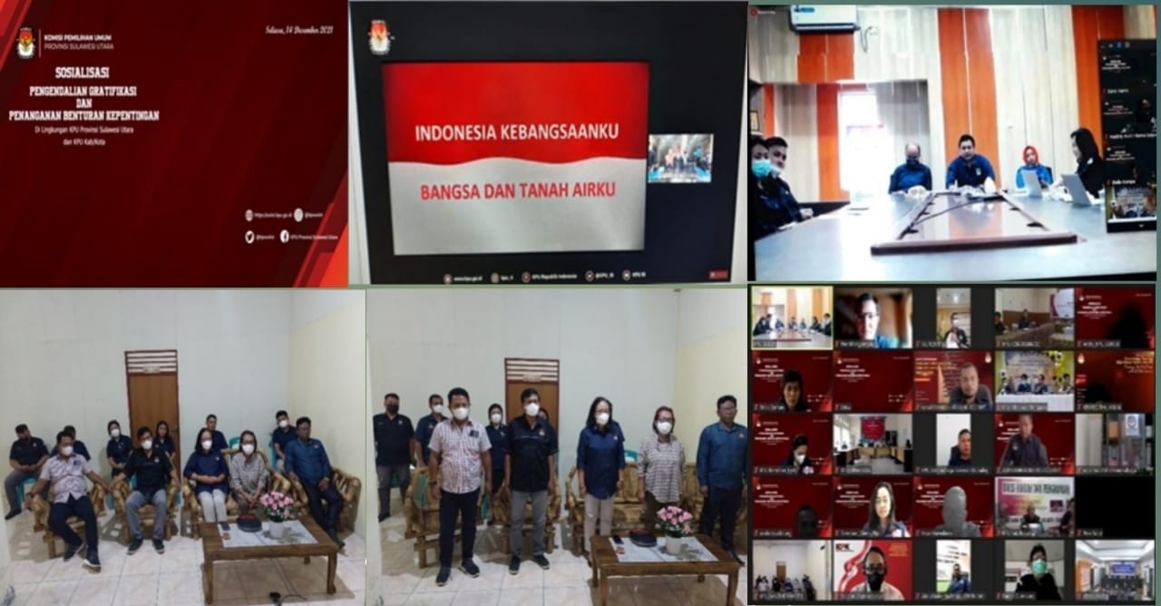 Pada hari Selasa, 14 Desember 2021 Ketua dan Anggota KPU Kabupaten Kepulauan Sangihe, Sekretaris, Kepala Subbagian serta Staf Sekretariat mengikuti “SOSIALISASI PENGENDALIAN GRATIFIKASI DAN PENANGANAN BENTURAN KEPENTINGAN DILINGKUNGAN KPU SE- PROVINSI SULAWESI UTARA". Kegiatan ini dibuka oleh Ketua KPU Provinsi Sulawesi Utara Ardiles Mewoh dengan moderator oleh Kabag KUL KPU Provinsi Sulawesi Utara Carles Worotijan dan Peserta Sosislisasi ini termasuk KPU Kabupaten Kepulauan Sangihe. Sosialisasi kali ini menghadirkan 2 (dua) orang narasumber yang sangat ahli serta berpengalaman dibidangnya masing – masing yakni : Yulianto Saptoprasetyo, Direktorat Gratifikasi dan pelayanan Publik KPK RI Novy Hasbhy Munnawar, Inspektur Wilayah 1 Inspektorat KPU RI Yulianto Saptoprasetyo memaparkan materi tentang Pencegahan Korupsi, Pelaporan dan Pengendalian Gratifikasi sedangkan Novy Hasbhy Munnawar memaparkan materi tentang Pedoman Penanganan Benturan Kepentingan Dilingkungan Komisi Pemilihan Umum. Dan kedua narasumber ini menegaskan bahwa KPU RI, KPU Provinsi dan KPU Kabupaten/Kota untuk betul – betul senantiasa menjaga integritas.