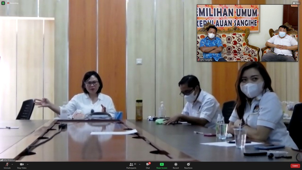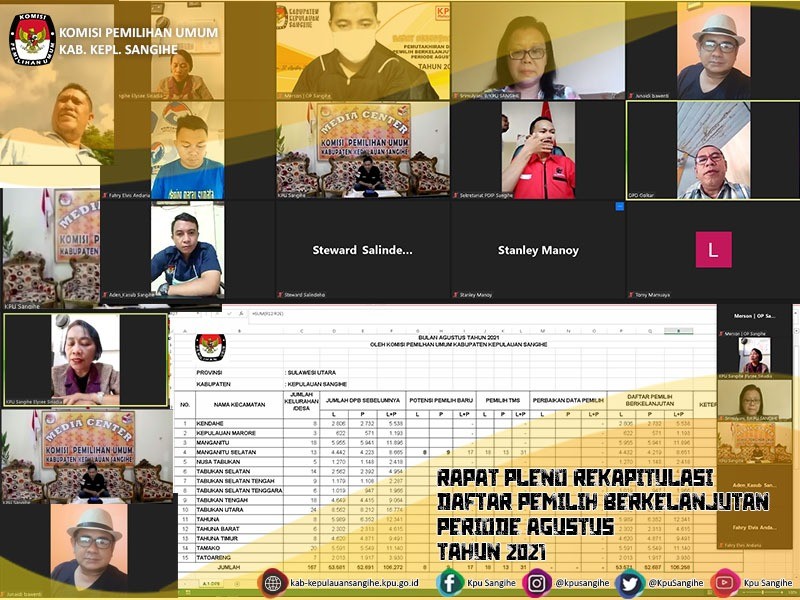 Tahuna | Jumat, 1 Oktober 2021 Bertempat di Aula Komisi Pemilihan Umum Kabupaten Kepulauan Sangihe. Komisi Pemilihan Umum Kabupaten Kepulauan Sangihe menggelar Rapat Koordinasi Pemutakhiran Daftar Pemilih Berkelanjutan Periode Bulan September Tahun 2021 dengan dihadiri Ketua KPU Kepulauan Sangihe Elysee Ph. Sinadia, Ketua Divisi Perencanaan, Program dan Data Tomy Mamuaya, Ketua Divisi Pengawasan, Hukum dan SDM Srimulyani Benharso dan Ketua Divisi Teknis Penyelenggaraan serta Kasubbag dan Staf Prgram dan Data. Rakor dibuka oleh Ketua KPU Elysee Ph. Sinadia pada pukul 09.45 Dalam sambutannya Elysee mengajak teman-teman terkait dalam hal ini Bawaslu Kabupaten Kepulauan Sangihe dan Dukcapil Kabupaten Kepulauan Sangihe agar dapat mengawal proses Daftar Pemilih Berkelanjutan yang sedang berlangsung, agar tercipta Daftar Pemilih yang akurat. Selanjutnya Rapat Pleno Rekapaitulasi Daftar Pemilih Berkelanjutan di lakukan oleh Tomy Mamuaya selaku Kadiv Perencanaan Program dan Data. Adapun Hasil Pleno, yakni jumlah Pemilih Seratus enam ribu dua ratus enam puluh satu (106.261) dengan rincian Pemilih Laki-laki berjumlah lima puluh tiga ribu lima ratus tujuh puluh satu (53.571) dan Pemilih Perempuan berjumlah lima puluh dua ribu enam ratus sembilan puluh (52.690) Pemilih. Data Pemilih Perubahan : Potensi Pemilih Baru 4 Orang; Pemilih Meninggal 1 Orang; dan Peserta yang hadir dalam Rakor antara lain Pimpinan Bawaslu Kab. Kepl. Sangihe dan Dinas Dukcapil Kab. Kepl. Sangihe.