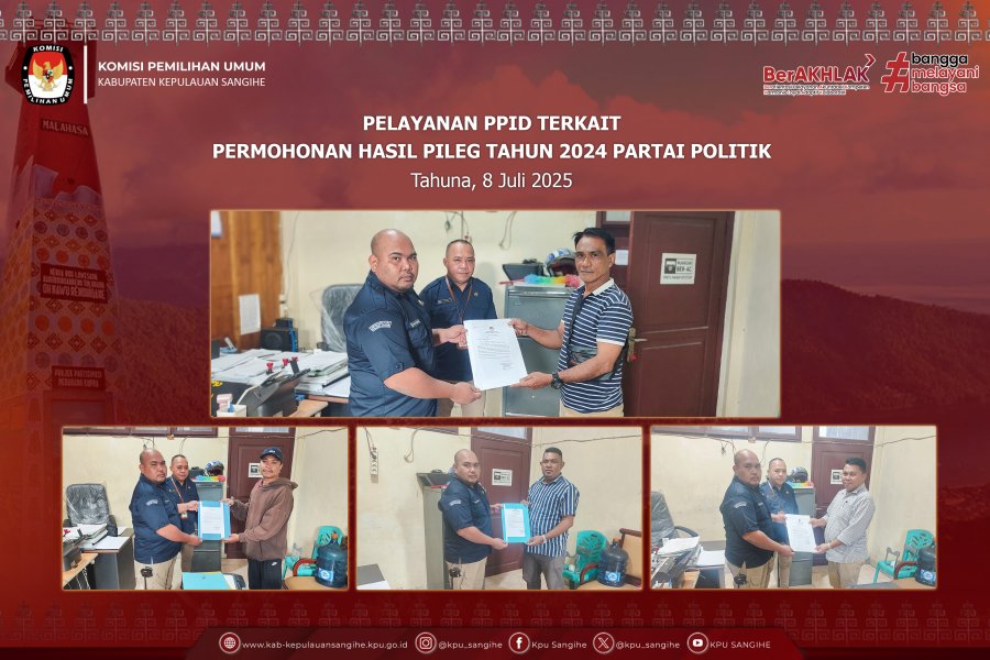 Tahuna - Komisi Pemilihan Umum (KPU) Kabupaten Kepulauan Sangihe melalui Pejabat Pengelola Informasi dan Dokumentasi (PPID) melayani permohonan permintaan surat keterangan hasil Pemilihan Anggota DPRD Kabupaten Kepulauan Sangihe Tahun 2024. Pelayanan tersebut dilaksanakan pada Selasa, 8 Juli 2025, bertempat di Sekretariat KPU Kabupaten Kepulauan Sangihe.