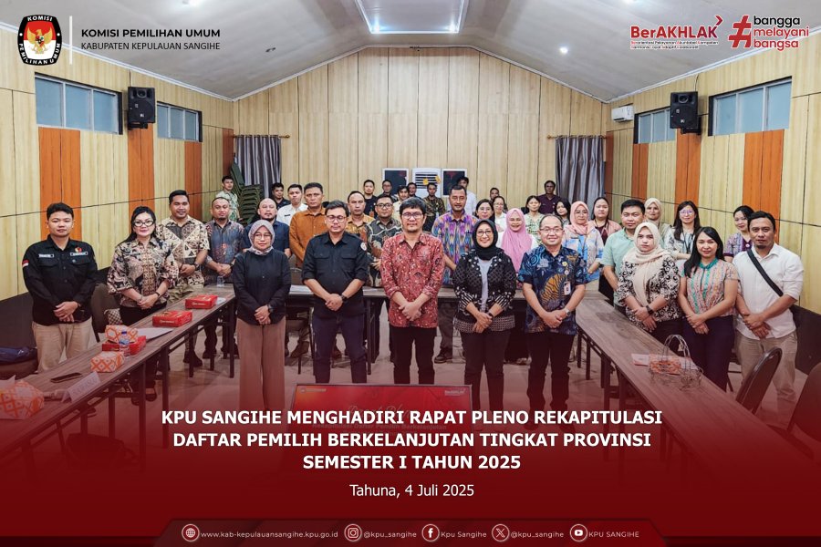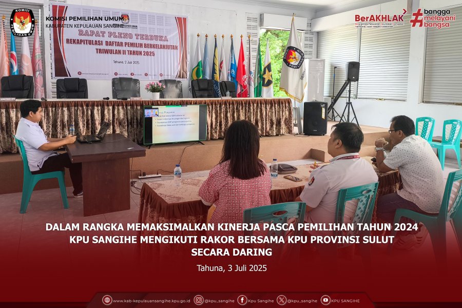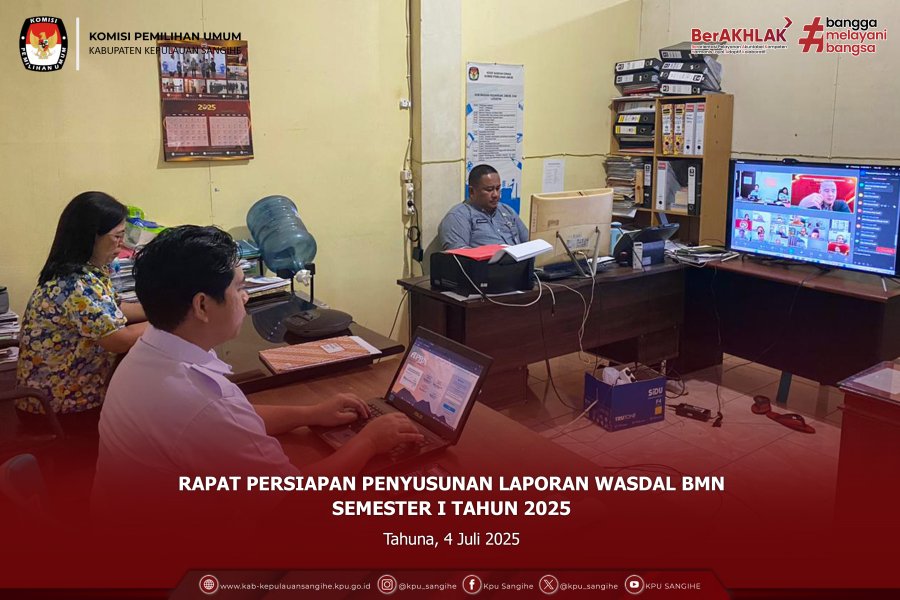 Tahuna — Komisi Pemilihan Umum (KPU) Kabupaten Kepulauan Sangihe mengikuti Rapat Persiapan Penyusunan Laporan Pengawasan dan Pengendalian Barang Milik Negara (Wasdal BMN) Semester I Tahun 2025 yang diselenggarakan oleh KPU Republik Indonesia secara daring pada Jumat, 4 Juli 2025. Kegiatan ini diikuti oleh jajaran sekretariat KPU Sangihe yang membidangi pengelolaan BMN, sebagai bentuk komitmen dalam menjaga akuntabilitas dan tertib administrasi pengelolaan aset negara. Dalam rapat tersebut, KPU RI memberikan arahan teknis terkait mekanisme dan tahapan penyusunan laporan Wasdal BMN, termasuk pemutakhiran data BMN, pelaporan kondisi fisik, serta tindak lanjut hasil monitoring dan evaluasi semester sebelumnya. Melalui partisipasi aktif dalam kegiatan ini, KPU Sangihe diharapkan dapat menyusun laporan Wasdal BMN Semester I Tahun 2025 secara tepat waktu, akurat, dan sesuai ketentuan yang berlaku, guna mendukung transparansi dan efektivitas pengelolaan keuangan negara di lingkungan KPU.