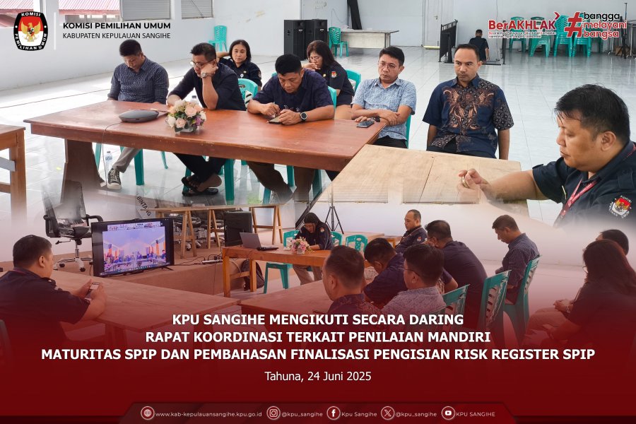 Tahuna — Komisi Pemilihan Umum (KPU) Kabupaten Kepulauan Sangihe mengikuti kegiatan Rapat Koordinasi Terkait Penilaian Mandiri Maturitas SPIP dan Pembahasan Finalisasi Pengisian Risk Register SPIP yang dilaksanakan secara daring oleh KPU Provinsi Sulawesi Utara pada hari Selasa, 24 Juni 2025. Kegiatan yang dilaksanakan secara terkoordinasi ini diawali dengan doa pembukaan yang dipimpin oleh Bapak Raymond Mamahit, dan dipandu oleh moderator Bapak Aminuddin. Acara kemudian dibuka secara resmi oleh Ketua KPU Provinsi Sulawesi Utara, Bapak Kenly Poluan, yang sekaligus memberikan sambutan dan arahan penting terkait peningkatan pengendalian internal dalam penyelenggaraan tugas-tugas kelembagaan. Selanjutnya, pengarahan disampaikan oleh Divisi Hukum dan Pengawasan KPU Provinsi Sulawesi Utara, Bapak Meidy Tinangon, yang menekankan pentingnya integritas dan akuntabilitas dalam proses pengisian Risk Register. Arahan berikutnya disampaikan oleh Sekretaris KPU Provinsi Sulawesi Utara yang turut memberikan penekanan teknis dalam penguatan maturitas SPIP (Sistem Pengendalian Intern Pemerintah). Pada sesi akhir, masing-masing KPU Kabupaten/Kota, termasuk KPU Kabupaten Kepulauan Sangihe, menyampaikan laporan perkembangan dan hasil isian penilaian mandiri serta Risk Register SPIP sebagai bentuk komitmen dalam meningkatkan tata kelola pemerintahan yang baik. Kegiatan ini menjadi bagian penting dari upaya bersama untuk mewujudkan lembaga pemilu yang transparan, akuntabel, dan berintegritas di seluruh tingkatan. Adapun yang mengikuti kegiatan yaitu Ketua KPU Sangihe Bpk. Absan R. Tahendung, Kadiv Hukum & Pengawasan Bpk. Rahmat Gaib, Kadiv Teknis Pemilihan Bpk. Japri Lintuhaseng, Kadiv Partisipasi Masyarakat dan SDM Bpk. Dellas T. Marasut, Kadiv Perencanaan, Data dan Informasi Bpk. Ihsan F. Panawar, Plt. Sekretaris Bpk. Jelly Kantu, Para Kasubag dan Operator SPIP.