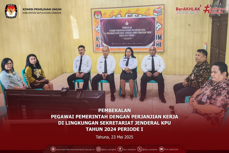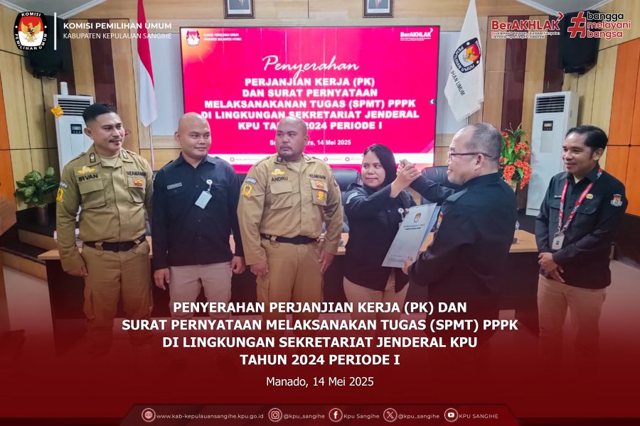 Penyerahan Perjanjian Kerja (PK) dan Surat Pernyataan Melaksanakan Tugas (SPMT) Pegawai Pemerintah dengan Perjanjian Kerja (PPPK) di Lingkungan Sekratariat Jenderal Komisi Pemilihan Umum Tahun 2024 Periode I, KPU Provinsi Sulawesi Utara, Rabu (14/5/2025).