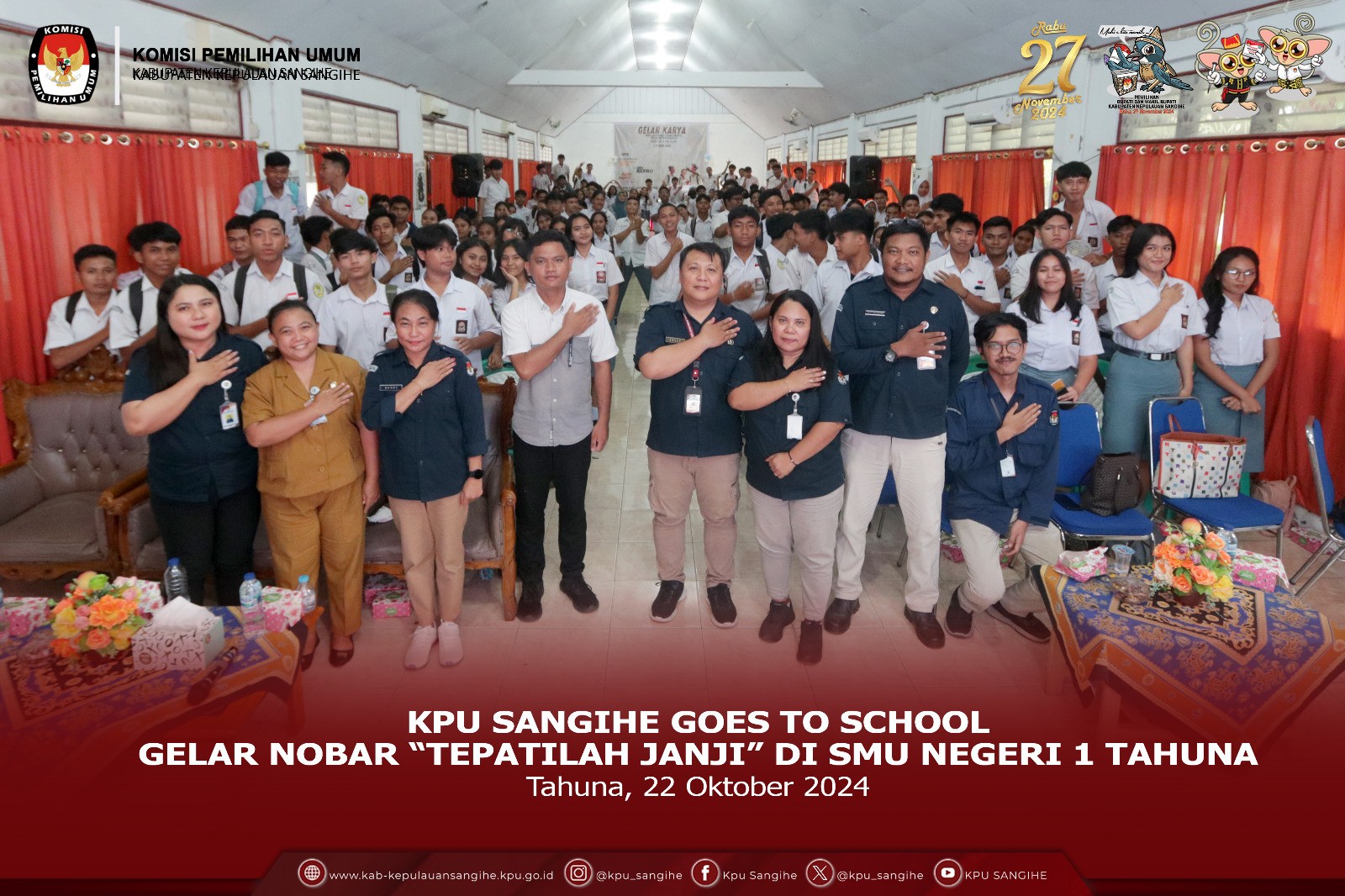 Kegiatan KPU goes to school yang bertema nobar film tepatilah janji ini yang dibuka oleh pihak dari perwakilan sekolah Marianti Ganap yang merupakan wakil kepala sekolah SMA Negeri 1 Tahuna mengatakan, "kegiatan dalam menjelang awal Pemilihan Umum Kepala Daerah (Pilkada) 2024 di Kepulauan sangihe, KPU Sangihe sangat tepat dalam mensosialisasikan pilkada dilembaga lembaga sekolah, karena yang menjadi sasaran utama dalam mensosialisasikan pendidikan pemilih kepada siswa siswi di berbagai sekolah, terutama siswa SMA Negeri 1 Tahuna yang duduk di bangku kelas dua belas, dari 239 siswa yang ada merupakan kategori pemilih pemula yang sudah siap menjadi pemilih, karena itu KPU dalam kegiatan goes to school bersama pihak sekolah untuk dapat berpartisipasi dalam Pilkada 2024 nanti", ujar Marianti Ganap dalam sambutannya.