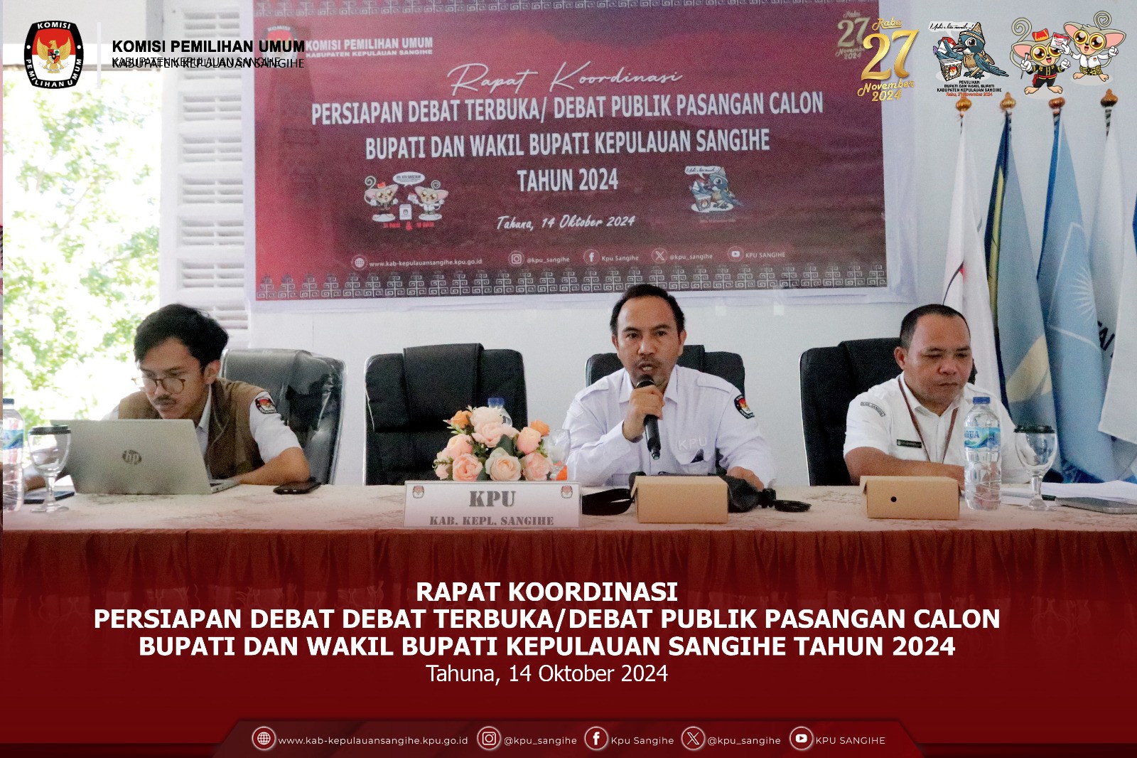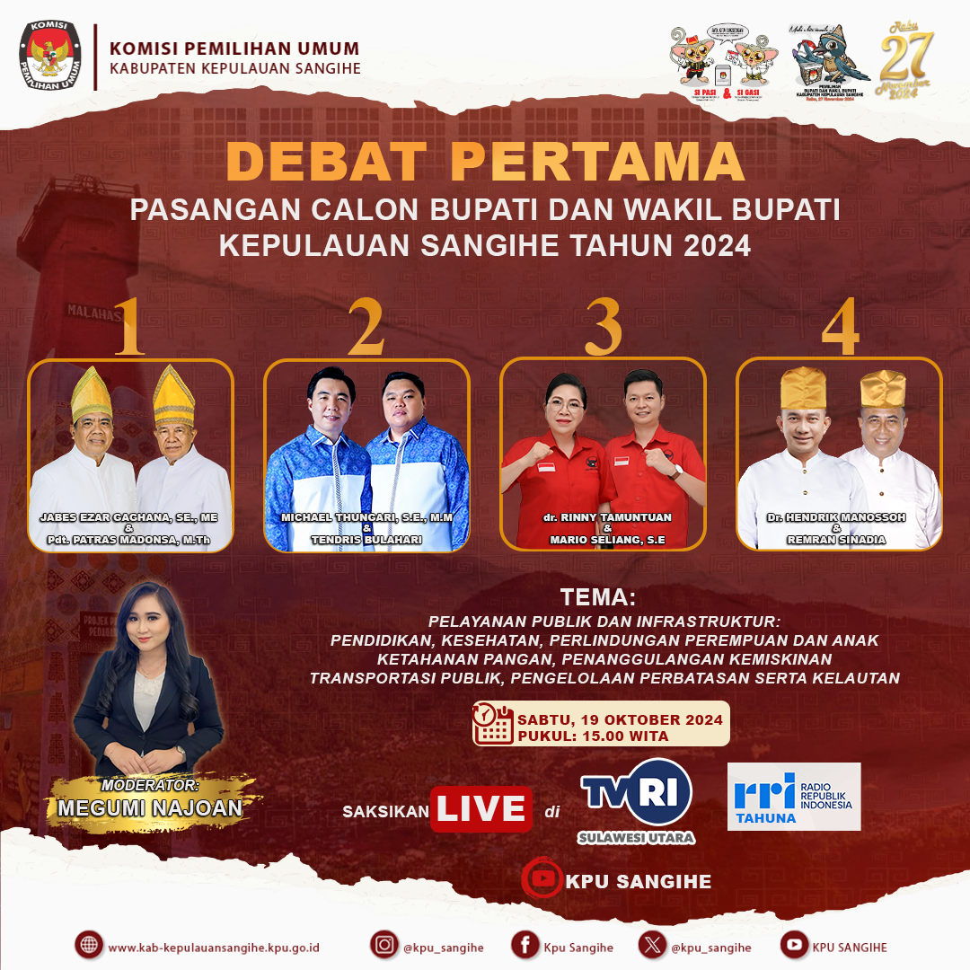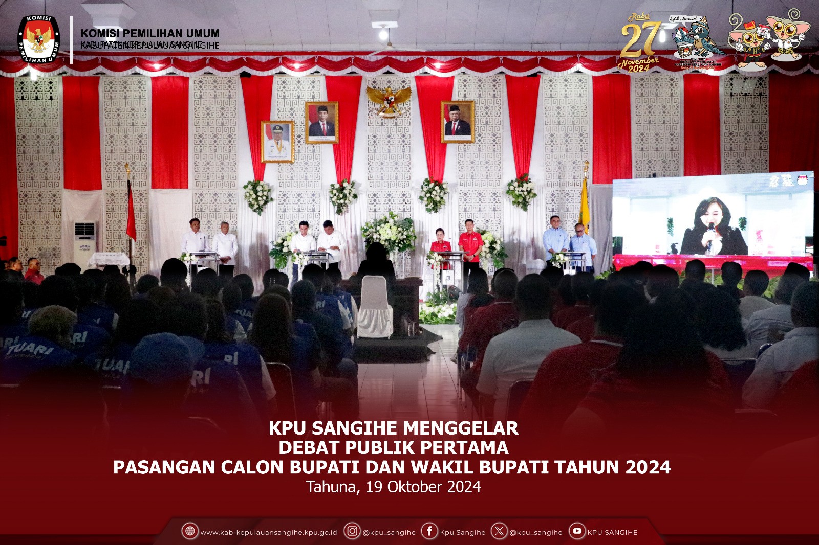 Tahuna, kab-kepulauansangihe.kpu.go.id - Komisi Pemilihan Umum (KPU) Kabupaten Kepulauan Sangihe menggelar debat terbuka/debat publik pertama sore hari di kantor DPRD Kabupaten Kepulauan Sangihe, Sabtu (19/10/2024). Kegiatan kampanye terbuka yang dilaksanakan oleh KPU Kabupaten Kepulauan Sangihe melalui metode debat terbuka yang disiarkan langsung oleh media penyelenggara TVRI dan RRI dan youtube KPU Sangihe. Debat publik pertama paslon Bupati dan Wakil Bupati Kepulauan Sangihe yang dibuka langsung oleh ketua KPU Kabupaten Kepulauan Sangihe Absan R. Tahendung, dalam sambutannya, Absan berharap "acara debat publik pertama calon bupati dan calon wakil bupati ini dapat digunakan kesempatan pasangan calon (paslon) untuk dapat menyampaikan visi, misi, program kerja yang dapat meyakinkan pemilih, agar dapat memilih dirinya menjadi bupati dan wakil bupati lima tahun mendatang", harap Absan. Absan berharap juga "kepada para pemilih dimanapun berada khususnya warga Kepulauan Sangihe melalui siaran TVRI dan youtube KPU Sangihe dapat menyaksikan dan menyimak visi, misi, dan program kerja para calon bupati dan wakil bupati pada debat disore hari ini dan mendoakan kegiatan debat ini dari awal sampai akhir dapat berjalan dengan baik dengan menjaga ketertiban", tambah Absan. Kegiatan debat publik pertama ini dihadiri oleh anggota KPU Kabupaten Kepulauan Sangihe Ketua Divisi Sosialisasi, Pendidikan Pemilih, Partisipasi dan SDM Iklam Patonaung, Ketua Divisi Perencanaan Data dan Informasi Ihsan F. Panawar, Sekretaris KPU Kabupaten Kepulauan Sangihe Alwi Kawoka, Ketua dan anggota DPRD Kabupaten Kepulauan Sangihe, pasangan calon, pimpinan partai, Bawaslu, Forum Koordinasi Pimpinan Daerah (FORKOPIMDA), pimpinan perguruan tinggi, Kepolisian, TNI, media dan masyarakat. Kegiatan debat publik pertama ini diikuti oleh empat kandidat paslon Bupati dan calon Wakil Bupati Kepulauan sangihe, yakni; 1. Jabez Ezar Gaghana, SE., ME dan Pdt. Patras Madonsa, MTh. 2. Michael Thungari, S.E., M.M dan Tendris Bulahari 3. dr. Rinny Tamuntuan dan Mario Seliang, S.E diusung 4. Dr. Hendrik Manossoh dan Remran Sinadia. Debat pertama saat ini sangat penting untuk mengetahui visi, misi, ide, gagasan serta program kerja dari masing masing paslon terutama untuk masyarakat kepulauan Sangihe agar nantinya menjadi referensi untuk menentukan siapakah kepala daerah yang memimpin kepulauan sangihe selama lima tahun kedepan. Debat pertama yang di pandu oleh Megumi Najoan presenter (pemandu acara) dan news anchor (penyiar berita)TVRI, selama durasi tiga jam dengan enam segmen (babak), dengan mengusung tema Pelayanan Publik dan Infrastruktur dengan sub tema pendidikan, kesehatan, perlindungan perempuan dan anak ketahanan pangan, penanggulangan kemiskinan, transportasi publik, pengelolaan perbatasan serta kelautan. Adapun enam segmen dalam kegiatan debat publik ini adalah segmen pertama penyampaian visi misi dan program kerja dari masing masing paslon, segmen kedua pendalaman visi misi oleh calon bupati, segmen ketiga pendalaman visi misi oleh calon wakil bupati, segmen ke empat dan kelima tanya jawab antar paslon, dan segmen keenam pernyataan penutup. KPU Sangihe mempercayai kepada kelima panelis dalam merumuskan materi materi soal dalam debat pertama ini, kelima panelis itu diantaranya; Prof. DMin. Ir. Siegfried Berhimpon MS, MAppSc., PhD. (Akademisi/Tokoh Masyarakat), Terry Franklin Suoth, S.Pd. (Pegiat Pemilu), Ivonne Sterry Paloon, S.Kep. (ASN Kementrian Pertahanan), Lisa Anjani Siwi, S.HI., M.A. (Dosen Politik Fakultas Ushuluddin, Adab dan Dakwah, IAIN Manado) dan Dr. Viktory N.J. Rotty, M.Teol., M.Pd. (Dosen Universitas Negeri Manado). Dan materi materi soal pertanyaan pun dijaga kerahasiaannya di dalam amplop dan bersegel oleh para penelis dan diserahkan kepada Ketua KPU Sangihe pada saat acara berlangsung dan ketua KPU Sangihe menyerahkan pertanyaan soal soal di meja moderator dan selama kegiatan debat pertama ini berjalan dengan kondusif dan aman. Turut hadir juga Pejabat Fungsional Penata Kelola Pemilu Jelly Kantu, Kasubag Teknis KPU RI Hafiz Jody, Kasubag Teknis Penyelenggara Pemilu, Partispasi dan Hubungan Masyarakat Stanley B. Legrants, Kasubag Hukum dan SDM Merry Malendes, Kasubag Keuangan Umum dan Logistik Nelda Kalangit, Kasubag Perencanaan Data dan Informasi Aden Ladi dan staf jajaran KPU Kabupaten Kepulauan Sangihe.