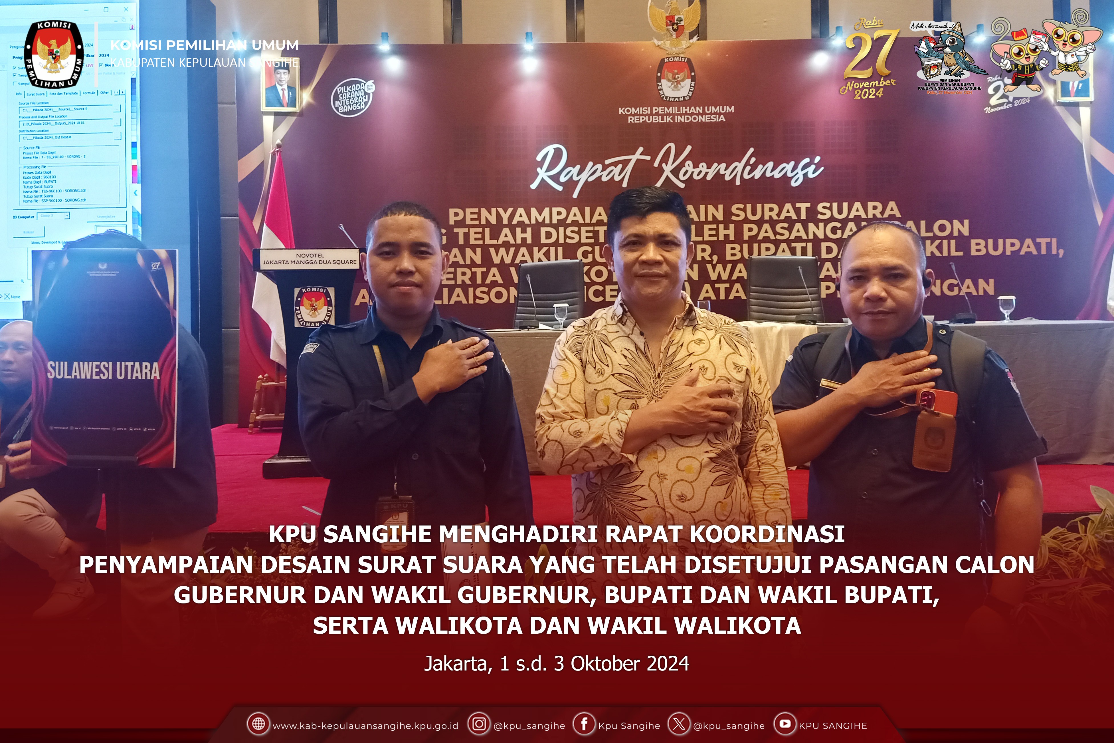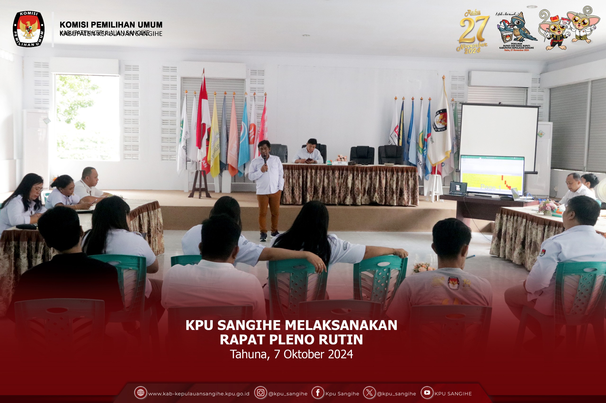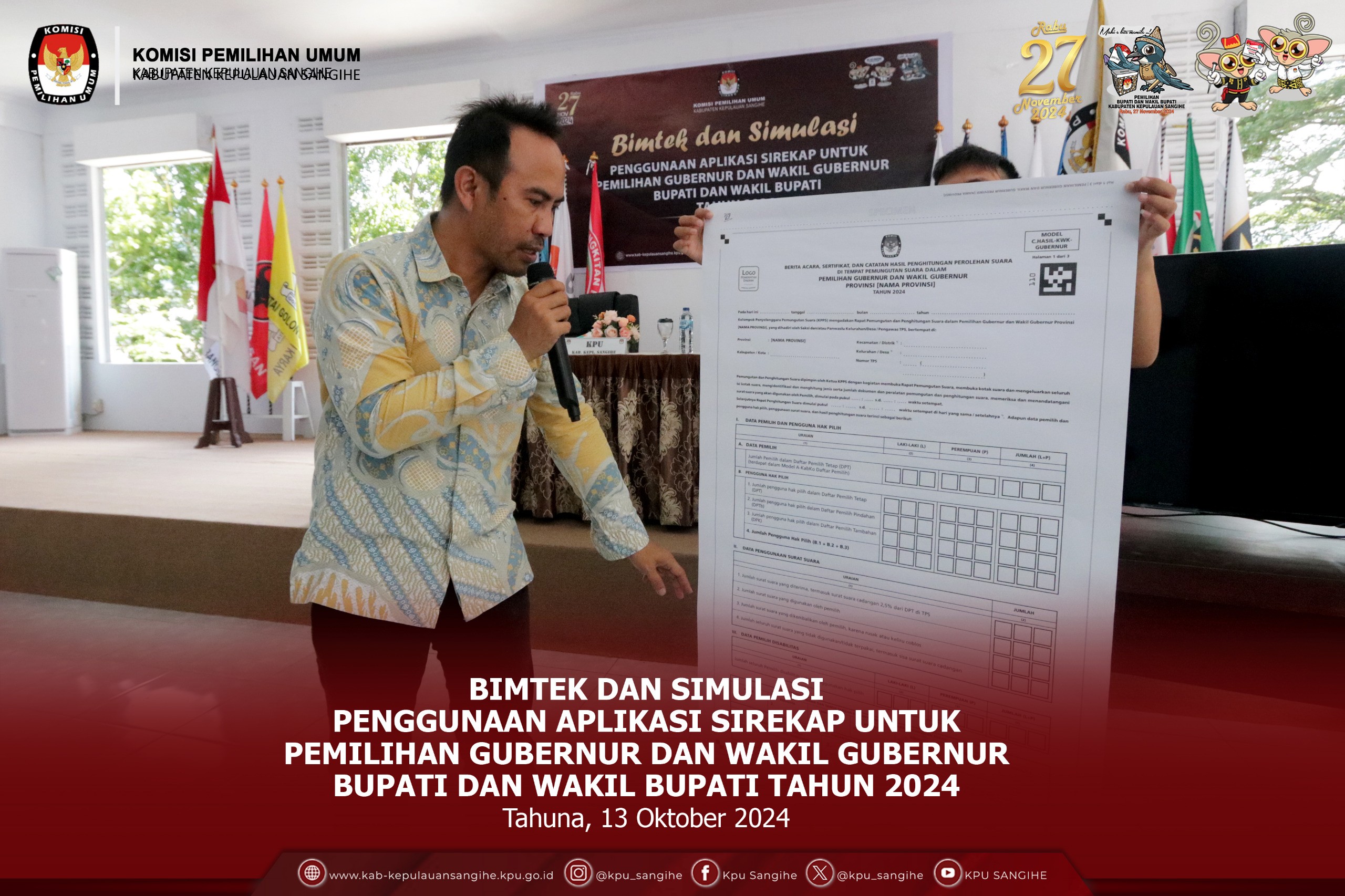 Tahuna, kab-kepulauansangihe.kpu.go.id - Komisi Pemilihan Umum (KPU) Kabupaten Kepulauan Sangihe melaksanakan kegiatan Bimtek dan Simulasi Penggunaan Aplikasi Sirekap untuk Pemilihan Gubernur dan Wakil Gubernur, Bupati dan Wakil Bupati Tahun 2024 di Aula Lt. 2 Kantor KPU Sangihe, Minggu (13/10/2024). Pemungutan suara Pemilihan Kepala Daerah (Pilkada) 2024 tepatnya pada tanggal 27 November 2024 tinggal menghitung hari, KPU sebagai penyelenggara pemilu sedang gencar melaksanakan sosialisasi disemua tahapan, berbagai macam kegiatan rapat koordinasi (rakor) dan bimbingan teknis (bimtek) dilaksanakan agar semua tahapan dapat berjalan lancar tanpa kendala apapun, salah satunya KPU Sangihe yang melaksanakan kegiatan bimtek dan simulasi dalam penggunaan aplikasi Sistem Informasi Rekapitulasi (Sirekap). Dalam kegiatan bimtek dan simulasi dalam penggunaan aplikasi Sirekap ini, KPU sangihe mengundang peserta badan adhock di lima belas kecamatan di seluruh Kabupaten Kepulauan Sangihe yaitu dari Ketua PPK, Kepala Divisi (Kadiv) Data PPK, Kadiv Teknis dan satu orang PPS yang membidangi data, dan kegiatan ini dilaksanakan di kantor KPU Kabupaten Kepulauan Sangihe, Minggu (13/10/2024). Kegiatan bimtek dan simulasi ini di buka oleh Ketua Divisi Perencanaan Data dan Informasi Ihsan F. Panawar yang di dampingi oleh Ketua Divisi Sosialisasi, Pendidikan Pemilih, Partisipasi dan SDM Iklam Patonaung, dalam sambutan pembukaan Ihsan menjelaskan "acara ini adalah uji beban terhadap Sirekap yang akan dilaksanakan nanti pada hari pemungutan suara, dan bimtek ini dilaksanakan secara nasional di tingkat kabupaten kota dan diharapkan semua PPK, PPS menjadi contoh ketika pemungutan suara pada tanggal 27 November 2024 nanti" jelas Ihsan. Pada kesempatan kegiatan ini juga anggota KPU Betty Epsilon Idroos melalui daring menjelaskan, "Sirekap pilkada adalah sebuah sistem informasi yang digunakan sebagai alat bantu dalam rekapitulasi suara pada Pilkada Tahun 2024, aplikasi ini terdiri dari Sirekap Mobile dan Sirekap Web dan Sirekap Mobile digunakan oleh KPPS berbasis android dan Sirekap Web digunakan oleh PPK, KPU Kabupaten Kota, dan KPU Provinsi unruk kebutuhan rekapitulasi dimasing maaing tingkatan", ujar Betty. Aplikasi Sirekap adalah alat bantu dalam rekapitulasi suara pada Pilkada Tahun 2024, dan teman teman KPPS semaksimal mungkin untuk fokus dalam merekap jangan sampai salah dalam penulisan, diteliti dan di cek kembali sebelum finalisasi, kegiatan uji beban terhadap Sirekap ini disarankan penggunaannya lebih awal agar fungsinya kedepan tidak ada kesalahan lebih besar lagi", tegas Ihsan. Dalam kegiatan ini peserta langsung uji coba/simulasi dengan menggunakan aplikasi Sirekap agar pada waktu penghitungan suara nanti anggota KPPS tidak ada kesalahan lagi. Turut hadir Kasubag Teknis KPU RI Hafiz Joddy, Kasubag Perencanaan Data dan Informasi Aden Ladi, dan Operator Sirekap.