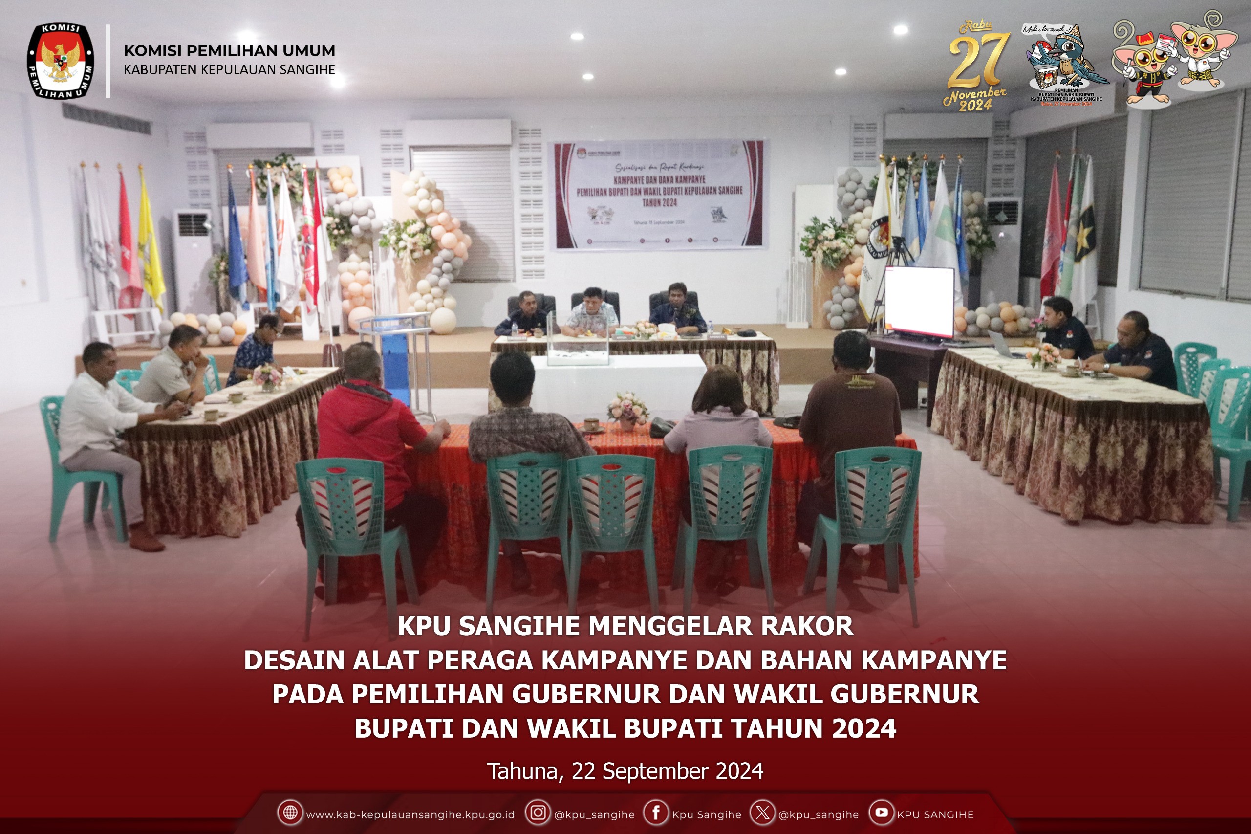Tahuna, kab-kepulauansangihe.kpu.go.id - KPU Sangihe menggelar rapat koordinasi (rakor) desain Alat Peraga Kampanye (APK) dan bahan kampanye pada pemilihan Gubernur dan Wakil Gubernur, Bupati dan Wakil Bupati Tahun 2024, Minggu (22/9/2024).