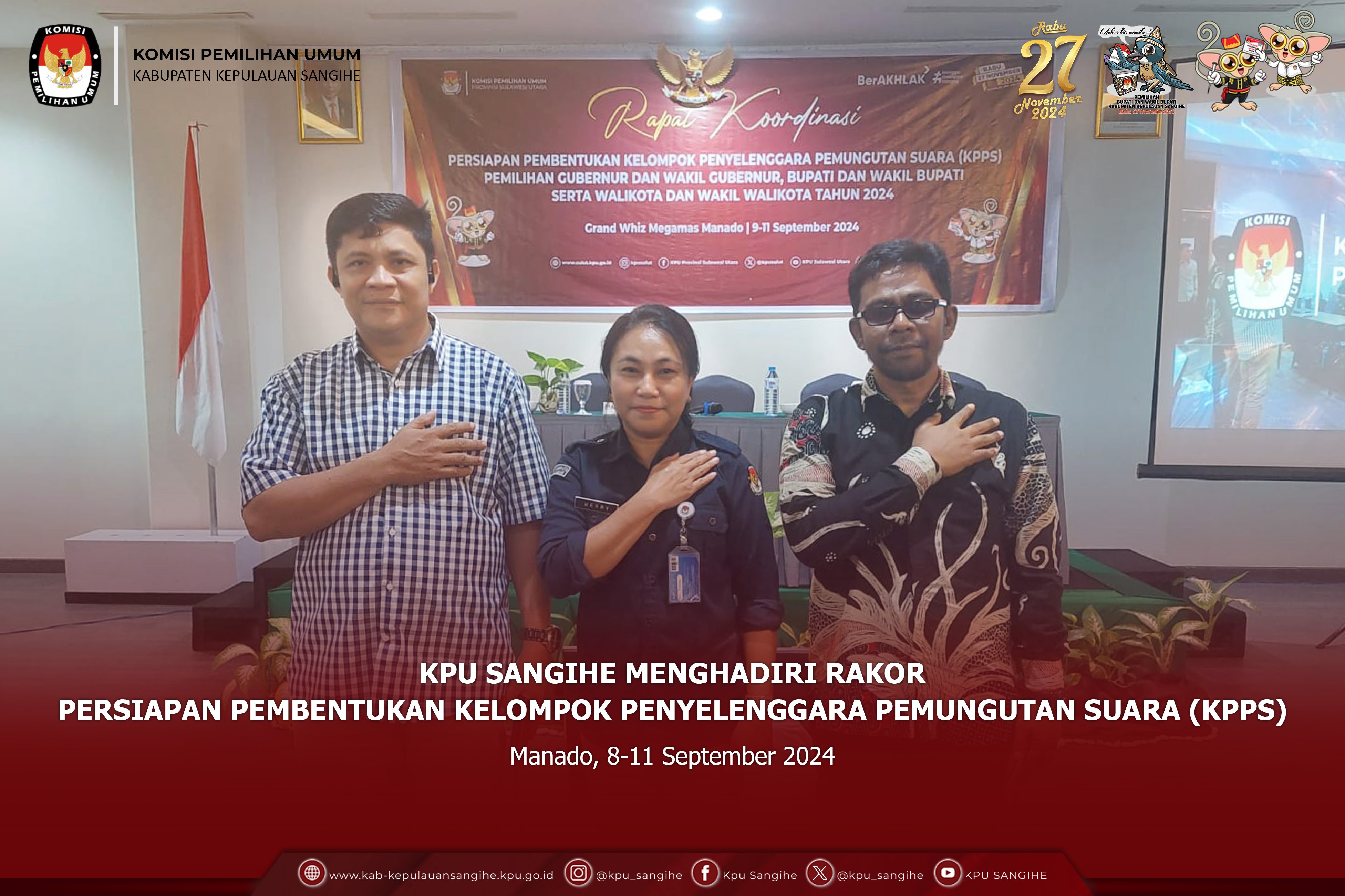 Manado, kab-kepulauansangihe.kpu.go.id - KPU Sangihe menghadiri Rapat Koordinasi Persiapan Pembentukan Kelompok Penyelenggara Pemungutan Suara (KPPS) Pada Pemilihan Kepala Daerah Tahun 2024 yang digelar KPU Provinsi Sulawesi Utara. Senin s.d. Rabu (9-11/9/2024). Ketua KPU Sulut Kenly Poluan dalam pembukaan Rapat Koordinasi menegaskan bahwa pembentukan KPPS Pilkada 2024 harus mengacu pada evaluasi proses pembentukan KPPS di Pemilu 2024 yang lalu. “Bercermin dari rekruitment KPPS di Pemilu sebelumnya tentu teman-teman sudah banyak catatan maupun evaluasi terkait siapa saja yang layak untuk direkruit kembali, jangan sampai kita salah mengajak orang bergabung yang nantinya akan menimbulkan masalah yang berulang. Selain itu kita juga perlu mengutamakan orang-orang yang berpengalaman yang sudah memahami kerja-kerja sebagai KPPS. Saya juga berharap semoga direntan waktu yang singkat ini proses pembentukan KPPS di Sulawesi Utara dapat berjalan lancar”, pungkasnya. Sementara itu Anggota KPU Sulut Meidy Tinangon menyampaikan bahwa perekrutan Badan Adhoc Pilkada 2024 tidak jauh berbeda dengan Pemilu 2024 yang lalu karena peraturan KPU telah mengatur pembentukan Badan Adhoc Pemilu dan Pemilihan, berbeda dengan perekrutan PPK yang dilangsungkan oleh KPU Kab/Kota untuk rekruitment KPPS sendiri dilakukan secara serentak sehingga perlu penekanan secara berjenjang untuk melaksanakan tata cara serta mekanisme yang telah diatur. Selanjutnya Sekretaris KPU Sulut Meidy Malonda menjabarkan terkait dukungan Sekretariat dalam mendukung kerja-kerja KPU ditiap Tahapannya. Disisi lain Anggota KPU Sulut Awaluddin Umbola mengungkapkan dengan pengalaman rekruitment KPPS di Pemilu sebelumnya berbagai catatan evaluasi dan permasalahan akan didiskusikan beberapa hari ini sehingga kita semua dapat memetakan permasalahan dalam proses rekruitment dan kemudian dicarikan solusinya. Rapat Koordinasi menghadirkan beberapa narasumber yakni Dinas Kesehatan Provinsi Sulut dr. Linda Agnes Matali, Kepala Badan Kesatuan Bangsa dan Politik Sulut Fery Sangian, Bawaslu Sulut Zulkifli Densi, Ketua AIPI Alfitra Salamm, Akademisi Unsrat Dr. Michael Mamentu, Chief Baciraro Recycle Marlon Kamangi, Jurnalis Ronny Buol. Adapun yang menghadiri Rapat Koordinasi yaitu Ketua KPU Sangihe Bpk. ABSAN R. TAHENDUNG, Kadiv Sosdilih, Parmas & SDM Bpk. IKLAM PATONAUNG dan Kasubag Hukum dan SDM Ibu MERRY MALENDES.