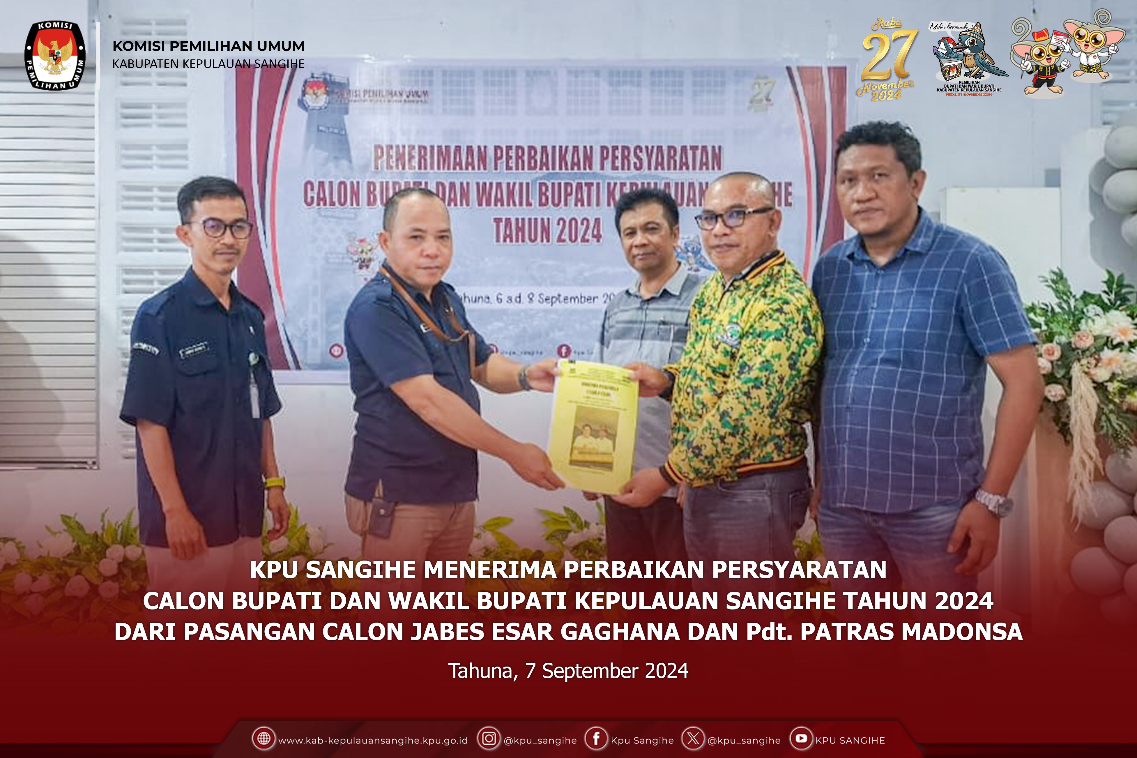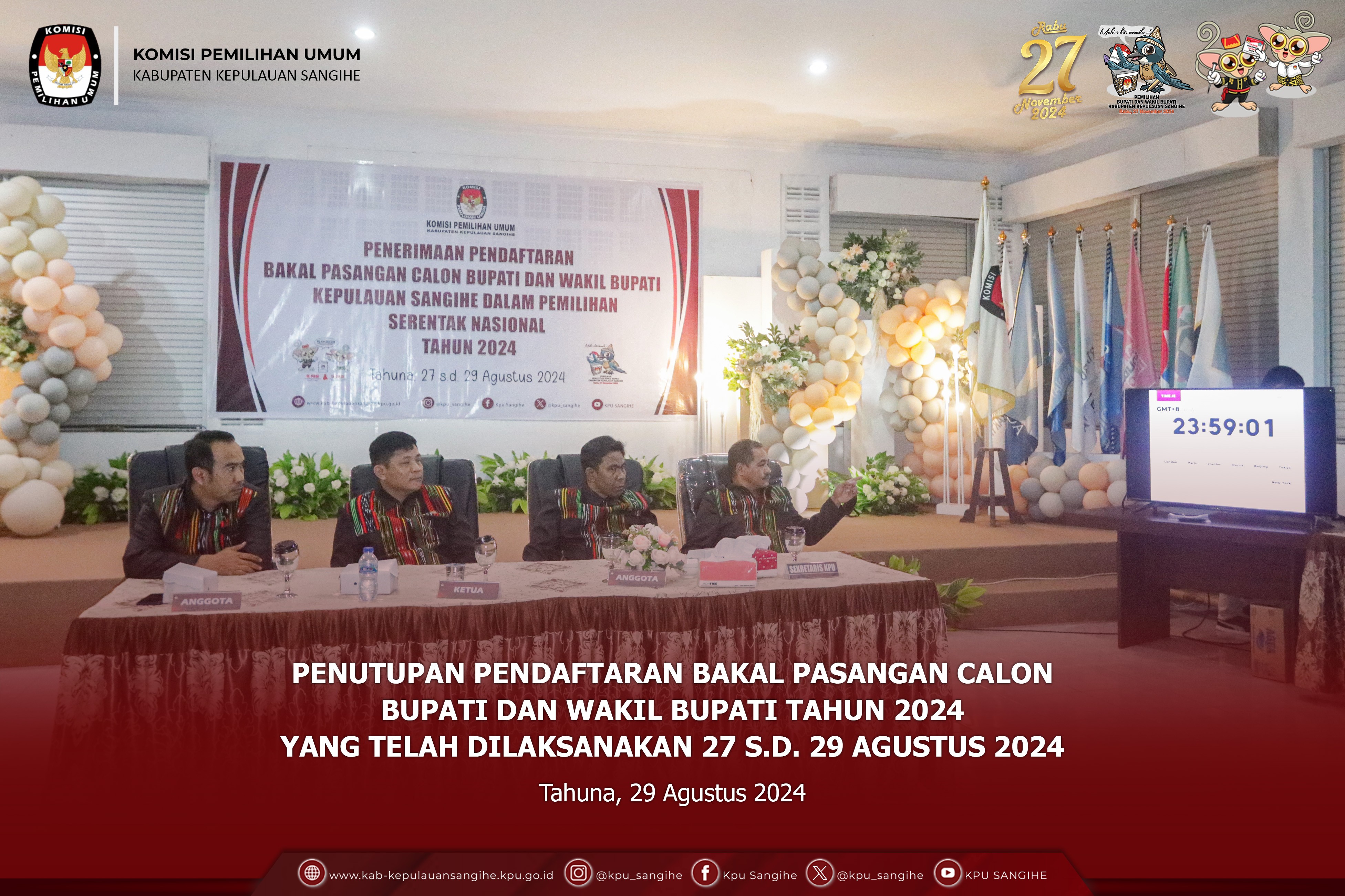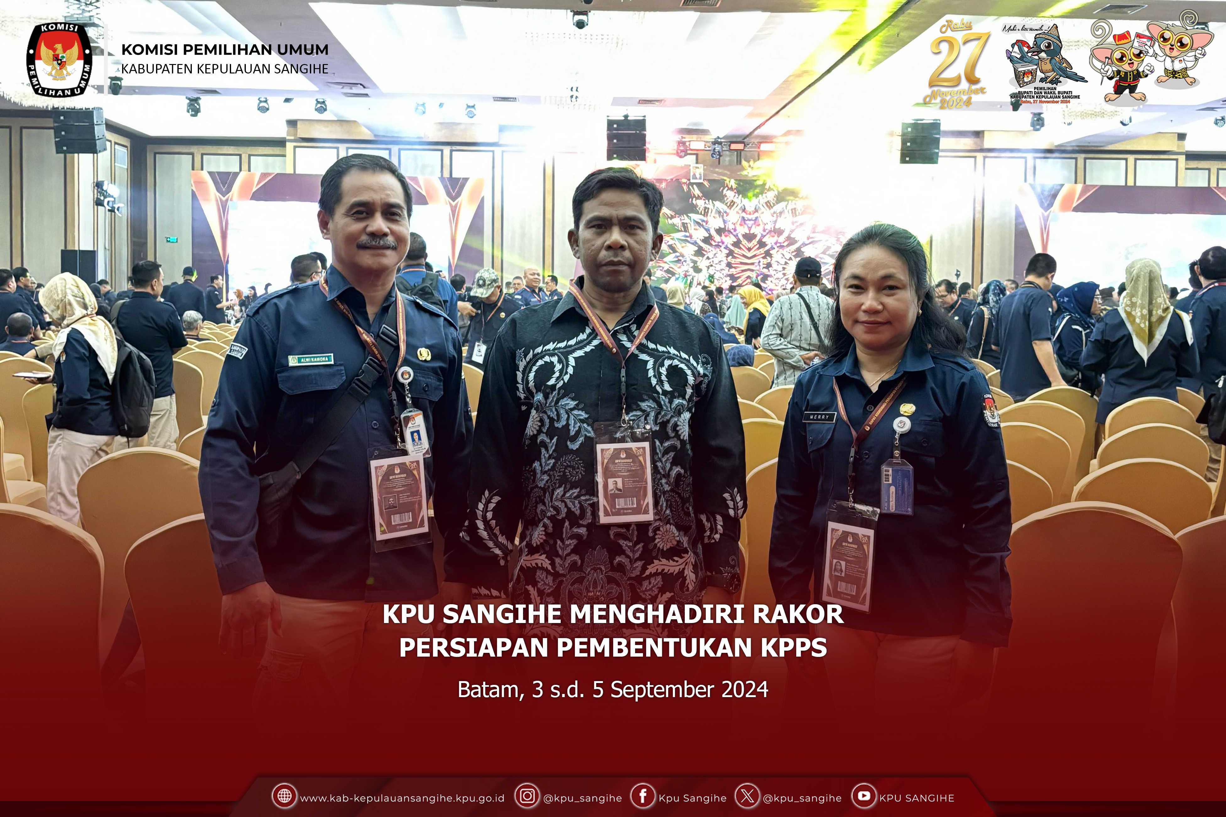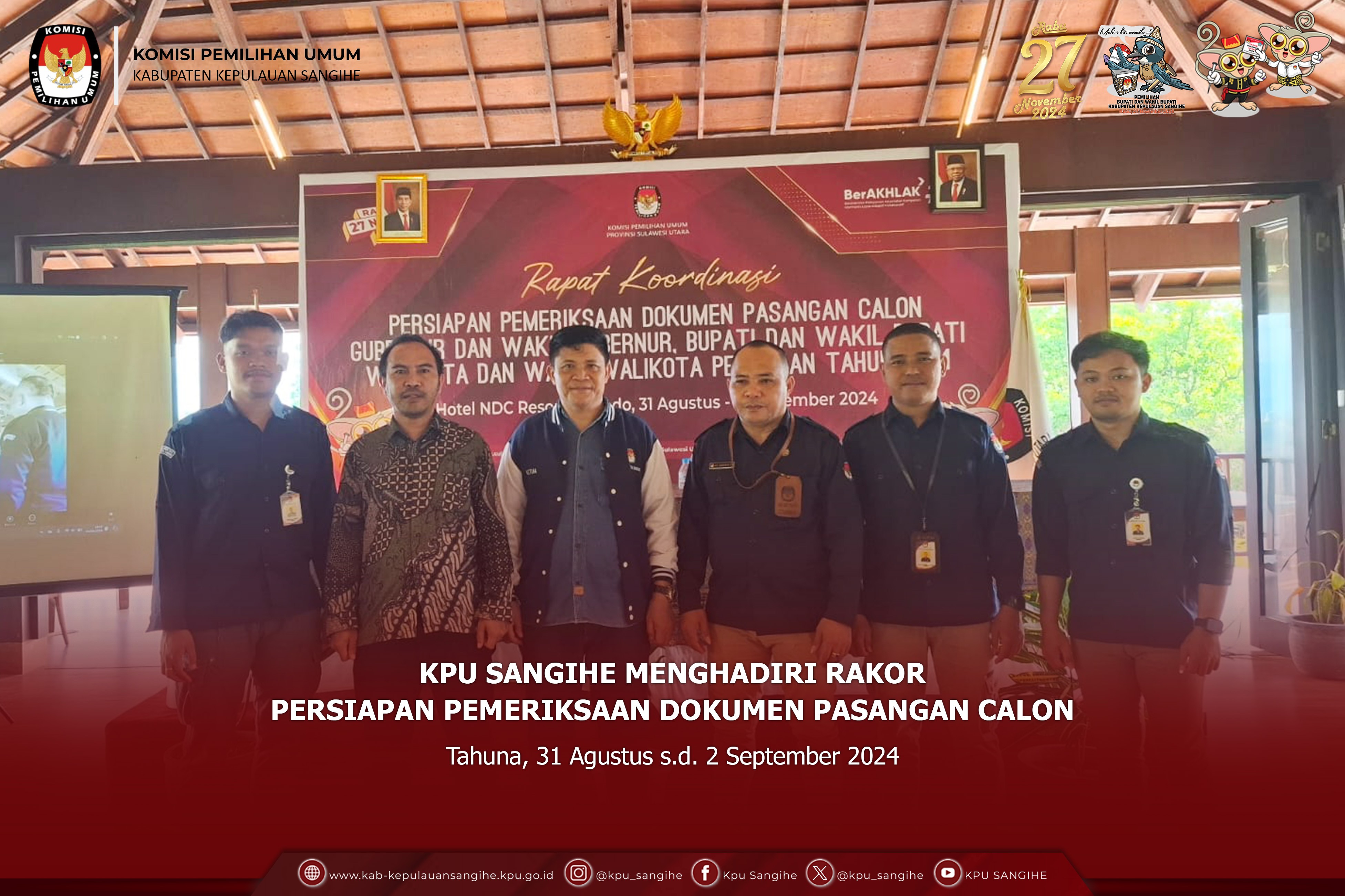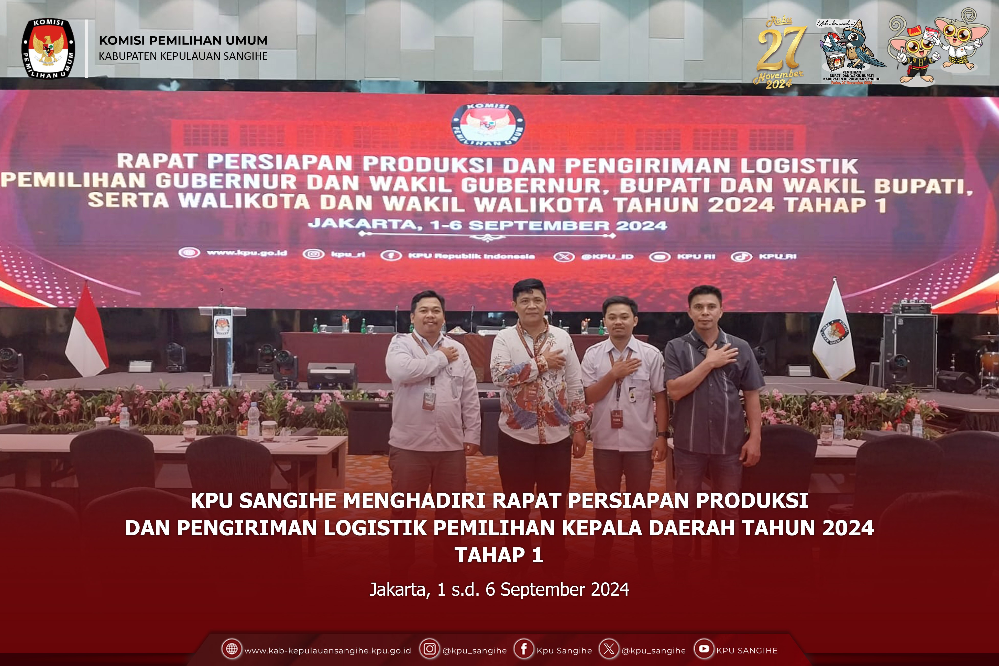 Jakarta, kab-kepulauansangihe.kpu.go.id - KPU Sangihe menghadiri Rapat Persiapan Produksi dan Pengiriman Logistik Pemilihan Gubernur dan Wakil Gubernur, Bupati dan Wakil Bupati, serta Walikota dan Wakil Walikota Tahun 2024 Tahap 1. Minggu s.d. Jumat (1-6/9/2024). Ketua KPU Mochammad Afifuddin, Anggota KPU Yulianto Sudrajat, dan August Mellaz bersama Sekretaris Jenderal KPU Bernad Dermawan Sutrisno menutup kegiatan Rapat Persiapan Produksi dan Pengiriman Logistik Pemilihan Gubernur dan Wakil Gubernur, Bupati dan Wakil Bupati, serta Walikota dan Wakil Walikota Tahun 2024 Tahap I yang dilaksanakan di Jakarta. Pada sambutannya, Drajat mengingatkan bahwa proses tahapan logistik semakin pendek. Drajat juga menegaskan bahwa pilkada kali ini kewenangan ada di KPU provinsi dan KPU kabupaten/kota, sedangkan KPU sebagai penanggungjawab akhir. Sedangkan Mellaz menyampaikan bahwa KPU provinsi harus tetap memperhatikan KPU kabupaten/kota dibawahnya. Karena kewenangan pilkada ini berada di KPU provinsi dan KPU kabupaten/kota, seperti halnya KPU lakukan untuk melayani stakeholder terkait. Sementara itu, Bernad juga menjelaskan bahwa kewenangan Ketua KPU provinsi dan KPU kabupaten/kota untuk menetapkan standar kebutuhan, sedangkan sekretariat bertanggung jawab dalam proses produksi dan distribusi. Untuk itu, sangat dibutuhkan kerja sama komulatif antara komisioner dan sekretariat. Adapun yang menghadiri rapat yaitu Ketua KPU Sangihe ABSAN R. TAHENDUNG, PPKOM Bpk. RAHMAT H. MUHADJIR dan YOSUA KAKASE.