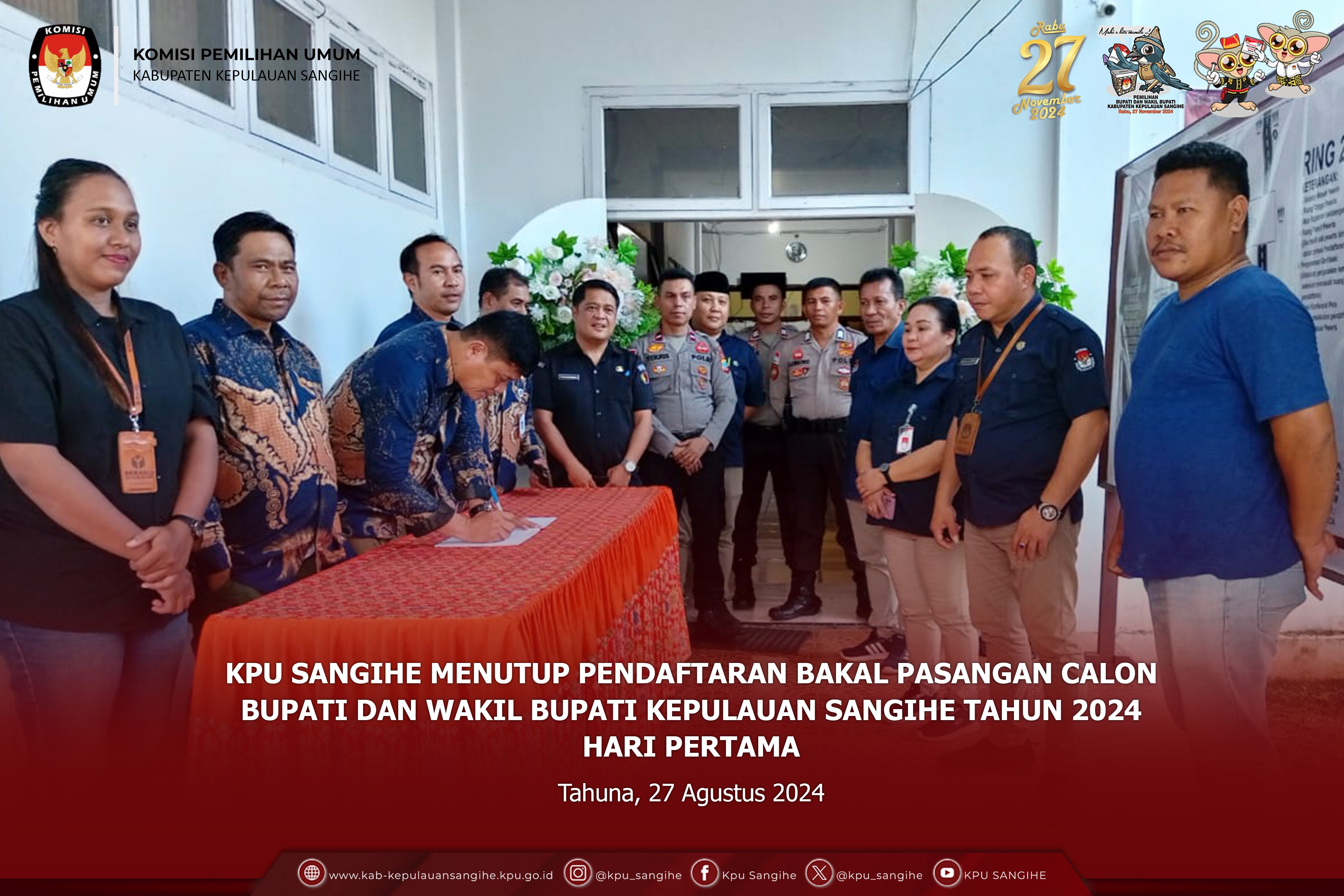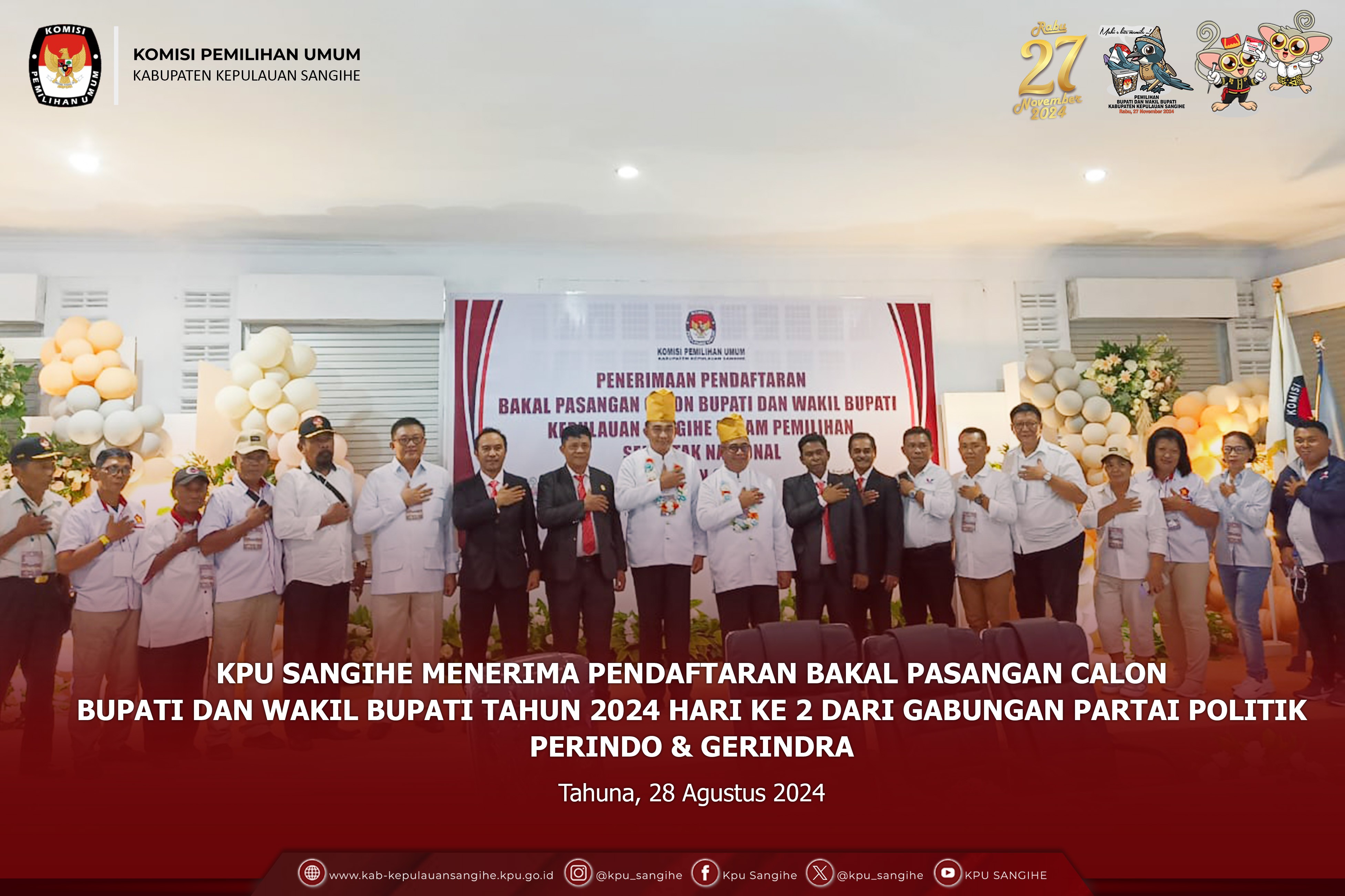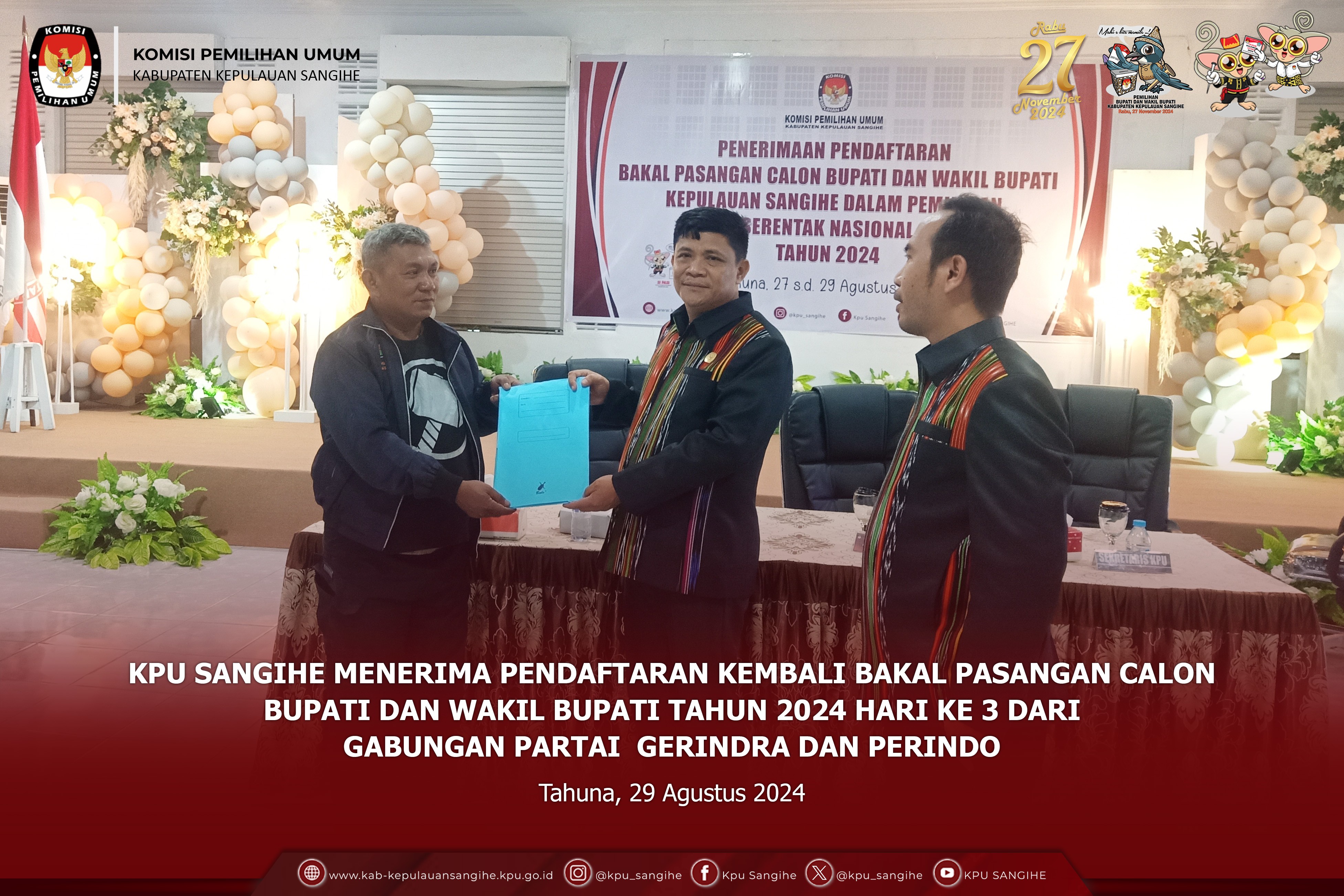 Pada penerimaan hari ini, KPU Sangihe menerima Pendaftaran dari Gabungan Partai Gerindra dan Perindo pada Pukul 17.05 (Sesuai dengan waktu registrasi) dan Dokumen diserahkan Oleh LO Pasangan Calon.