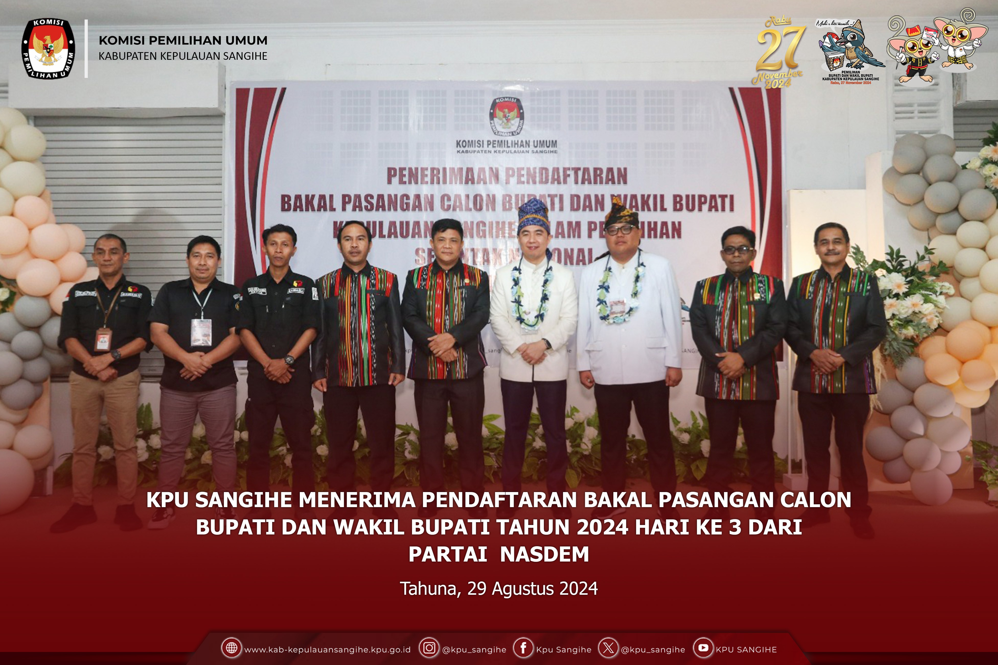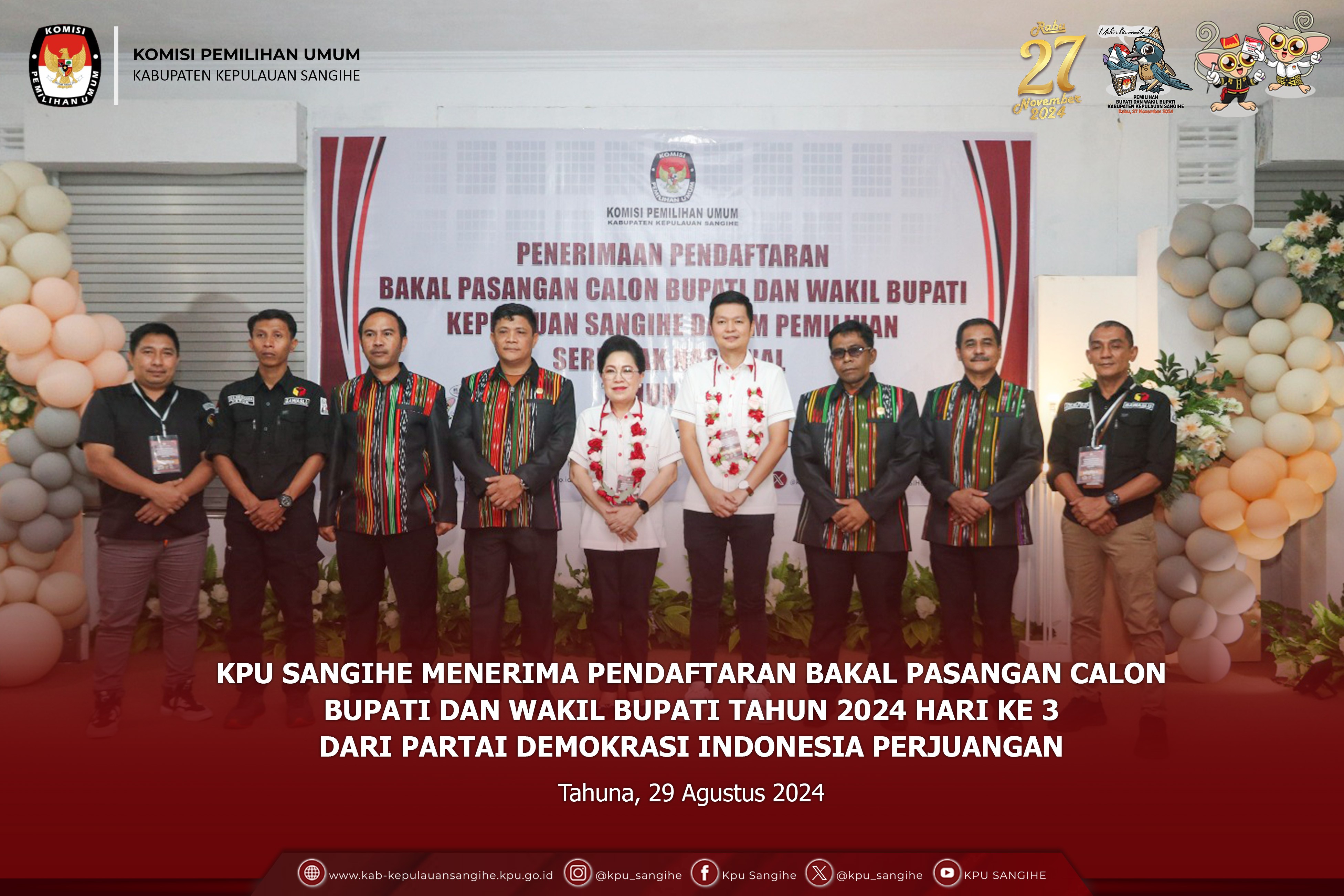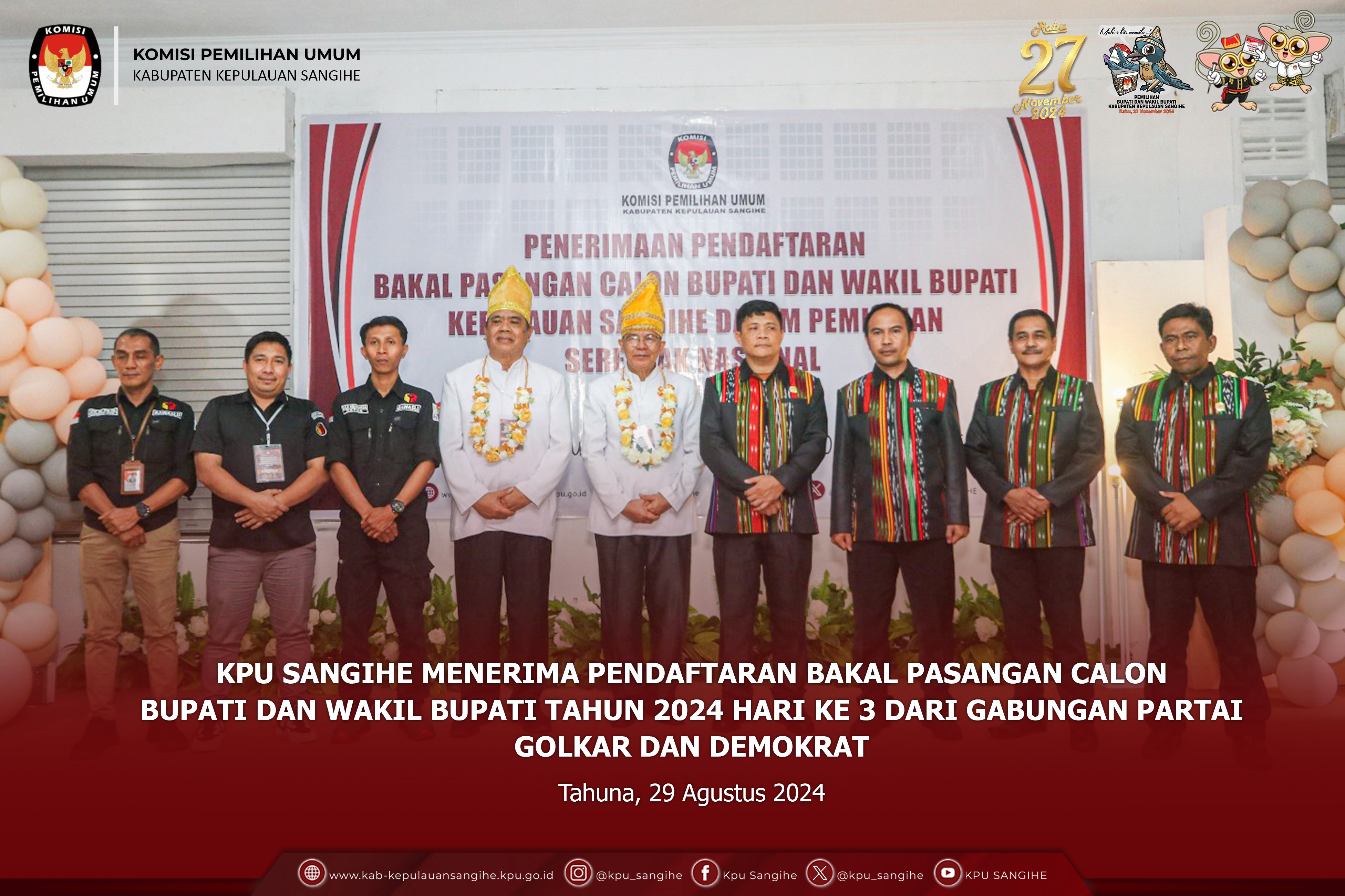Tahuna, kab-kepulauansangihe.kpu.go.id - KPU Sangihe menerima Pendaftaran KembaliBakal Pasangan Calon Bupati dan Wakil Bupati Tahun 2024 pada Hari ke 3. Kamis (29/8/2024).