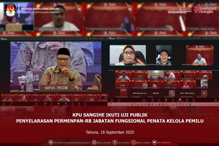 Tahuna, kab-kepulauansangihe.kpu.go.id – Komisi Pemilihan Umum (KPU) Kabupaten Kepulauan Sangihe mengikuti kegiatan Uji Publik Penyelarasan PermenPAN-RB Jabatan Fungsional Penata Kelola Pemilu dengan Terbitnya PermenPAN-RB Nomor 1 Tahun 2023 yang diselenggarakan oleh KPU Republik Indonesia secara daring. Kamis, 18 September 2025. Kegiatan ini diikuti oleh Plt. Sekretaris KPU Sangihe, Bapak Jelly Kantu, dan Pejabat Fungsional Penata Kelola Pemilu, Bapak Adolf Katiandagho. Adapun rangkaian kegiatan yang dilaksanakan meliputi: 1. Pemaparan Uji Publik dan Diskusi bersama KPU, Kementerian PAN-RB, serta Badan Kepegawaian Negara (BKN). 2. Panduan dan Pelaksanaan Kuisioner untuk kebutuhan penyusunan program pelatihan Jabatan Fungsional Penata Kelola Pemilu. Pelaksanaan uji publik ini bertujuan untuk menyelaraskan regulasi terkait jabatan fungsional Penata Kelola Pemilu dengan aturan terbaru sesuai PermenPAN-RB Nomor 1 Tahun 2023, sekaligus memperkuat kapasitas kelembagaan KPU melalui pengembangan kompetensi pejabat fungsional. Dengan mengikuti kegiatan ini, KPU Sangihe berharap dapat terus meningkatkan kualitas tata kelola kelembagaan serta mendukung profesionalitas pejabat fungsional Penata Kelola Pemilu dalam rangka mewujudkan penyelenggaraan Pemilu yang lebih efektif, efisien, dan akuntabel.