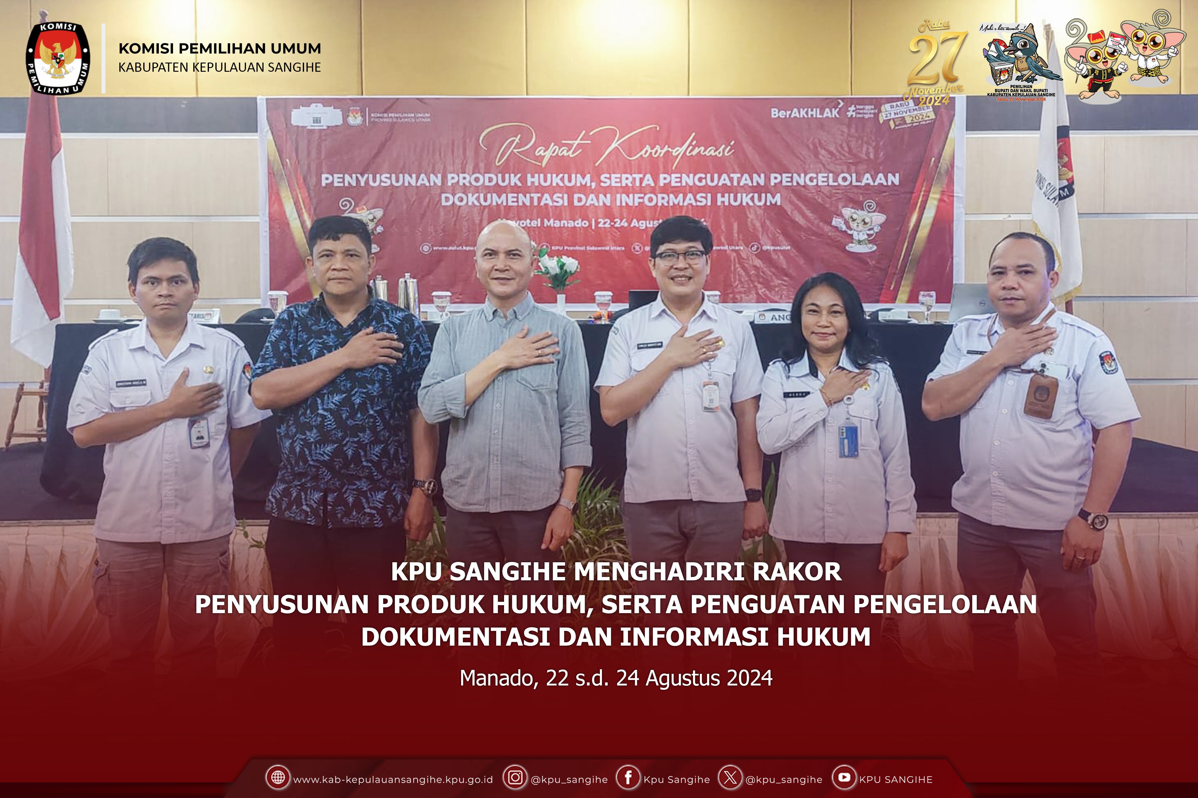 Tahuna, kab-kepulauansangihe.kpu.go.id - KPU Sangihe menghadiri Rapat Koordinasi (Rakor) Penyusunan Produk Hukum dan Penguatan Pengelolaan Dokumentasi serta Informasi Hukum yang digelar KPU Provinsi Sulawesi Utara di Novotel Manado Golf Resort & Convention Center. Kamis s.d. Sabtu (22-24/8/2024).