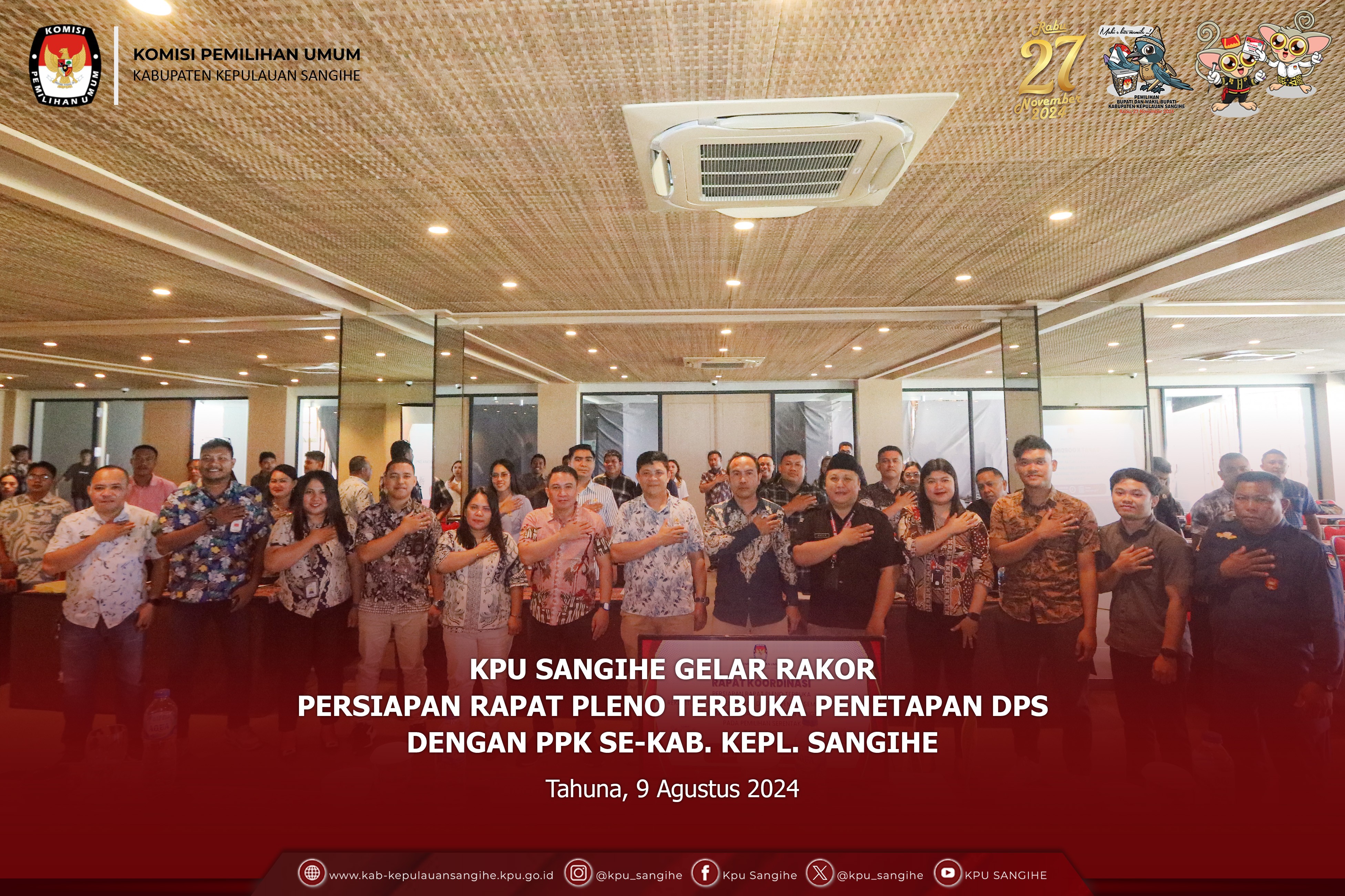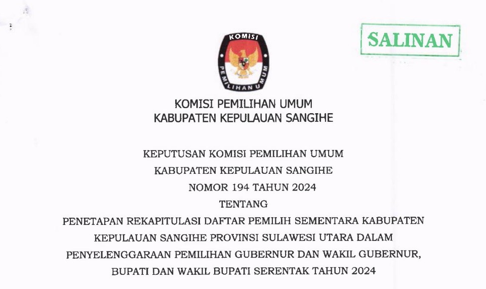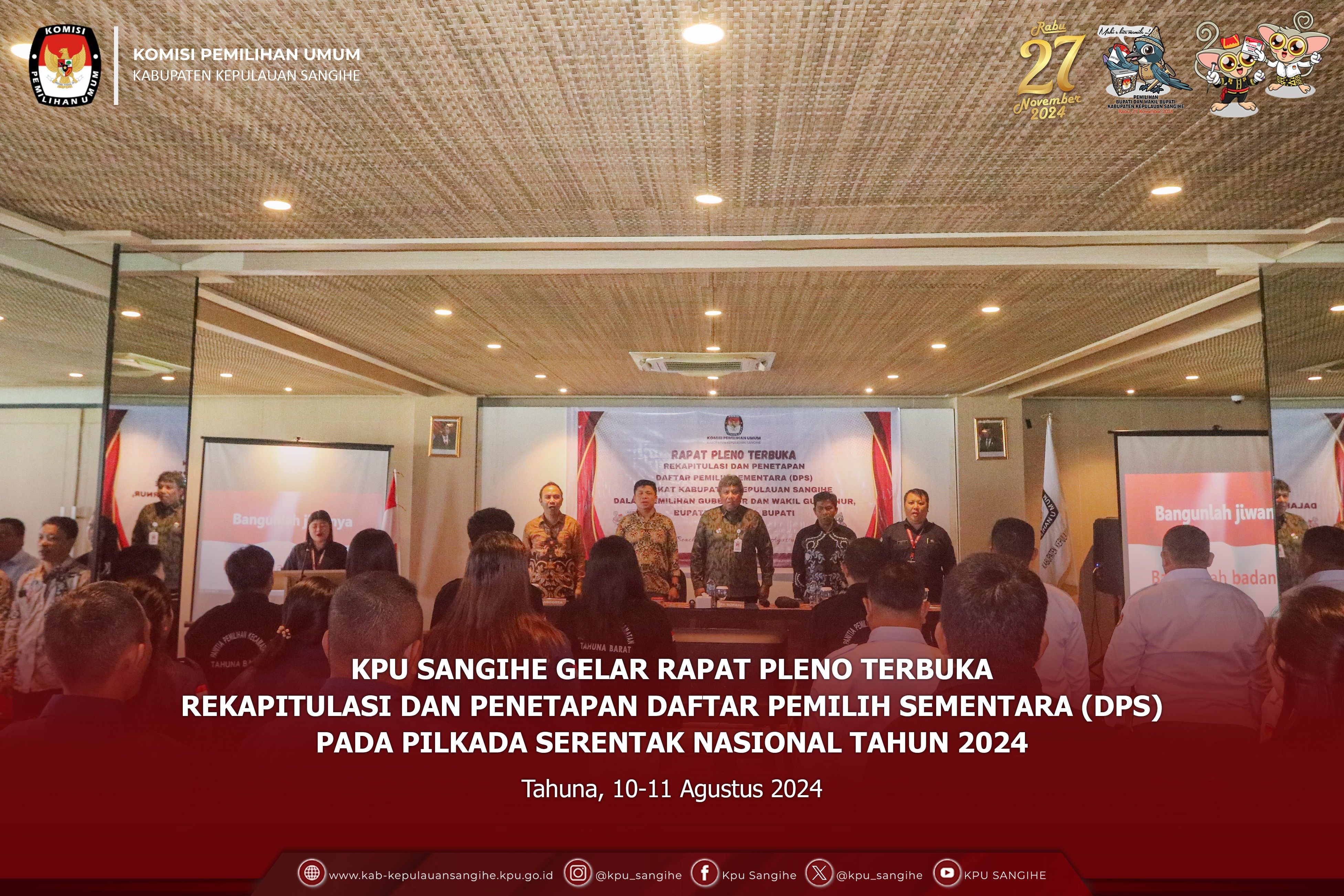 Tahuna, kab-kepulauansangihe.kpu.go.id - KPU Sangihe menggelar Rapat Pleno Terbuka Rekapitulasi dan Penetapan Daftar Pemilih Sementara (DPS) pada Pemilihan Gubernur dan Wakil Gubernur, Bupati dan Wakil Bupati Tahun 2024. Sabtu s.d. Minggu (10-11/8/2024). Bertempat di Tahuna Beach Hotel & Resort, KPU Sangihe menggelar Rapat Pleno Terbuka Rekapitulasi dan Penetapan Daftar Pemilih Sementara (DPS) pada Pemilihan Gubernur dan Wakil Gubernur, Bupati dan Wakil Bupati Tahun 2024 mulai Tanggal 10-11 Agustus 2024. Adapun uraian sebagai berikut : Pada hari Minggu tanggal Sebelas bulan Agustus tahun Dua Ribu Dua Puluh Empat bertempat di Tahuna, KPU Kabupaten Kepulauan Sangihe telah melaksanakan Rapat Pleno Terbuka Rekapitulasi Daftar Pemilih Sementara (DPS) Tingkat Kabupaten Kepulalauan Sangihe untuk Pemilihan Gubernur dan Wakil Gubernur dan Pemilihan Bupati dan Wakil Bupati Tahun 2024. Dalam Rapat tersebut, KPU Kabupaten Kepulauan Sangihe menetapkan Rekapitulasi Daftar Pemilih Sementara (DPS) Tingkat Kabupaten Kepulauan Sangihe dengan rincian sebagai berikut: 1. Rekapitulasi Daftar Pemilih Sementara JUMLAH KECAMATAN : 15 JUMLAH DESA/KELURAHAN : 167 JUMLAH TPS : 306 JUMLAH PEMILIH LAKI-LAKI : 53625 JUMLAH PEMILIH PEREMPUAN : 52815 JUMLAH PEMILIH L+P : 106440 2. Menerima Masukan dari Bawaslu Kabupaten Kepulauan Sangihe. Turut Hadir dalam Rapat Pleno : 1. Pj. Bupati Kabupaten Kepulauan Sangihe 2. Ketua dan Anggota KPU Sangihe 3. Bawaslu Kabupaten Kepulauan Sangihe 4. Kejaksaan Negeri Kabupaten Kepulauan Sangihe 5. Pengadilan Negeri Tahuna 6. Kapolres Kepulauan Sangihe 7. Danlanal Tahuna 8. Dandim 1301 Sangihe (diwakili) 9. Plt Kadis Dukcapil Kabupaten Kepulauan Sangihe 10. Kaban Kesbangpol Kabupaten Kepulauan Sangihe 11. Kalapas Kelas IIB Tahuna 12. Pejabat Fungsional KPU Sangihe (Plh. Sekretaris) 13. Para Kasubag KPU Sangihe 14. Staf Sekretariat KPU Sangihe 15. Ketua dan Anggota se- Kabupaten Kepulauan Sangihe