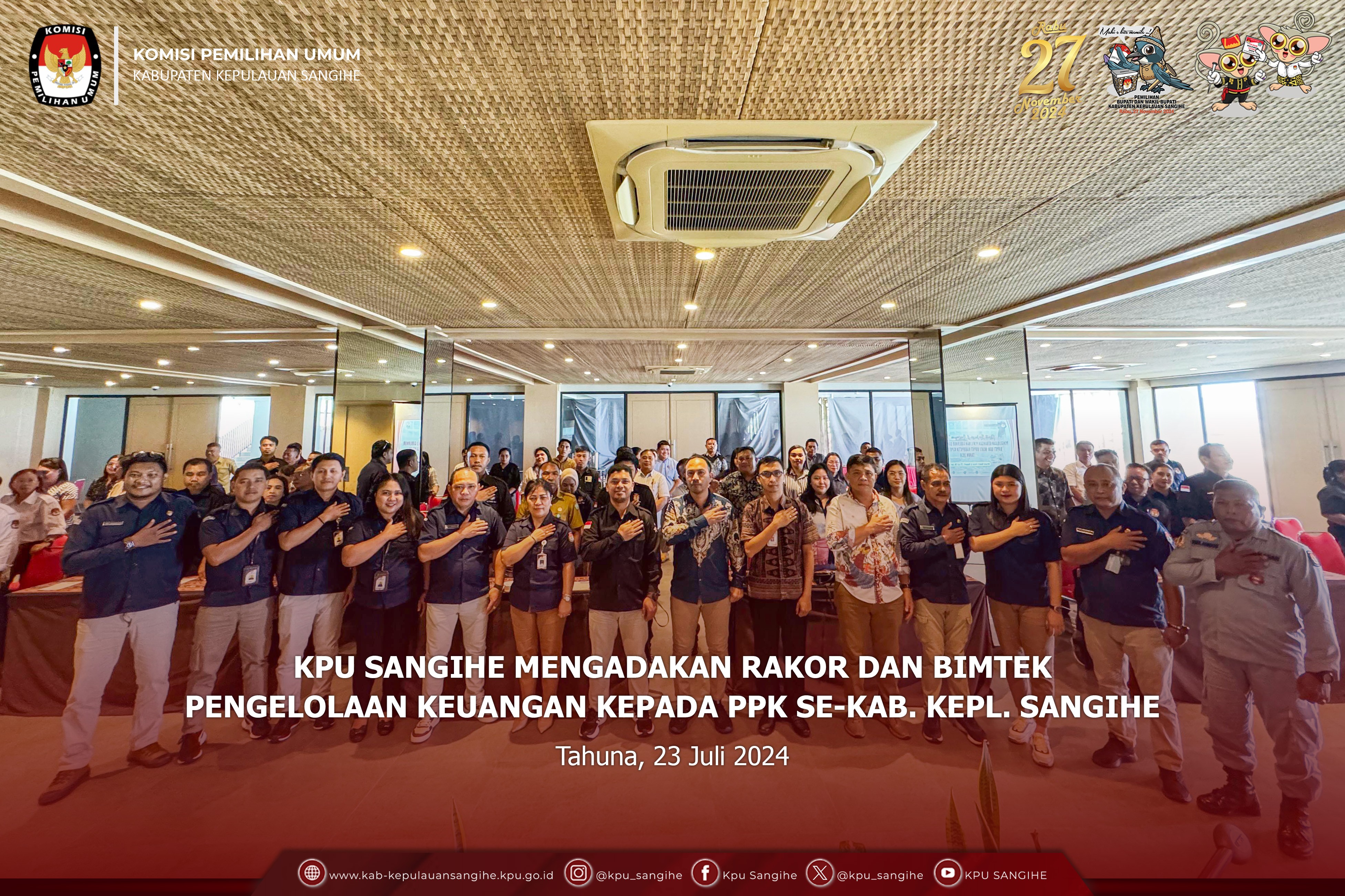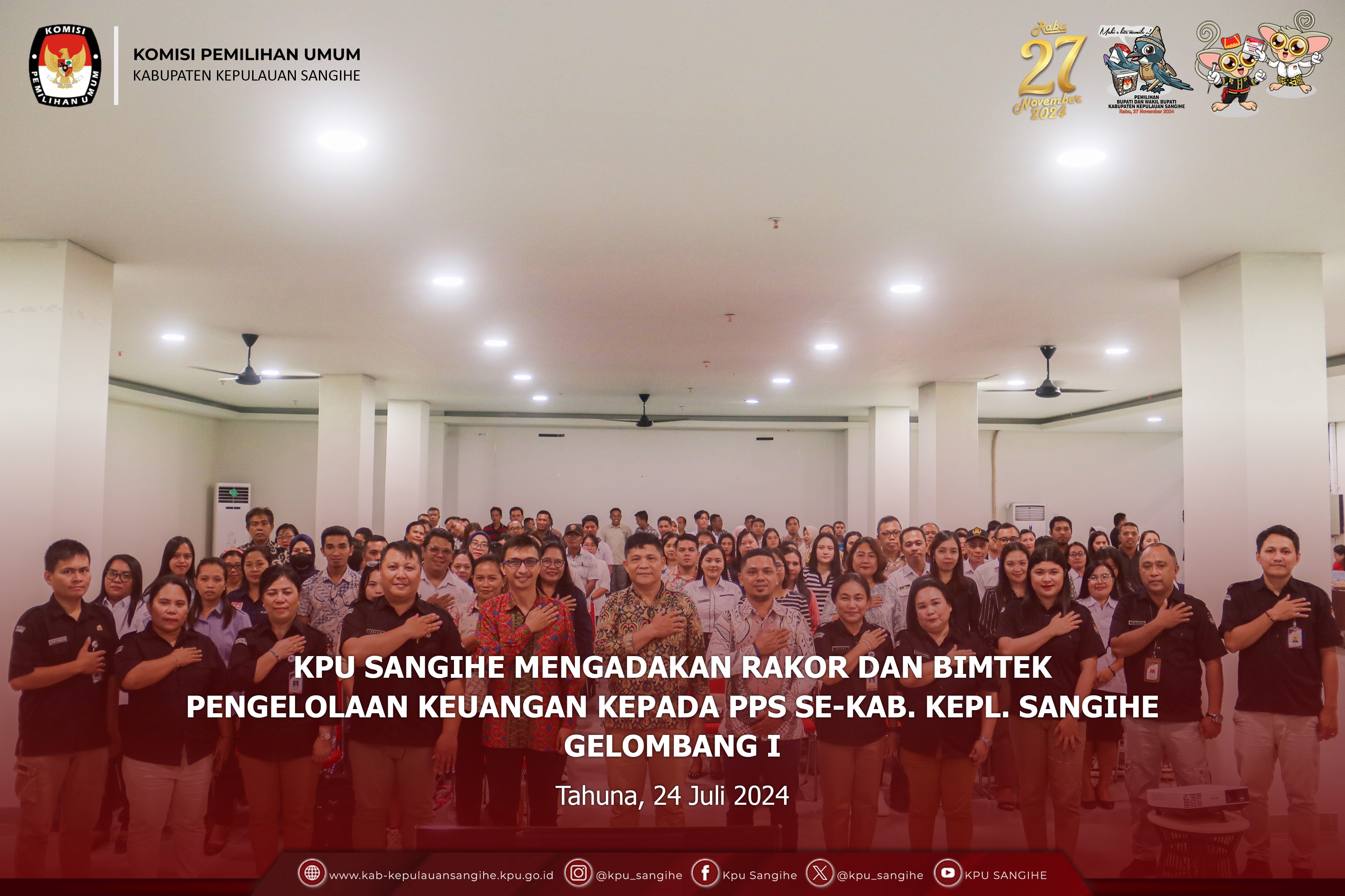 Tahuna, kab-kepulauansangihe.kpu.go.id - KPU Sangihe mengadakan Rapat Koordinasi dan Bimbingan Teknis Pengelolaan Keuangan Pemilihan Gubernur dan Wakil Gubernur, Bupati dan Wakil Bupati Kabupaten Kepulauan Sangihe Tahun 2024 dengan Ketua dan Sekretaris PPS se Kab. Kepl. Sangihe Gelombang I. Rabu (24/7/2024). .Kegiatan dilaksanakan di Tahuna Beach Hotel & Resort pada Tanggal 24 Juli 2024. Ketua KPU Sangihe Bpk. Absan R. Tahendung dalam sambutannya menegaskan kepada peserta agar dapat menyimak dengan baik setiap penyampaian dari Narasumber agar supaya dalam pertanggungjawaban keuangan kedepan tidak mengalami hambatan. Kegiatan dihadiri secara luring & daring via zoom meeting oleh Narasumber yang berkompeten dibidangnya. Adapun yang menjadi peserta yaitu Ketua dan Sekretaris PPS Kecamatan Manganitu, Tabukan Tengah, Tahuna, Tahuna Barat dan Tahuna Timur. Turut hadir pada kegiatan tersebut yaitu Ketua dan Anggota KPU Sangihe, Sekretaris, Pejabat Fungsional, Kasubag dan para Staf.