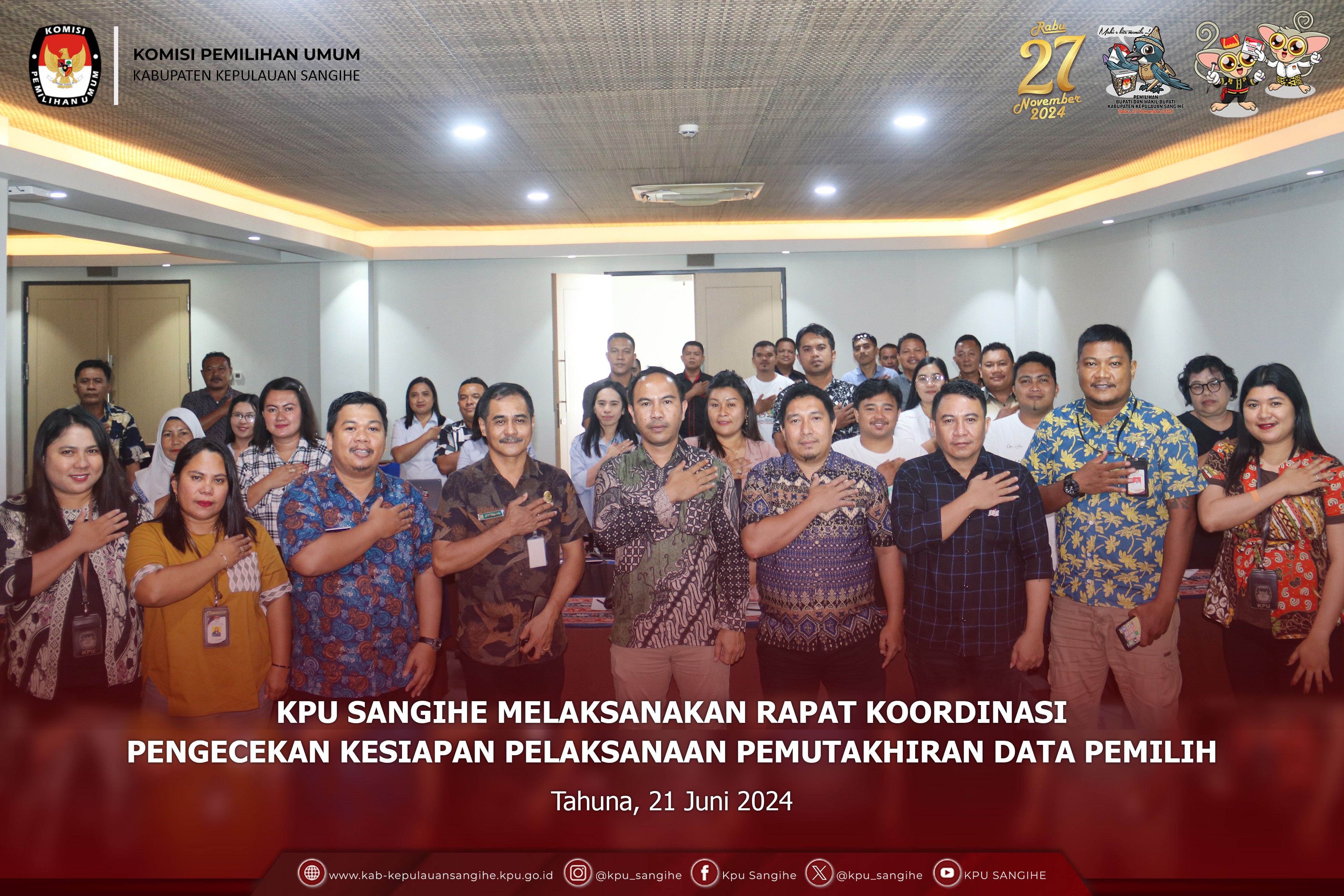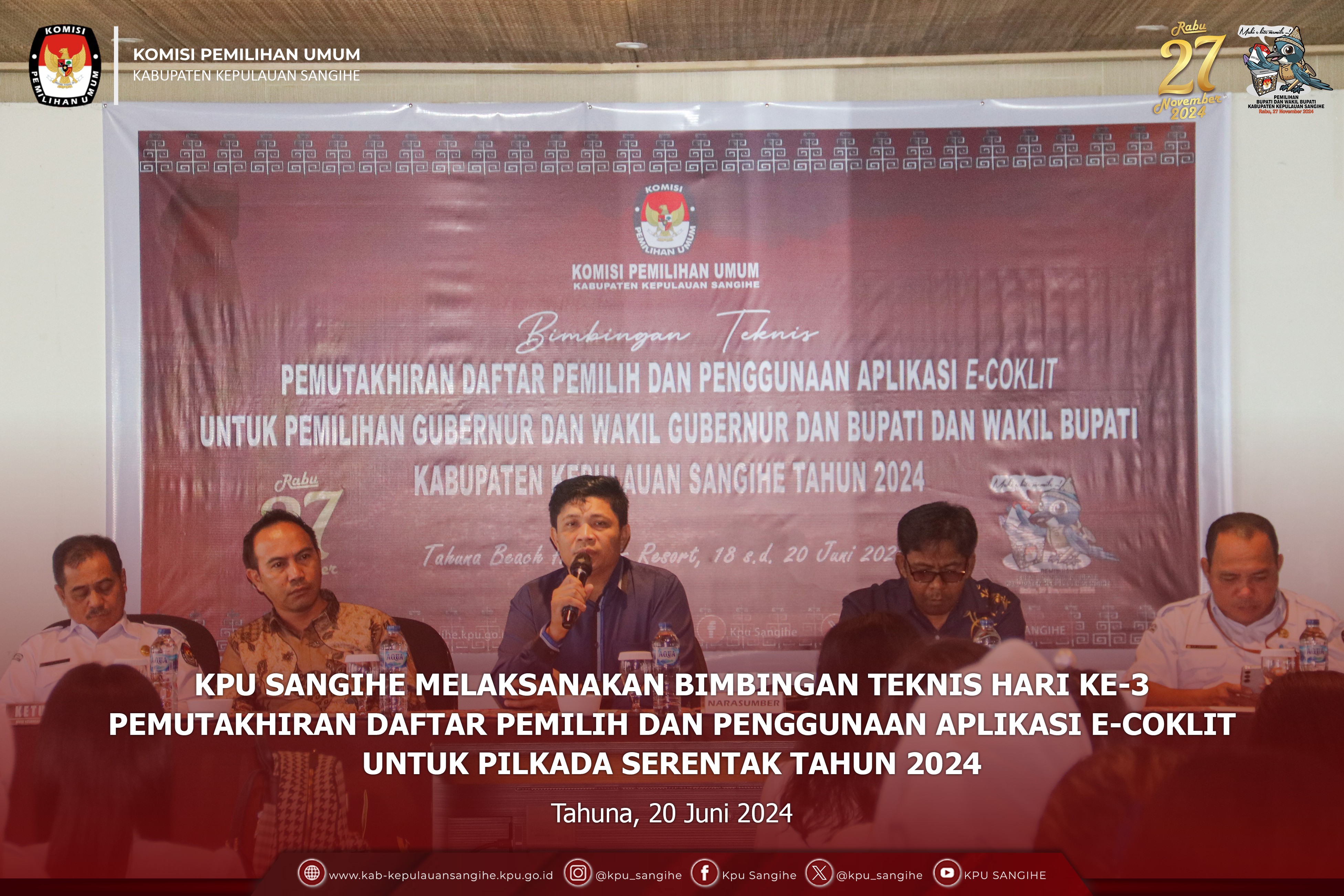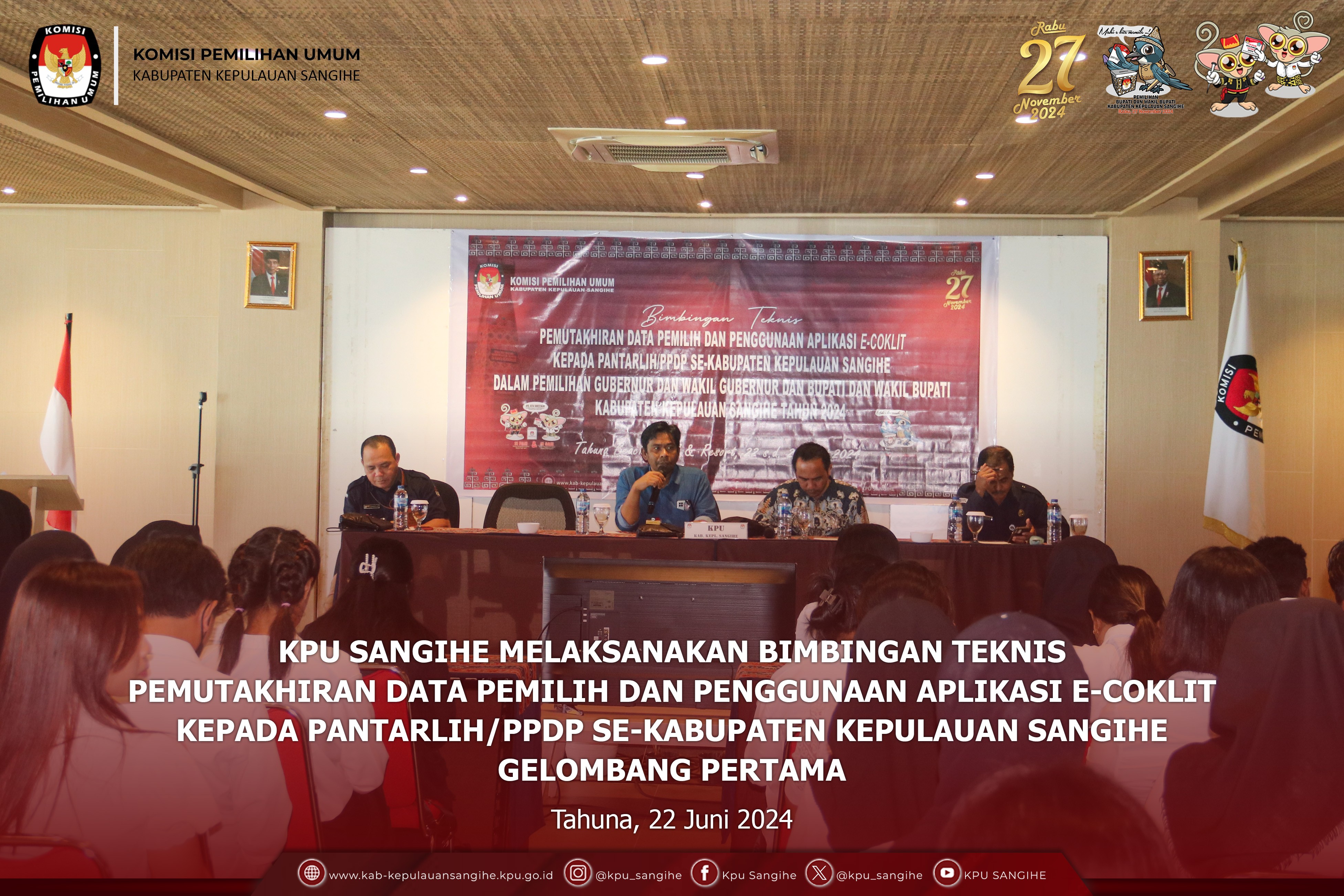 Tahuna, kab-kepulauansangihe.kpu.go.id - KPU Sangihe melaksanakan Bimbingan Teknis Pemutakhiran Data Pemilih dan Penggunaan Aplikasi E-Coklit kepada Pantarlih/PPDP se-Kabupaten Kepulauan Sangihe untuk Pemilihan Gubernur dan Wakil Gubernur dan Bupati dan Wakil Bupati Kabupaten Kepulauan Sangihe Tahun 2024 Gelombang I. Sabtu (22/6/2024). Bertempat di Tahuna Beach Hotel & Resort, KPU Sangihe melaksanakan Bimbingan Teknis Pemutakhiran Data Pemilih dan Penggunaan Aplikasi E-Coklit kepada Pantarlih/PPDP se-Kabupaten Kepulauan Sangihe untuk Pemilihan Gubernur dan Wakil Gubernur dan Bupati dan Wakil Bupati Kabupaten Kepulauan Sangihe Tahun 2024 Gelombang I. Bimtek dilaksanakan sejak Pukul 09.00 Wita s.d. 18.00 Wita Peserta Bimtek yaitu Calon Pantarlih/PPDP dari Kecamatan Kendahe, Manganitu, Manganitu Selatan, Nusa Tabukan, Tabukan Selatan Tengah, Tabukan Selatan Tenggara, Tabukan Utara, dan Tatoareng. Calon Pantarlih/PPDP mengikuti kegiatan BIMBINGAN TEKNIS tentang penyusunan Daftar Pemilih yang dilakukan oleh KPU Kabupaten/Kota dengan tujuan agar MENGETAHUI DAN MEMAHAMI hal-hal sebagai berikut: jadwal dan tahapan pelaksanaan Coklit; dokumen dan perlengkapan Coklit; penyusunan rencana kerja Pantarlih; tata cara pelaksanaan Coklit; tata cara pengisian formulir Model A-Daftar Pemilih, Model A-Daftar Potensial Pemilih, Model A-Laporan Hasil Coklit, dan Model A-Tanda Bukti Terdaftar; tata cara pemasangan e-Coklit dan pendaftaran akun; tata cara penggunaan e-Coklit; pelindungan data pribadi pemilih; dan pakta integritas penyelenggara Pemilu. Adapun yang menjadi Narasumber, yaitu : - Abdulah Makitulung, M.Pd.I selaku Pimpinan Bawaslu Kab. Kepl. Sangihe Kordiv HP2H dengan Materi "Peran Bawaslu dalam Pengawasan Pemutakhiran Data Pemilih, Pemilihan Serentak Tahun 2024"; - Ihsan F. Panawar, S.Kom selaku Anggota KPU Sangihe Divisi Rendatin; dan - Rahmat H. Muhadjir, S.IP selaku Admin/Operator SIDALIH.