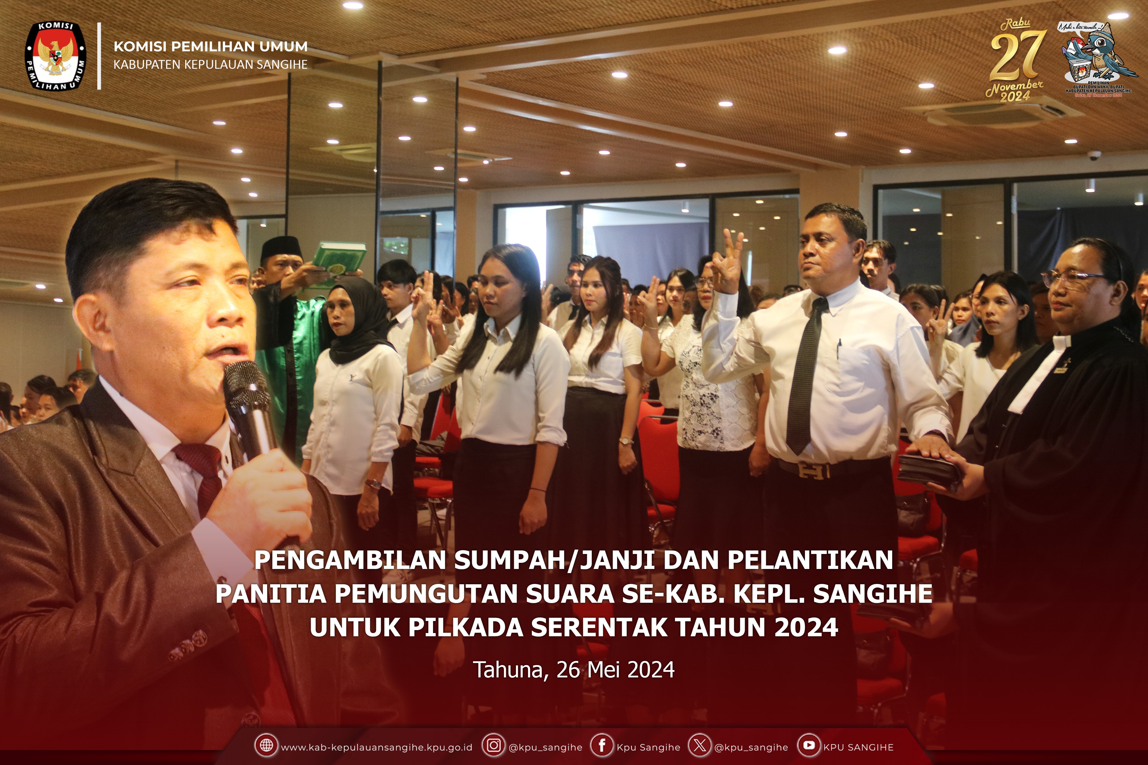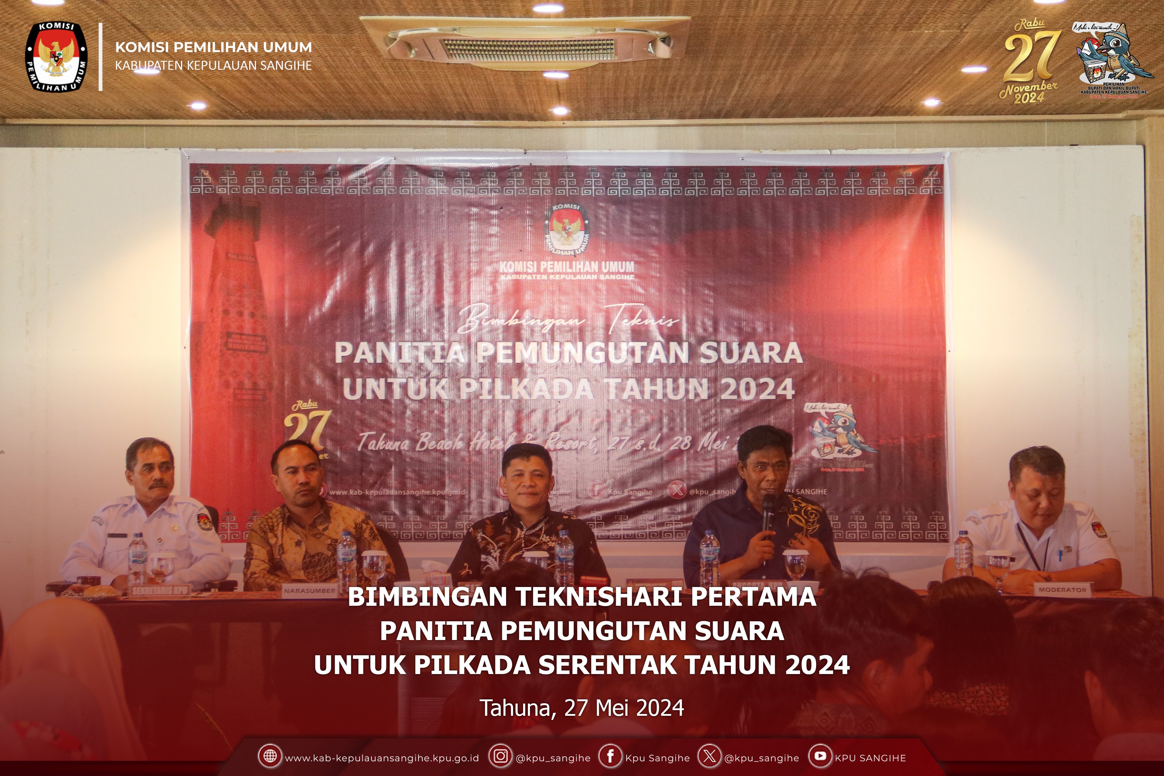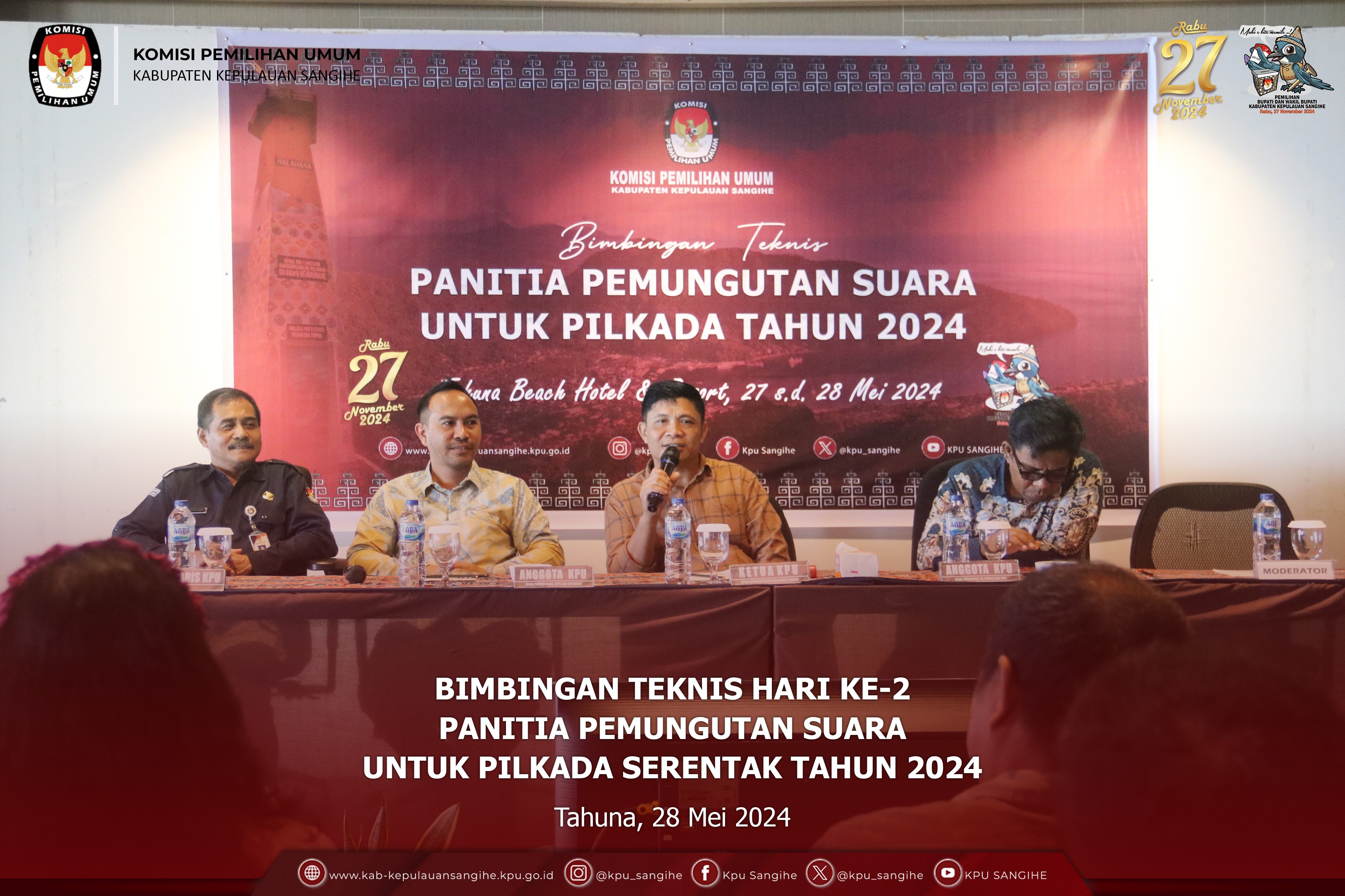 Tahuna, kab-kepulauansangihe.kpu.go.id - KPU Sangihe melaksanakan Bimbingan Teknis Hari ke-2 kepada 264 Angota Panitia Pemungutan Suara dari 7 Kecamatan untuk Pilkada Serentak Tahun 2024 yang dilaksanakan di Tahuna Beach Hotel & Resort. Selasa (28/5/2024). Ketua KPU Sangihe Bpk. Absan R. Tahendung membuka secara resmi Pelaksanaan Bimbingan Teknis Hari Pertama kepada Panitia Pemungutan Suara untuk Pilkada Serentak Tahun 2024, dalam Sambutan dan Arahannya, Ketua menegaskan kepada para PPS agar apa yang di dapat pada pelaksanaan Bimtek hari ini kiranya dapat diimplementasikan dalam pelaksanaan Pilkada kedepan. Kemudian arahan dilanjutkan oleh Kadiv Sosdiklih, Partisipasi dan SDM Bpk. Iklam Patonaung, "Separuh Tugas KPU Sangihe dipercayakan kepada Bapak/Ibu Anggota PPS, jadi diharapkan untuk kooperatif dan saling bekerjasama agar terlaksananya Tahapan yang Aman dan Damai serta Suksesnya Pilkada Tahun 2024". Arahan kemudian dilanjutkan oleh Sekretaris KPU Sangihe Bpk. Alwi Kawoka, "Peran dan tanggungjawab PPS dalam Pelaksanaan Tahapan tidak lepas dari Pertanggungjawaban Administrasi Kegiatan dll. Diharapkan kerjasamanya agar dalam pelaksanaan Tahapan Pilkada kedepan boleh Sukses, Sukses dalam Penyelenggaraan Pilkada, maupun Sukses Pertanggungjawaban Administrasinya." Selanjutnya dalam pelaksanaan Bimtek, yang pertama menjadi Narasumber yaitu Ketua KPU Sangihe Bpk. Absan R. Tahendung dengan memaparkan materi berjudul "Tata Kerja PPS dalam Pilkada Tahun 2024". Kemudian Bimtek dilanjutkan oleh Kadiv Perencanaan, Data dan Informasi Bpk. Ihsan F. Panawar dengan memaparkan materi berjudul "Pembentukan Pantarlih/PPDP, KPPS dan Sekretariat PPS". Berikutnya Bimtek dilanjutkan oleh Ibu Elysee Ph. Sinadia eks Ketua KPU Sangihe sebagai Narasumber yang ke-2 dengan memaparkan 2 materi, masing-masing berjudul : - "Hubungan Kerja dan Peningkatan Kapasitas Penyelenggara pada Pilkada Tahun 2024"; dan - "Kode Etik dan Kinerja Badan Adhoc Pilkada Tahun 2024". Bimtek diikuti oleh 264 Anggota PPS dari 7 Kecamatan, masing-masing : - Kecamatan Manganitu; - Kecamatan Tabukan Selatan Tengah; - Kecamatan Tabukan Tengah; - Kecamatan Tabukan Utara; - Kecamatan Tahuna; - Kecamatan Tahuna Barat; dan - Kecamatan Tahuna Timur.