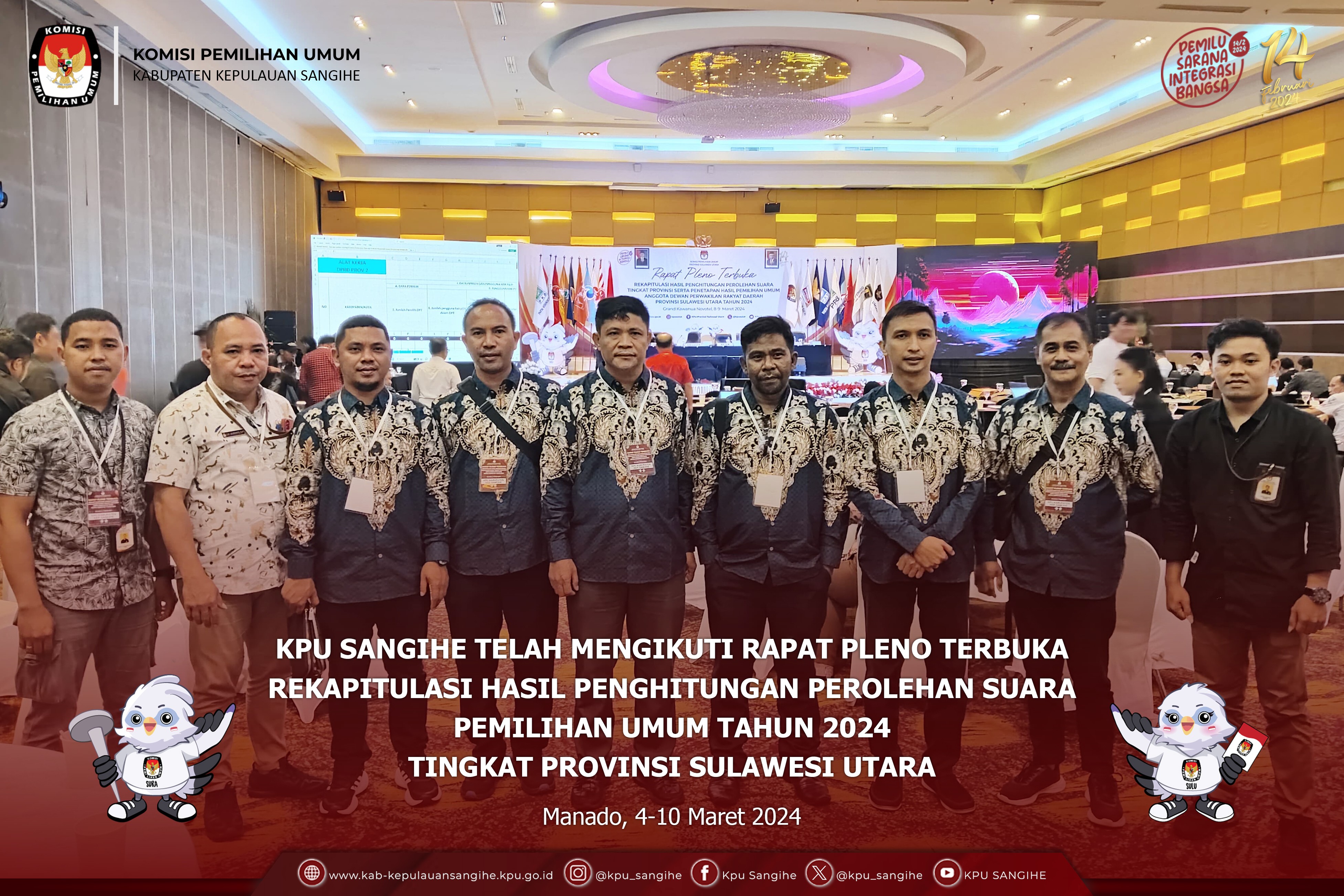 Manado, kab-kepulauansangihe.kpu.go.id - KPU Sangihe telah mengikuti Rapat Pleno Terbuka Rekapitulasi Hasil Penghitungan Perolehan Suara Pemilihan Umum tahun 2024 tingkat Provinsi Sulawesi Utara yang diselenggarakan di Grand Kawanua Convention Centre Manado. Senin s.d. Minggu (4-10/3/2024).