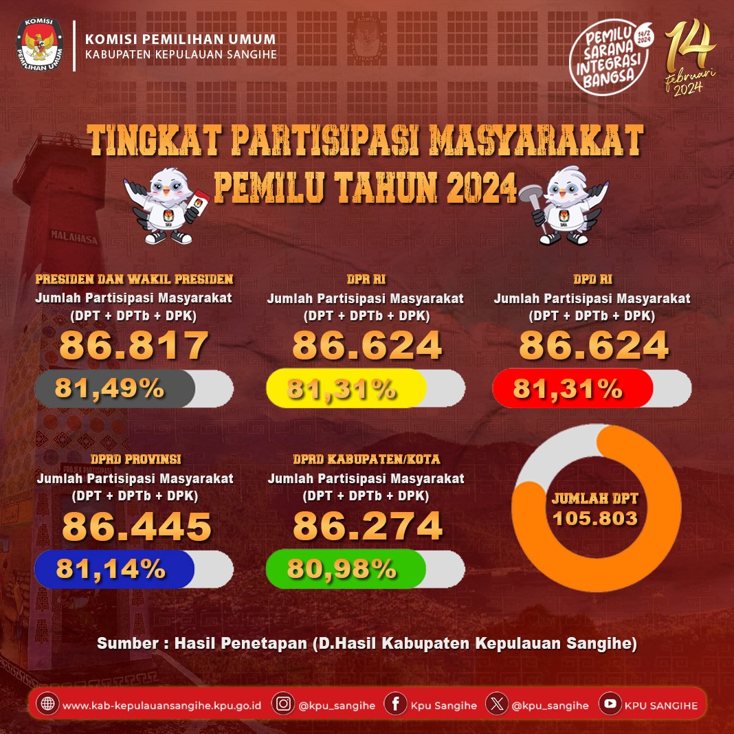 KPU Sangihe melakukan Presentasi Hasil pada tanggal 8 Maret 2024 dengan hasil Baik (SAH) walaupun sebelumnya mendapatkan koreksi dari Bawaslu namun semuanya itu dapat diselesaikan dengan baik, hingga akhirnya disetujui oleh pihak-pihak terkait.