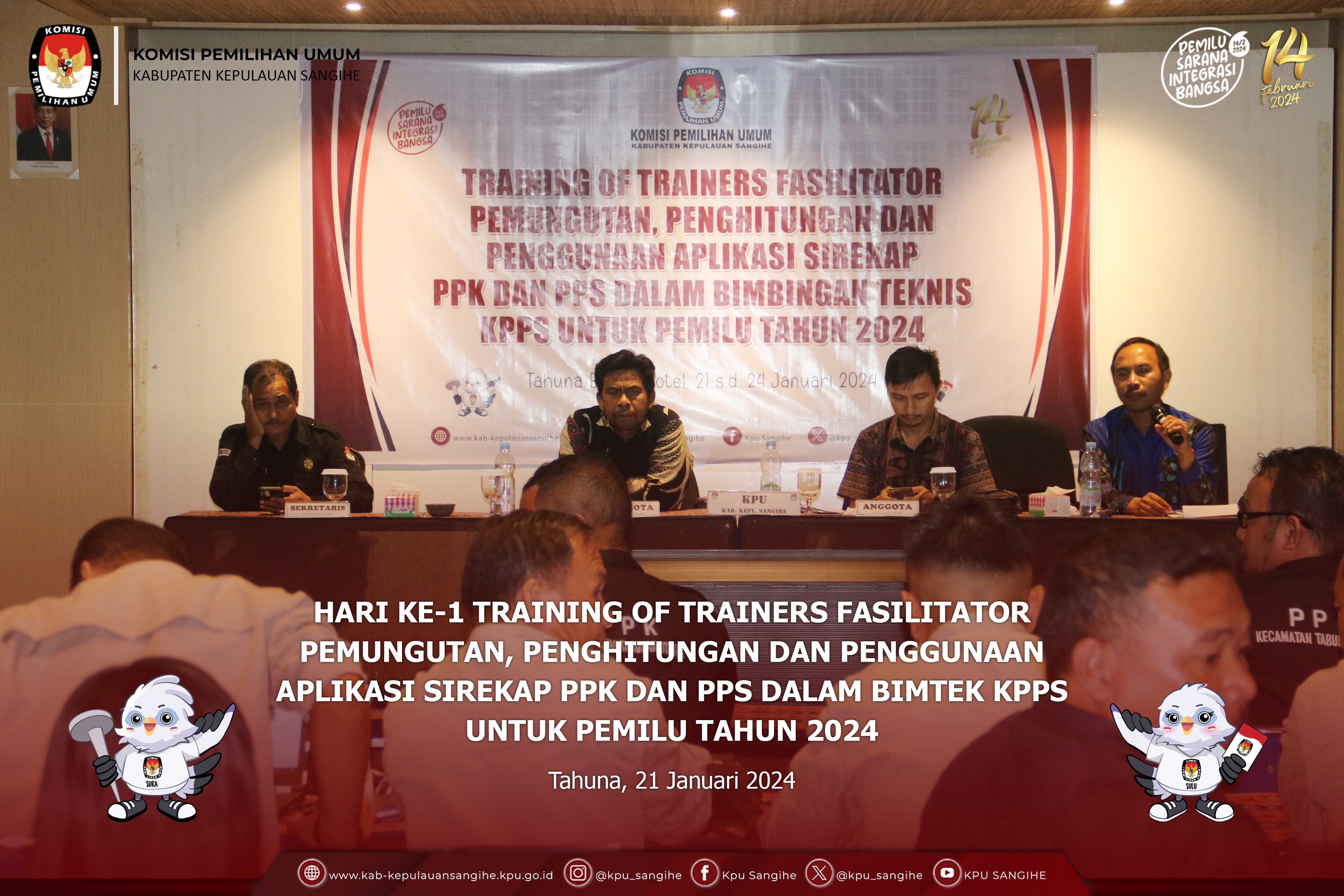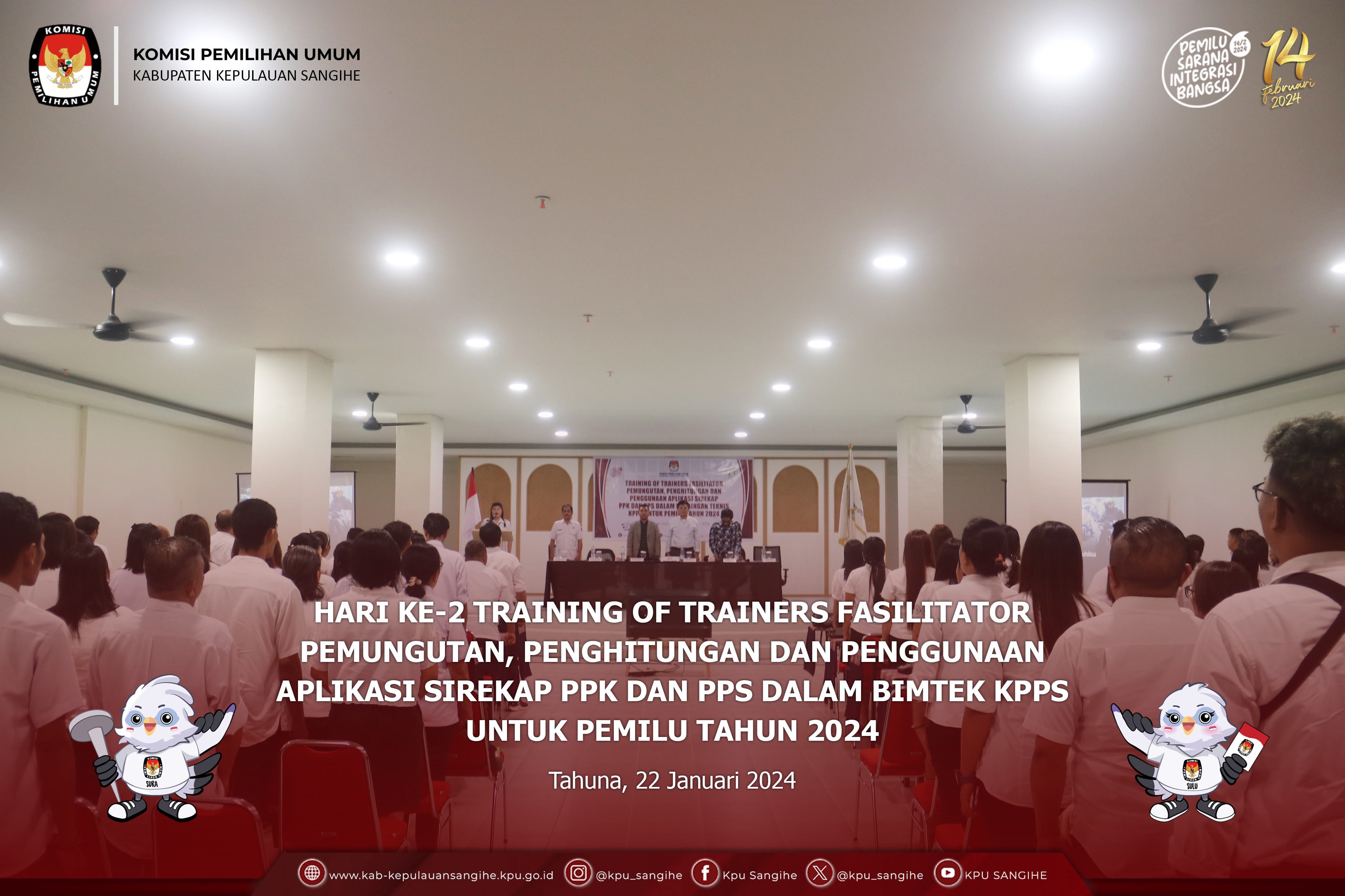 Tahuna, kab-kepulauansangihe.kpu.go.id - KPU Sangihe melaksanakan Training Of Trainers Fasilitator Pemungutan, Penghitungan dan Penggunaan Aplikasi Sirekap PPK dan PPS dalam Bimbingan Teknis KPPS untuk Pemilu Tahun 2024. Senin (22/1/2024).
