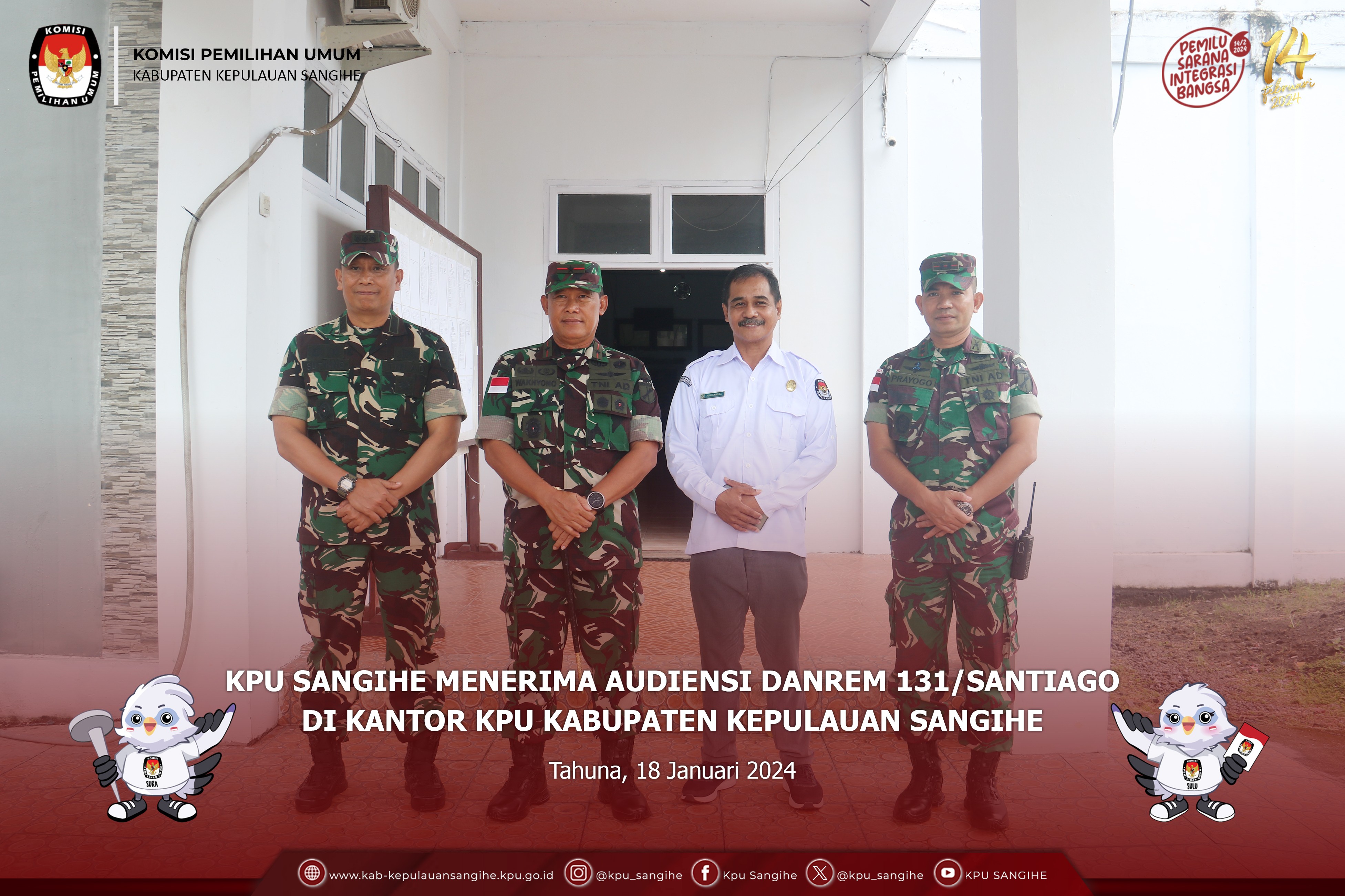 Tahuna, kab-kepulauansangihe.kpu.go.id - KPU Sangihe menerima Audiensi Danrem 131/Santiago Brigjen TNI Wakhyono, S.Sos., M.I.P di Kantor KPU Kabupaten Kepulauan Sangihe. Kamis (18/1/2024).
