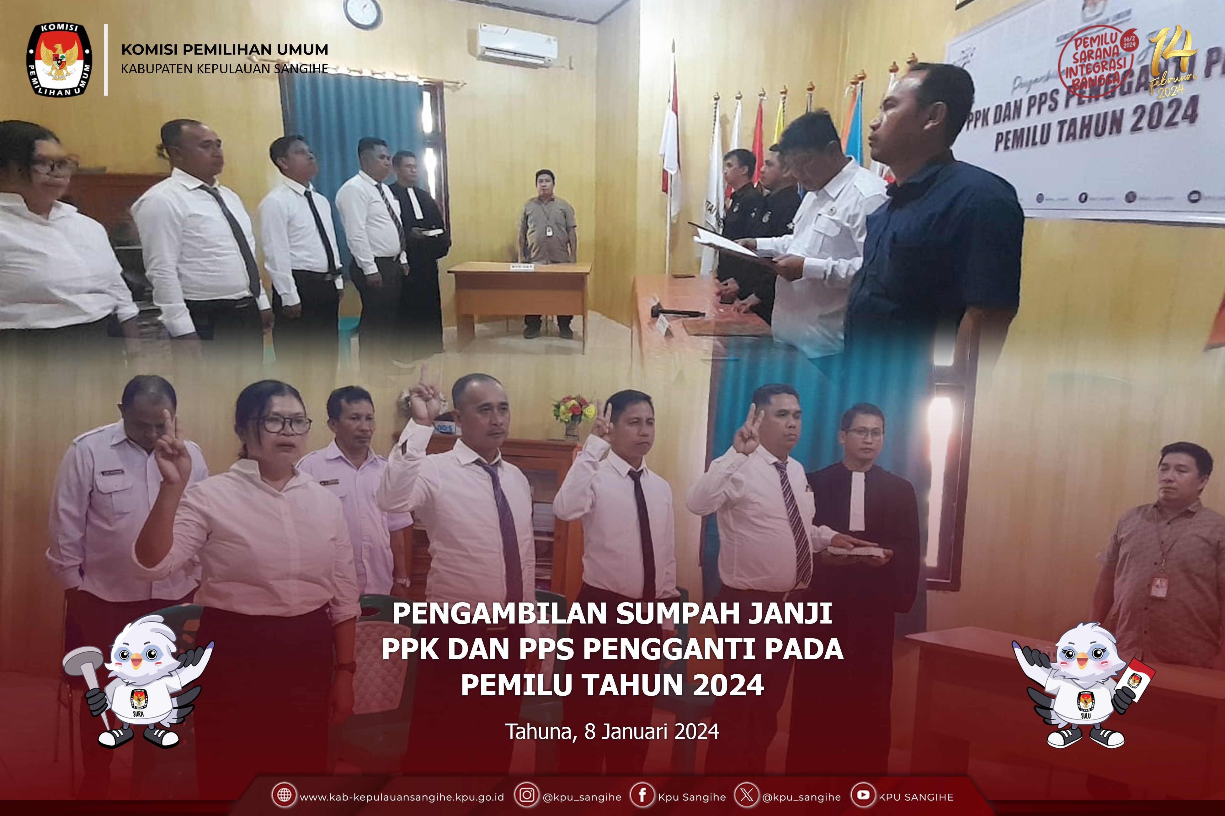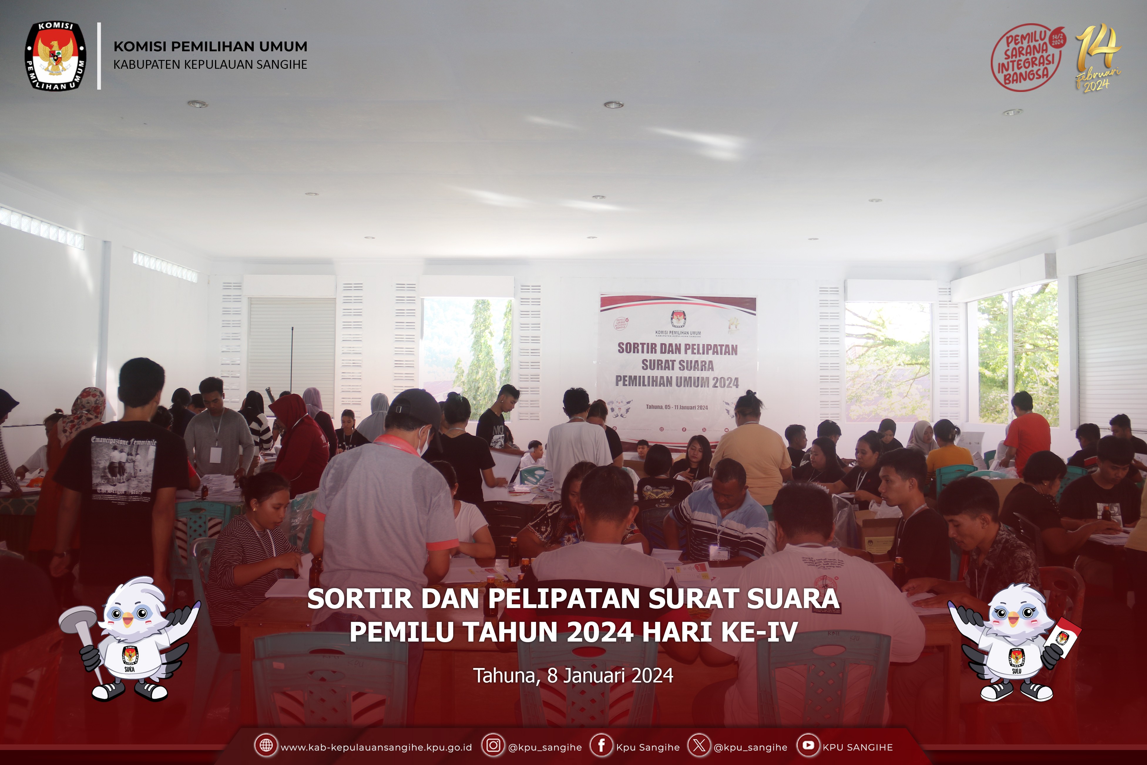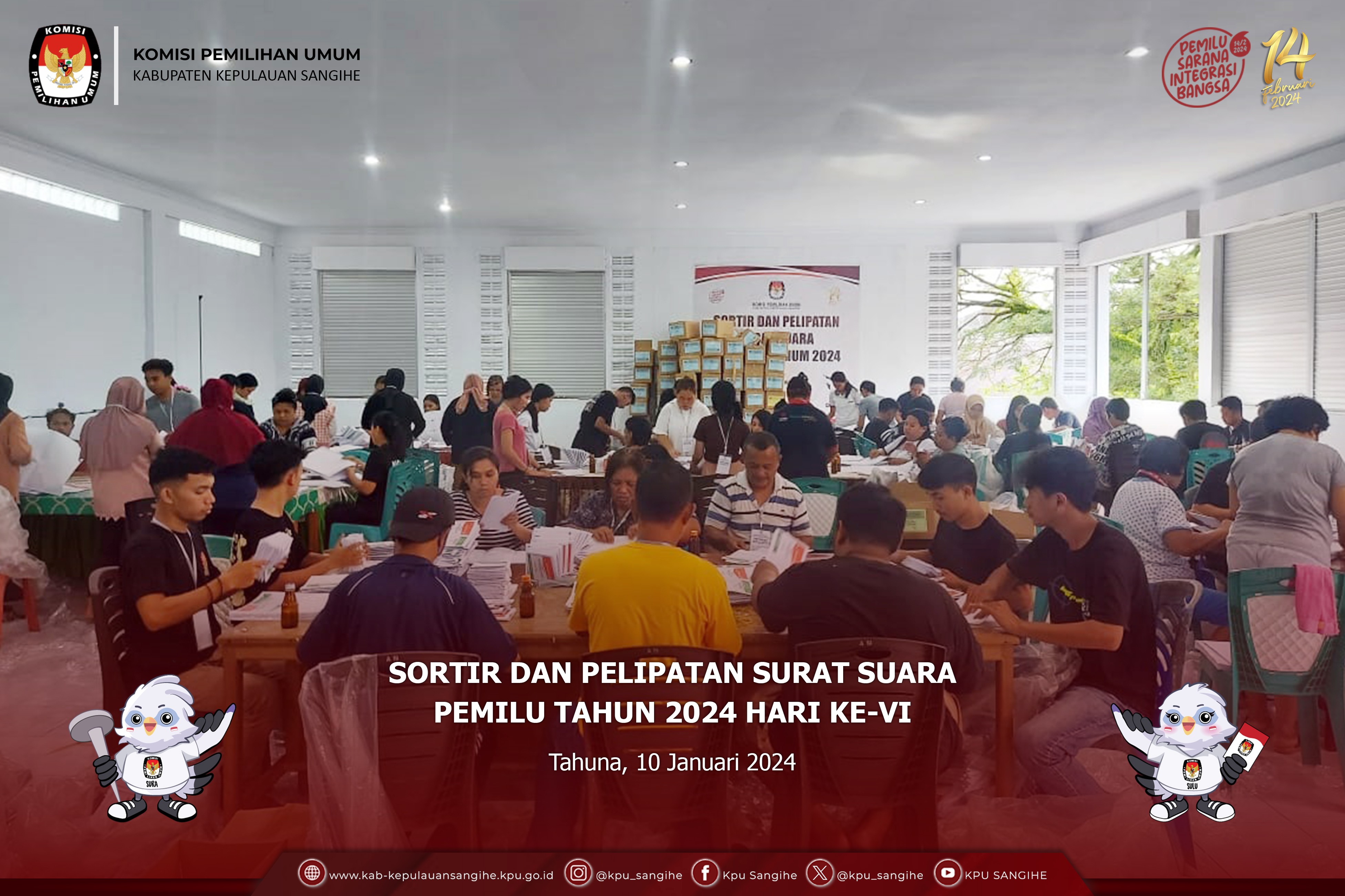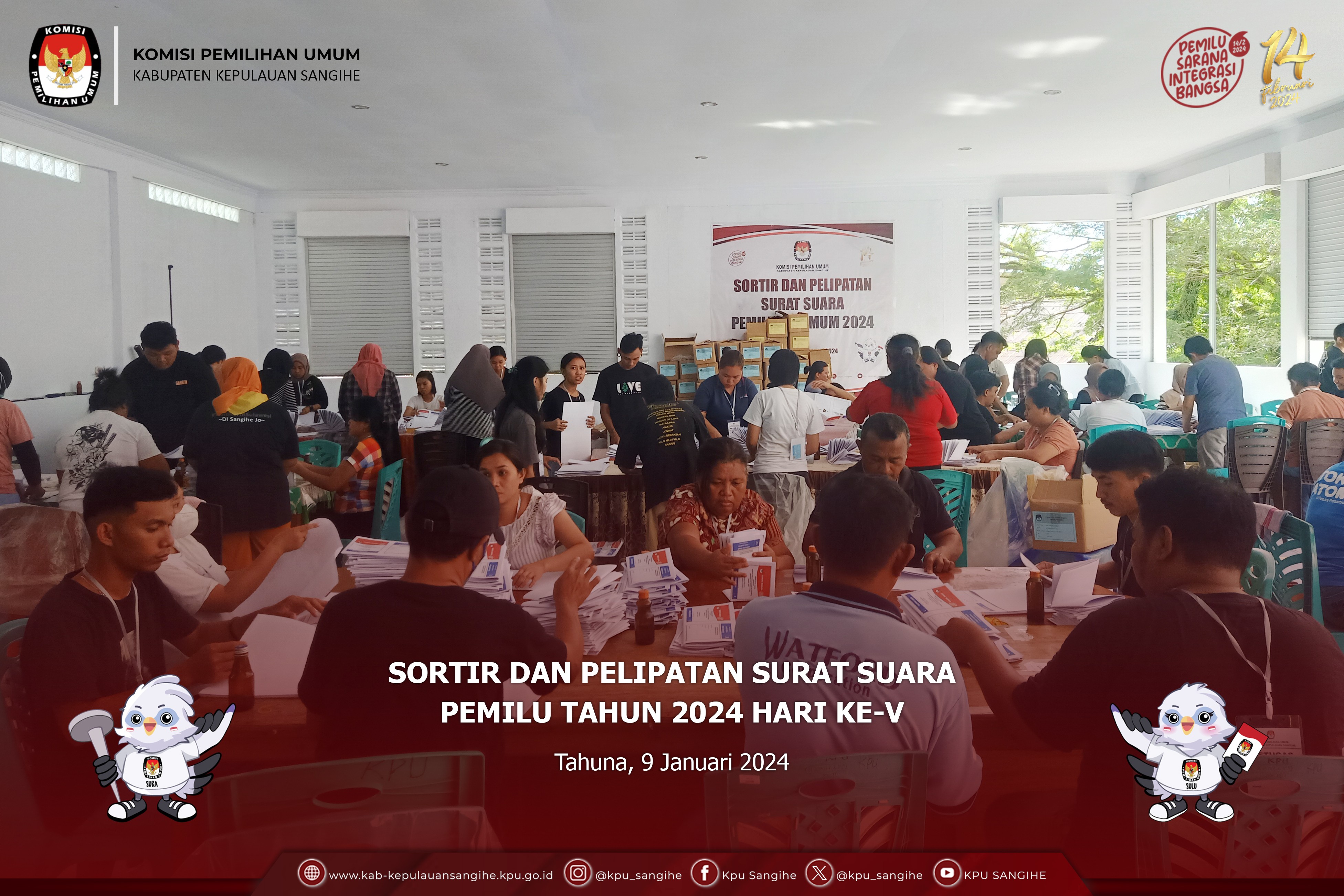 Tahuna, kab-kepulauansangihe.kpu.go.id - Hasil Sortir dan Pelipatan Surat Suara Pemilu Tahun 2024 Hari ke-V. Selasa (9/1/2024). Bertempat di Aula lt. 2 KPU Sangihe telah melaksanakan Sortir dan Pelipatan Surat Suara Pemilu Tahun 2024 Hari ke-III pada pukul 09.00 Wita s.d. 17.00 Wita. Sortir dan Pelipatan Surat Suara dilakukan oleh 50 Orang Petugas Sortir dan Pelipatan Surat Suara yang terdiri dari beberapa elemen masyarakat. Sebelumnya Petugas Sortir dan Pelipat tambahan dilakukan pengecekan terlebih dahulu pada SIPOL melalui https://infopemilu.kpu.go.id/ untuk mengecek apakah yang bersangkutan masuk dalam kepengurusan/keanggotaan Partai Politik atau tidak dan melakukan pengecekan pada https://cekdptonline.kpu.go.id/ untuk melakukan pengecekan apakah yang bersangkutan sudah terdaftar dalam Daftar Pemilih Tetap (DPT). Jenis Surat Suara yang di Sortir dan di Lipat yaitu Surat Suara DPRD Provinsi Sulut. Adapun hasil dari Penyortiran dan Pelipatan Surat Suara yaitu : - Jumlah Surat Suara yang telah di Sortir dan di Lipat (81.142) Lembar; - Jumlah Surat Suara Rusak (53) Lembar. Seluruh Proses Sortir dan Pelipatan Surat Suara diawasi langsung oleh Pihak Kepolisian Resor Kepulauan Sangihe dan Bawaslu Kabupaten Kepulauan Sangihe.