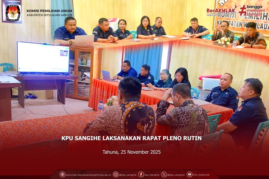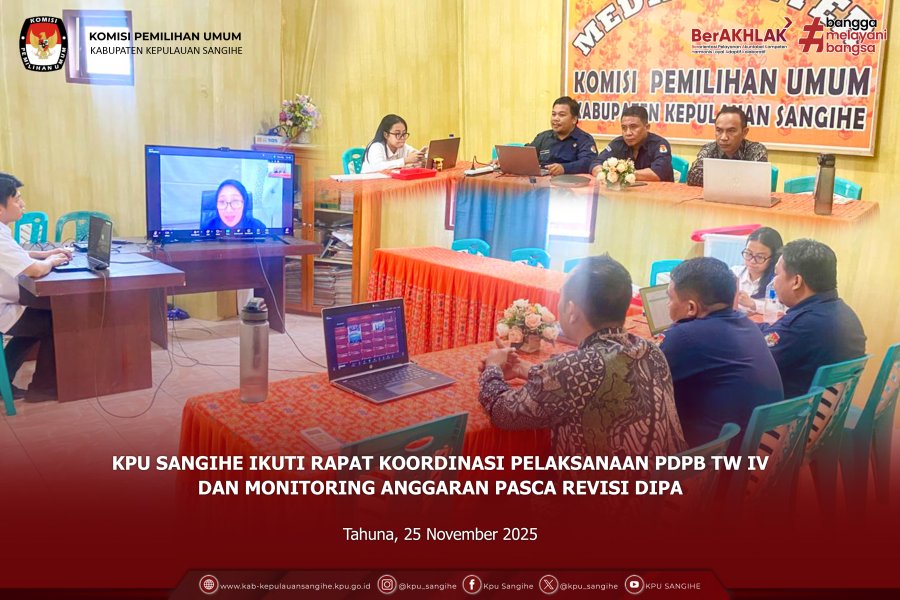 Tahuna, kab-kepulauansangihe.kpu.go.id — Komisi Pemilihan Umum (KPU) Kabupaten Kepulauan Sangihe mengikuti Rapat Penyusunan Penilaian Indeks Pengendalian Keuangan (PIPK) Tahun 2025 yang diselenggarakan oleh KPU Republik Indonesia secara daring pada Rabu, 26 November 2025. Kegiatan ini dilaksanakan sebagai tindak lanjut atas Surat Sekretaris Jenderal Nomor 2692/KU.03.3-SD/02/2025 tanggal 7 Agustus 2025 perihal Pelaksanaan PIPK untuk mendukung proses Penyusunan Laporan Keuangan (LK) Tahun 2025 Unaudited. Melalui rapat tersebut, KPU RI menegaskan pentingnya penyusunan Laporan PIPK tingkat Lembaga (Konsolidasi) yang akan dihimpun dari laporan PIPK wilayah pada 38 (tiga puluh delapan) Provinsi untuk Tahun 2025. Dari KPU Sangihe, kegiatan ini diikuti secara daring dari Ruang Rapat KPU Sangihe, dengan hadirnya Kepala Sub Bagian Keuangan, Umum dan Logistik, beserta staf Subbagian terkait. Kehadiran peserta dari KPU Sangihe menjadi bagian dari komitmen dalam memastikan pelaksanaan pengendalian internal dan akuntabilitas pengelolaan keuangan berjalan sesuai ketentuan. Melalui kegiatan ini, KPU Sangihe berharap penyusunan PIPK Tahun 2025 dapat terlaksana secara tepat waktu, akurat, dan selaras dengan standar yang ditetapkan KPU RI, sehingga mendukung penyusunan laporan keuangan lembaga yang berkualitas dan dapat dipertanggungjawabkan.