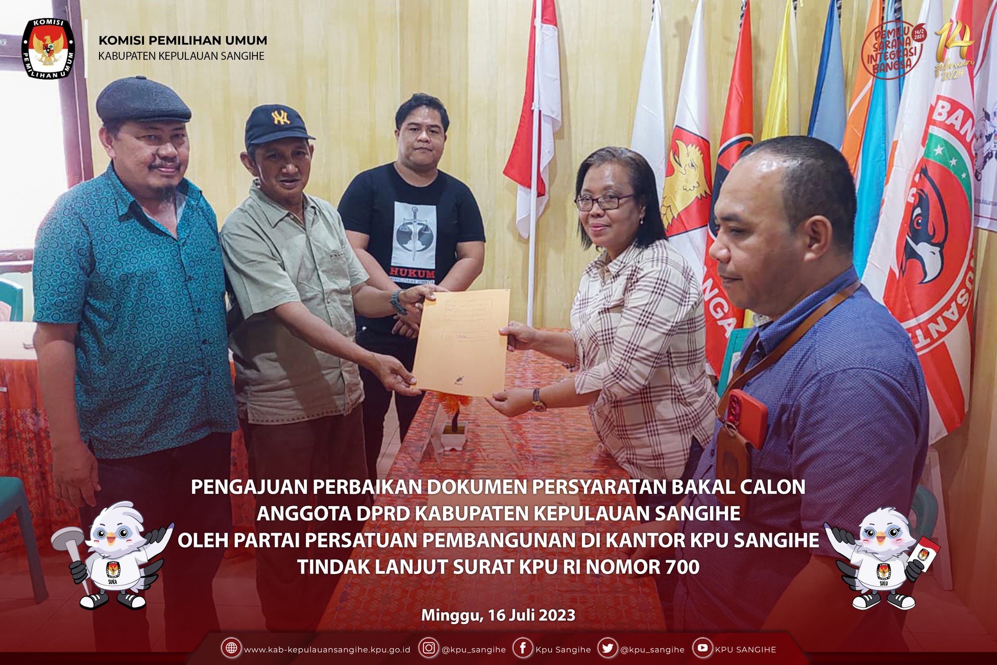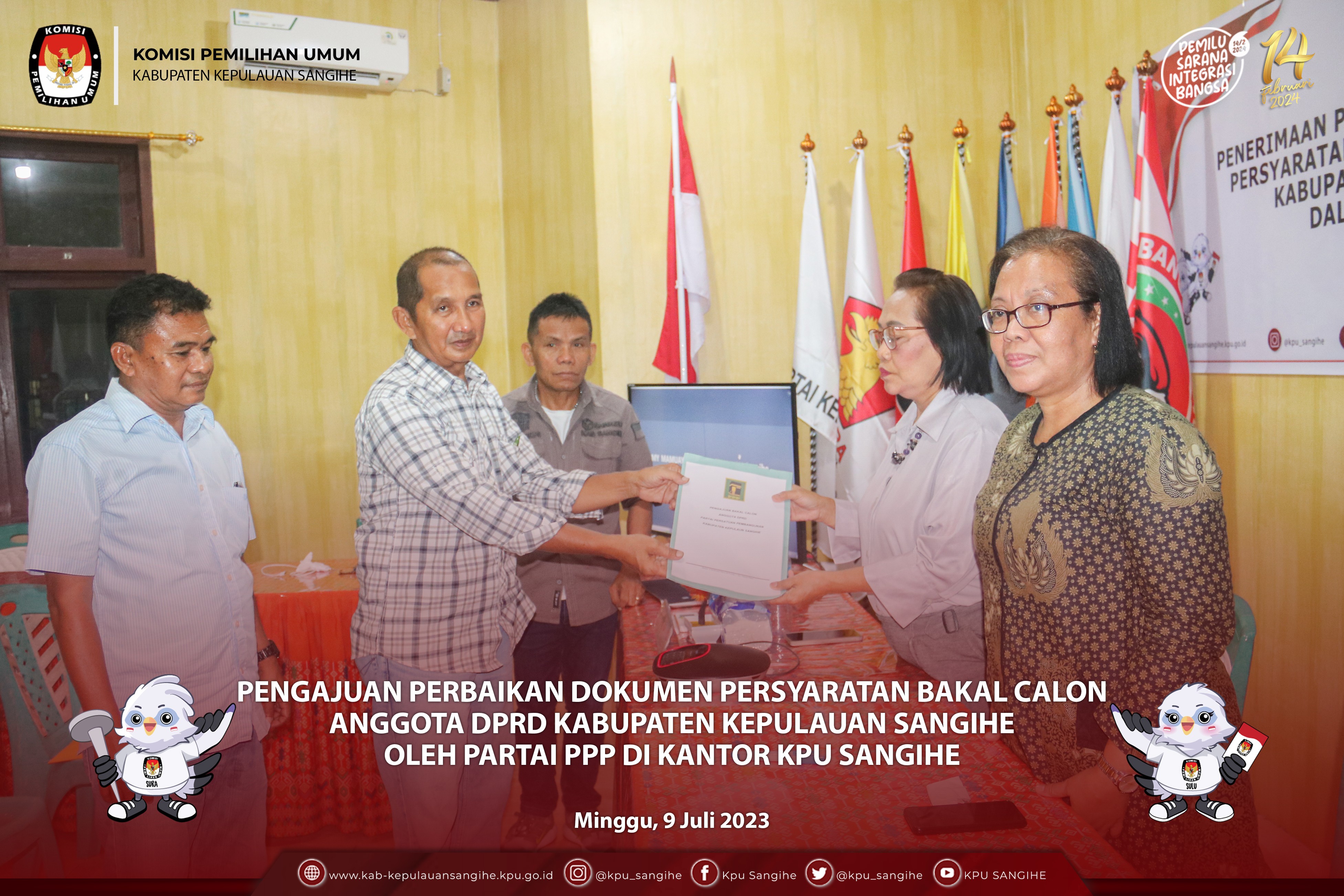 #TemanPemilih, Partai Persatuan Pembangunan mengajukan Perbaikan Dokumen Persyaratan Bakal Calon Anggota DPRD Kabupaten Kepulauan Sangihe untuk Pemilu Tahun 2024 di Kantor KPU Sangihe. Minggu (9/7/2023). Pengajuan dilakukan oleh LO dan Pengurus Parpol pada pukul 23.50 WITA.