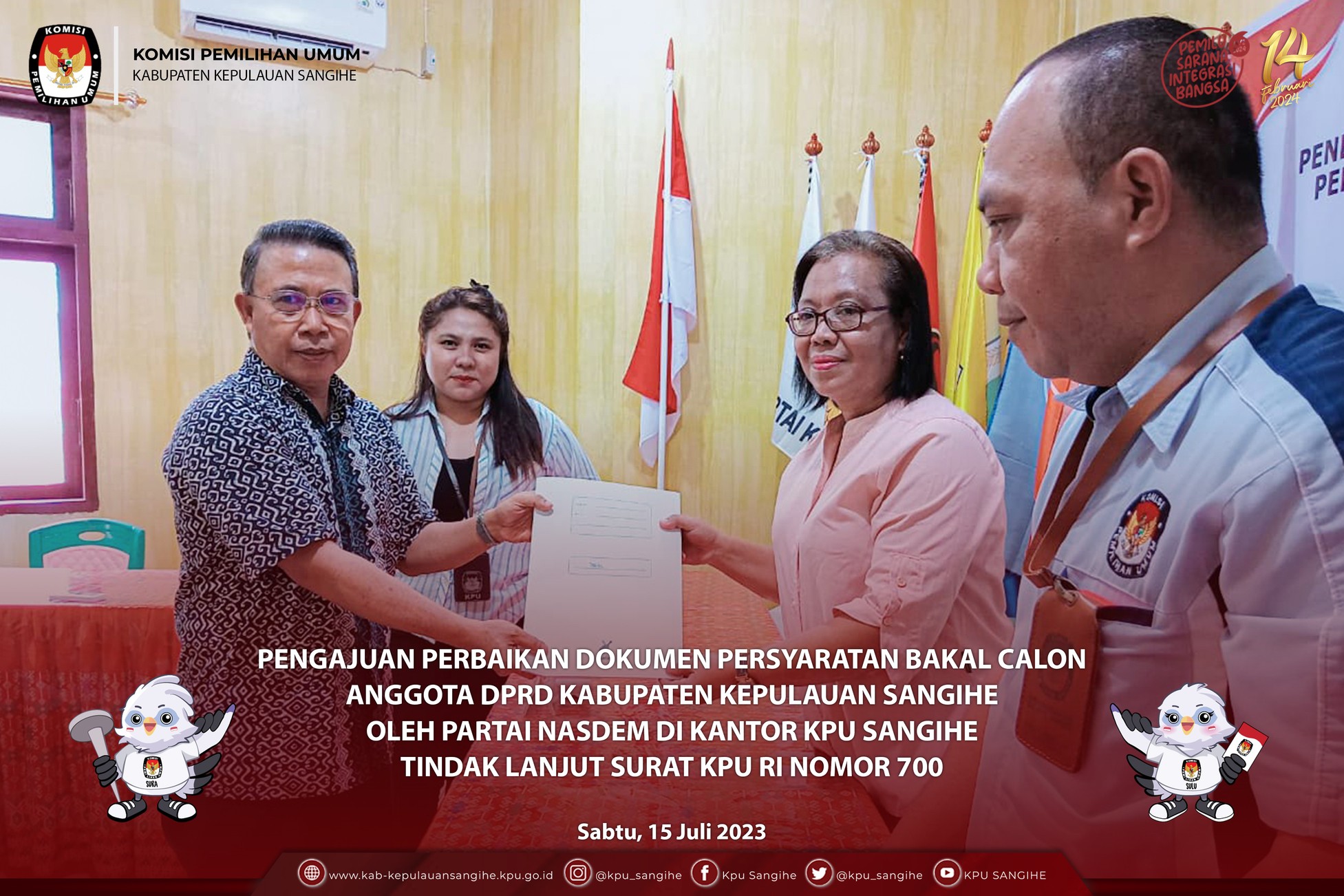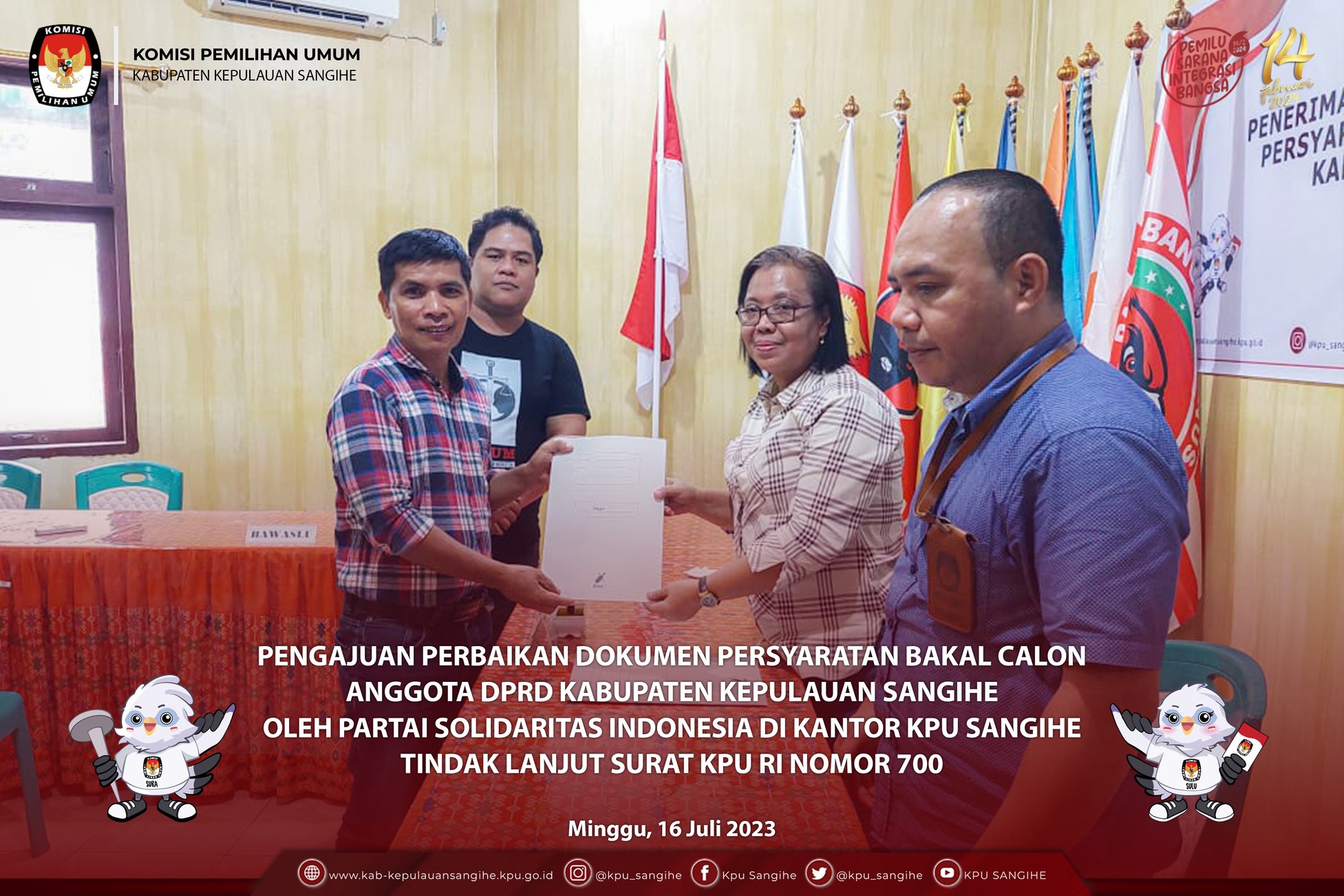 Delegasi partai diterima oleh 4 Komisioner KPU Sangihe serta disaksikan oleh Bawaslu Kabupaten Kepulauan Sangihe, di Ruang Rapat KPU Sangihe.