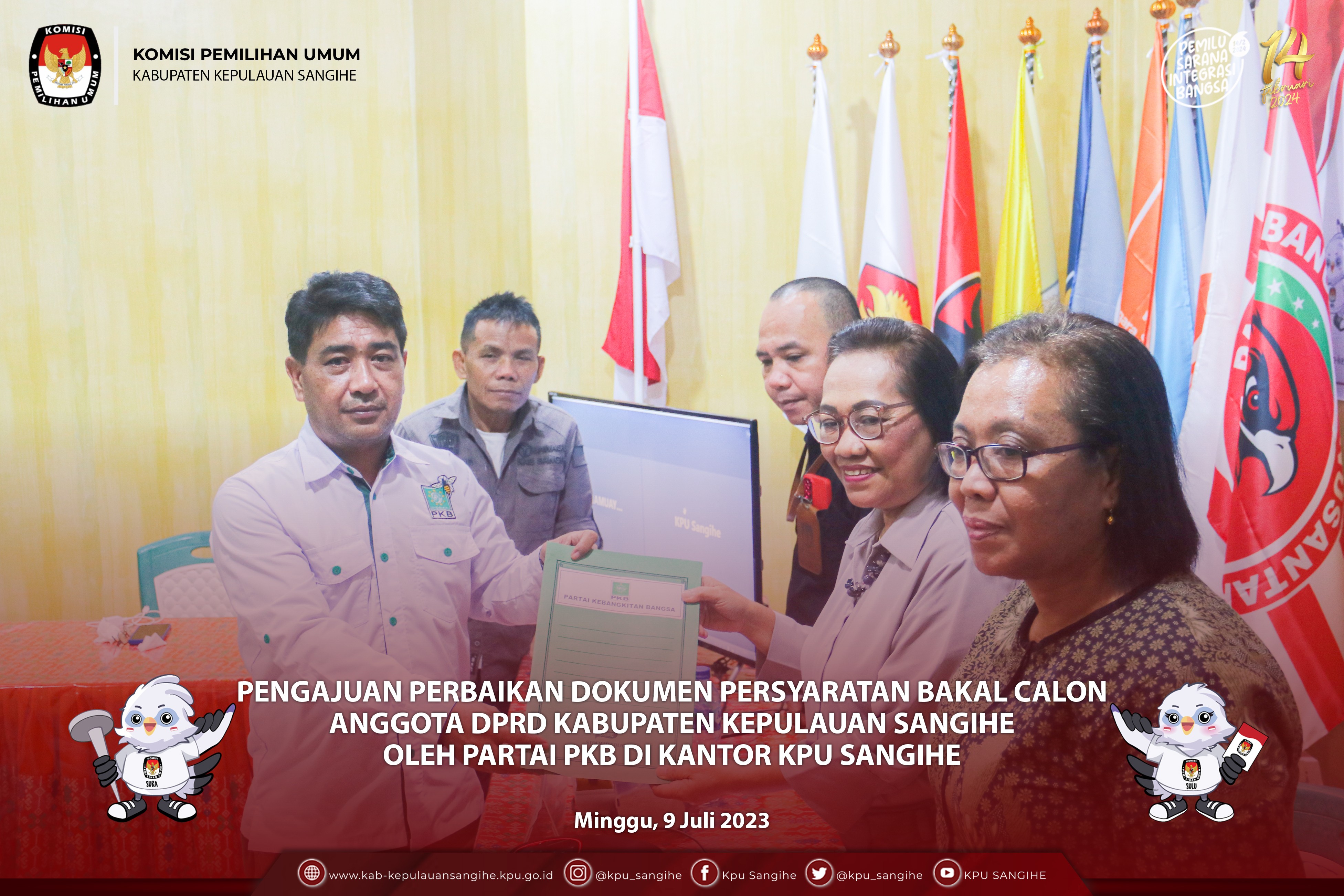 #TemanPemilih, Partai Kebangkitan Bangsa mengajukan Perbaikan Dokumen Persyaratan Bakal Calon Anggota DPRD Kabupaten Kepulauan Sangihe untuk Pemilu Tahun 2024 di Kantor KPU Sangihe. Minggu (9/7/2023). Pengajuan dilakukan oleh Ketua, LO dan Operator Parpol pada pukul 21.06 WITA.