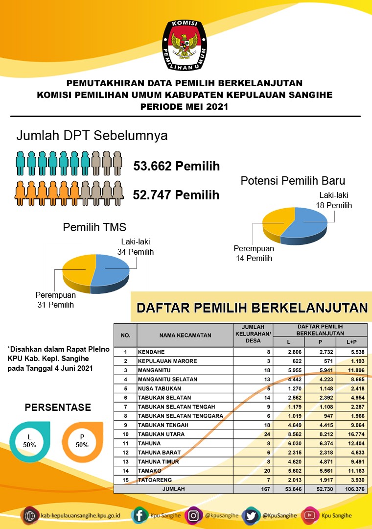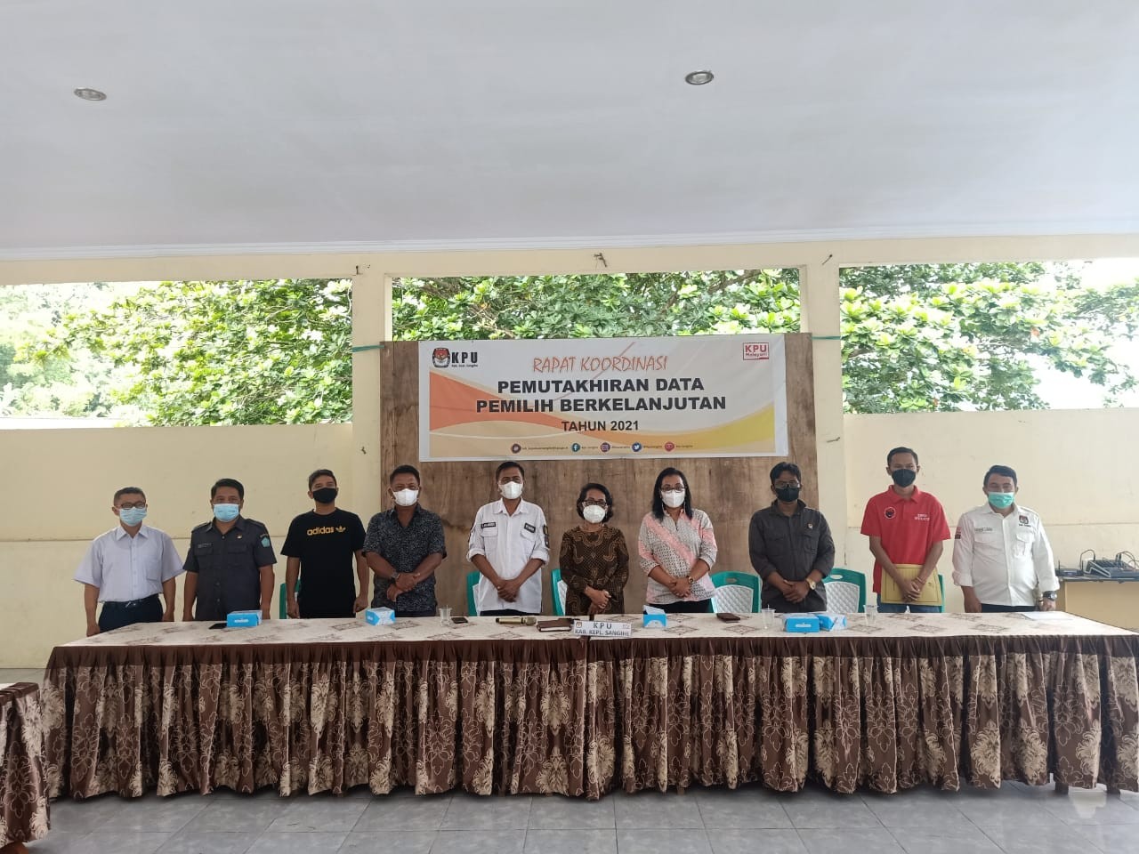 Pada hari ini Jumat, Tanggal Empat, Bulan Juni, tahun Dua Ribu Dua Puluh Satu, bertempat di Aula KPU Kabupaten Kepulauan Sangihe pukul 16.30 Wita, KPU Kabupaten Kepulauan Kabupaten Kepulauan Sangihe, melaksanakan Rapat Koordinasi Daftar Pemilih Berkelanjutan Tahun 2021 di tingkat Kabupaten/Kota, Rapat Koordinasi dihadiri oleh instansi sebagai berikut : 1. Bawaslu Kabupaten Kepulauan Sangihe 2. Pimpinan Partai Politik Kabupaten Kepulauan Sangihe Berdasarakan ketentuan Surat Edaran Plt. Ketua KPU RI Nomor :132/PL.02-SD/01/KPU/II/2021 tanggal 04 Februari 2021 sebagaimana diubah dengan Surat Edaran Ketua KPU RI Nomor : 366/PL.02-SD/01/KPU/IV/2021 Tanggal 21 April 2021 Perihal Pemutakhiran Data Pemilih Berkelanjutan Tahun 2021, hasil rapat Koordinasi yang dilakukan oleh Komisi Pemilihan Umum Kabupaten Kepulauan Sangihe Menghasilkan hal Sebagai Berikut : Rekapitulasi Pemutakhiran Data Pemilih Berkelanjutan dengan Jumlah sebanyak Seratus enam ribu tiga ratus tujuh puluh enam (106.376) dengan rincian Pemilih Laki-Laki berjumlah lima puluh tiga ribu enam ratus empat puluh enam (53. 646) dan Pemilih Perempuan berjumlah lima puluh dua ribu tujuh ratus tigah puluh (52.730) Pemilih.
