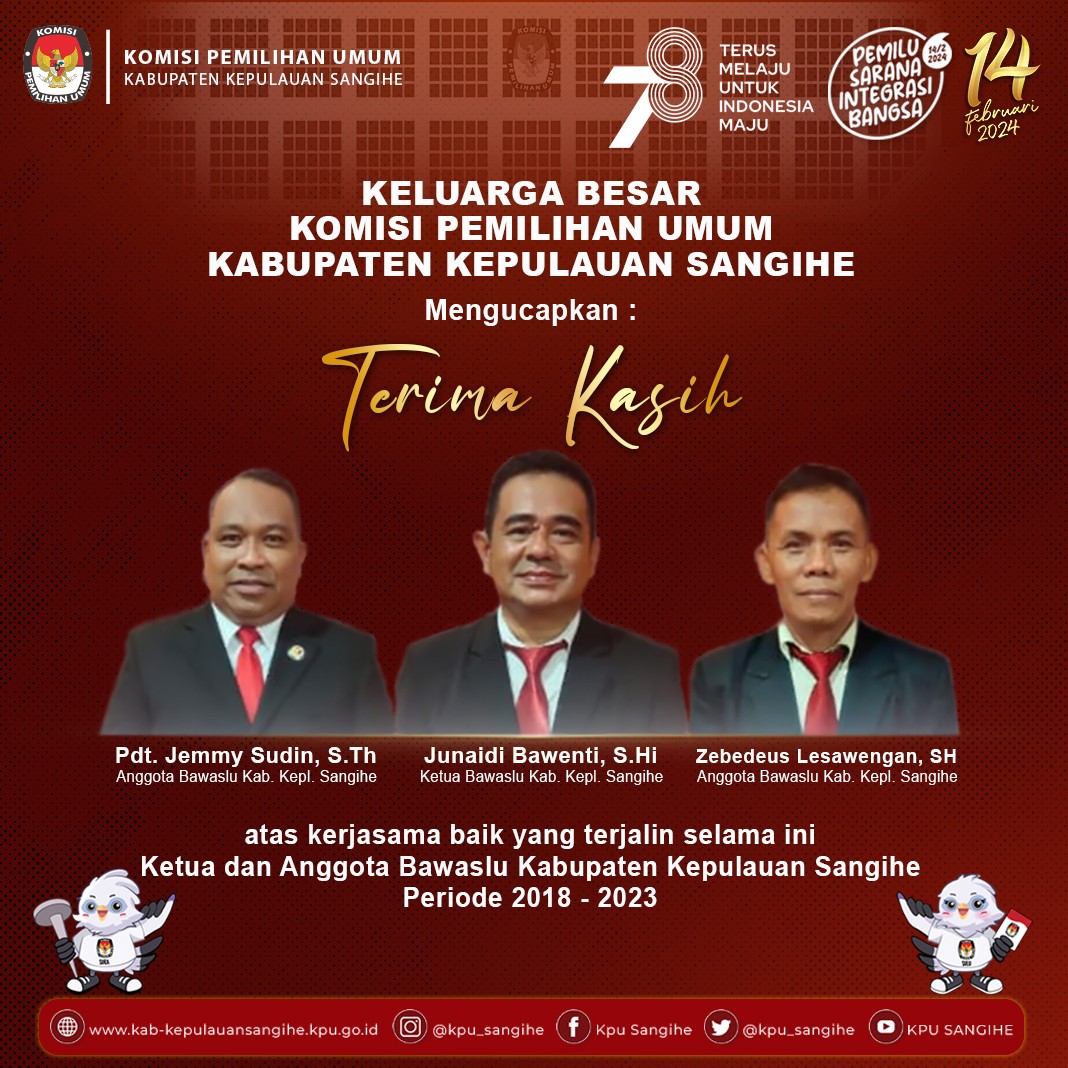 #TemanPemilih, Keluarga besar KPU Sangihe mengucapkan Terima Kasih kepada Anggota Bawaslu Kabupaten Kepulauan Sangihe Periode 2018-2023 atas kerjasama baik yang terjalin selama menjabat.