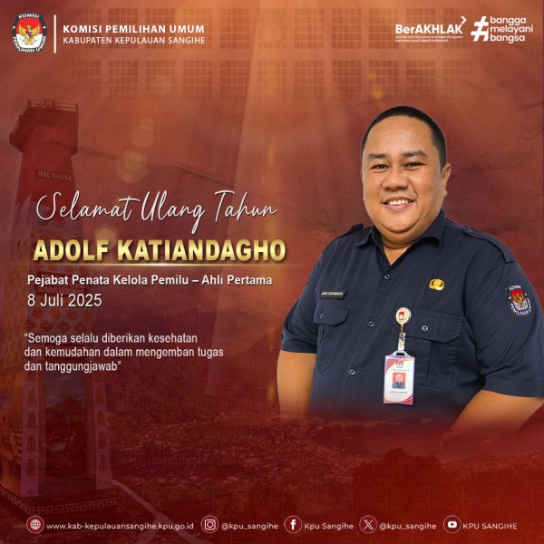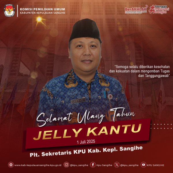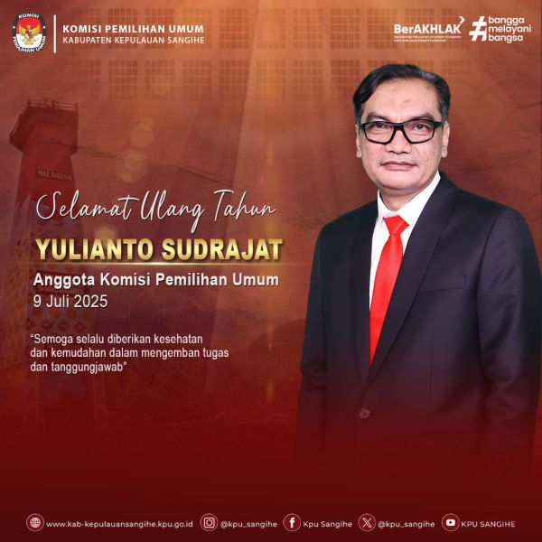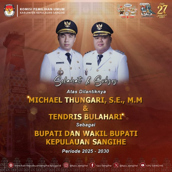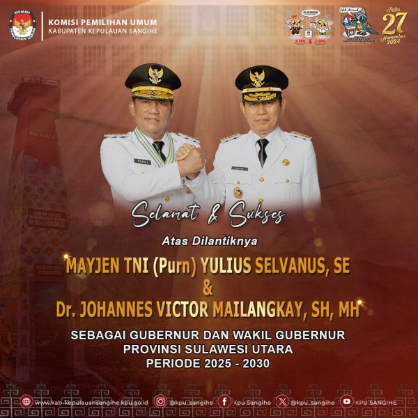 segenap jajaran KPU Sangihe mengucapkan selamat dan sukses atas pelantikan Mayjen TNI (Purn.) Yulius Selvanus, SE, dan Dr. Johannes Victor Mailangkay, SH, MH sebagai Gubernur dan Wakil Gubernur Terpilih Provinsi Sulawesi Utara Periode 2025-2030.